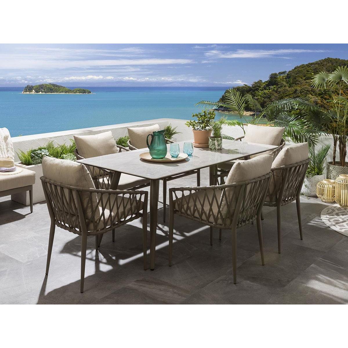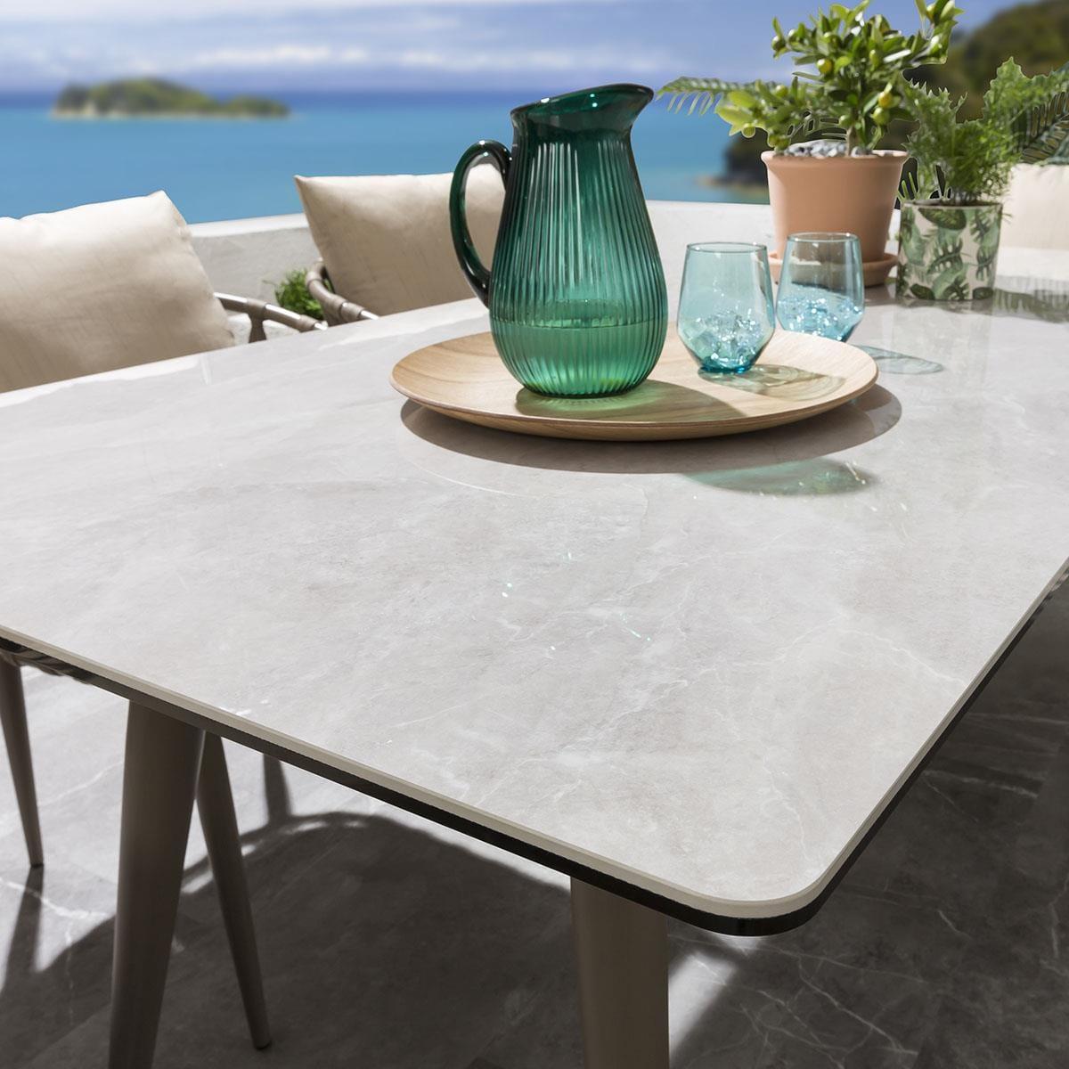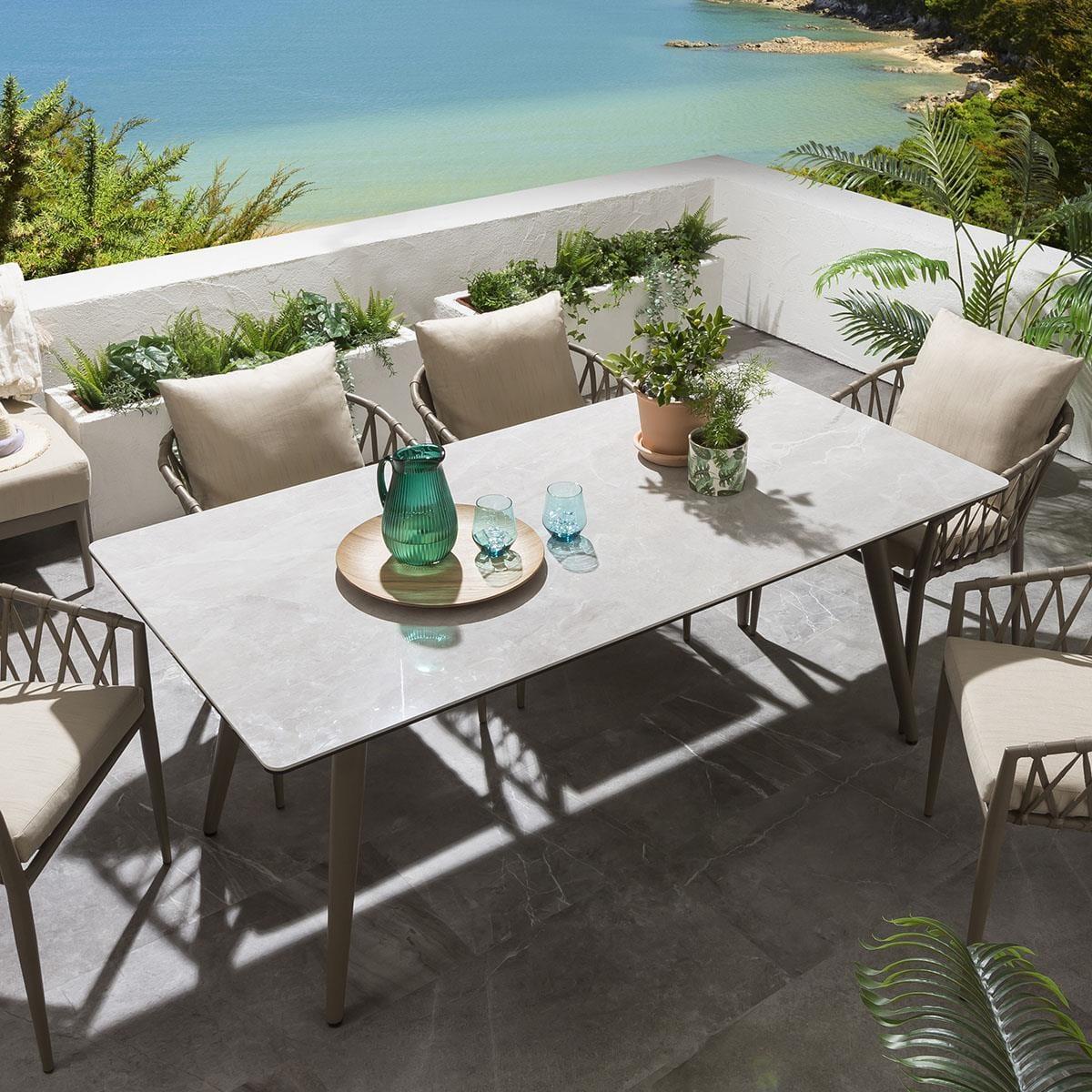 Our hard-wearing and spacious ceramic 180cm rectangular garden dining table makes a perfect addition to any contemporary, modern or minimalist outdoors, providing enough space for up to six people to enjoy dining in comfort. Made from robust and ultra-durable ceramic in a natural smooth light grey marble-effect finish, atop a hard-wearing beige aluminium metal frame - which are set to last for years to come. Included in the set are these fabulous all-weather beige rope-back garden dining chairs. The generously padded outdoor chairs are enhanced by a supportive back cushion for an extra layer of luxurious comfort. Our gorgeous rope back garden chairs will make a stunning addition to your outdoor seating area or patio. The garden chairs come complete with our signature luxuriously thick cushioning that offers unbeatable comfort, topped off with rich Beige high-end marine fabric which has amazing resilience to colour fading and damage caused by extreme weather conditions and comes with a free protective winter cover. Expertly crafted aluminium frames are highly durable, complemented by clean lines that lend contemporary style. It is robust and weather-resistant for outdoor use & the super cushioned seating offers comfortable support that's shower-resistant, but we advise that cushions are stored when not in use.. W180cm D90cm H73cm 6 Seater Garden Dining Set Free beige protective cover included
