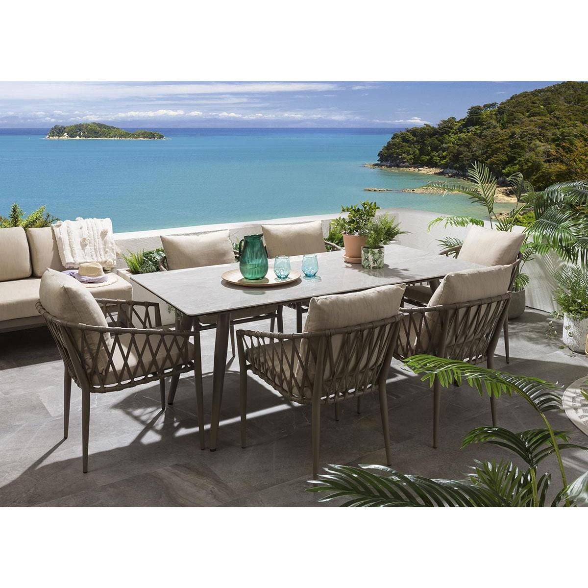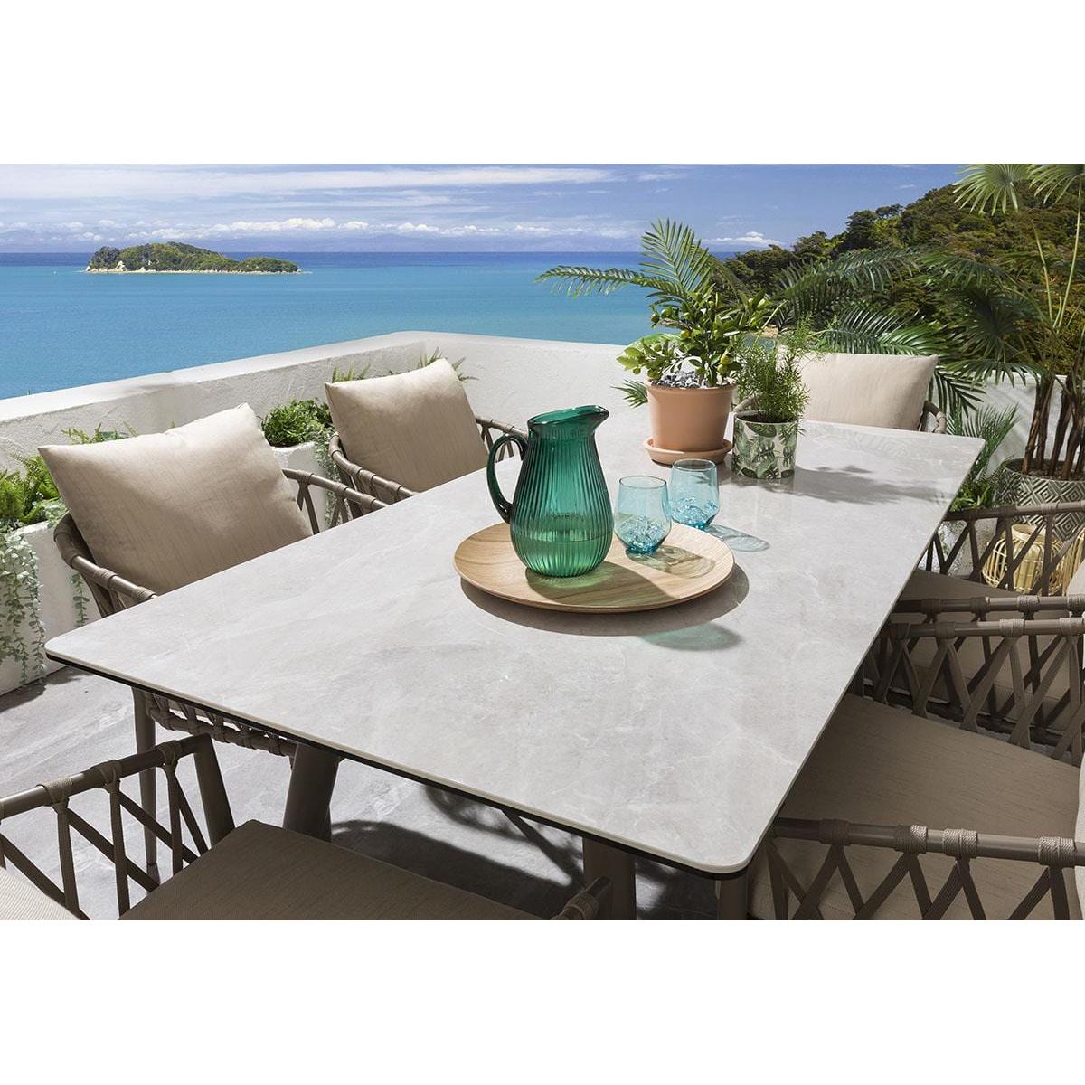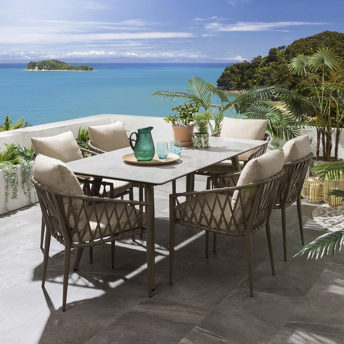 Our hard-wearing and spacious ceramic 180cm rectangular garden dining table makes a perfect addition to any contemporary, modern or minimalist outdoors, providing enough space for up to six people to enjoy dining in comfort. Made from robust and ultra-durable ceramic in a natural smooth light grey marble-effect finish, atop a hard-wearing beige aluminium metal frame - which are set to last for years to come. Included in the set are these fabulous all-weather beige rope-back garden dining chairs. The generously padded outdoor chairs are enhanced by a supportive back cushion for an extra layer of luxurious comfort. Our gorgeous rope back garden chairs will make a stunning addition to your outdoor seating area or patio. The garden chairs come complete with our signature luxuriously thick cushioning that offers unbeatable comfort, topped off with rich Beige high-end marine fabric which has amazing resilience to colour fading and damage caused by extreme weather conditions and comes with a free protective winter cover. Expertly crafted aluminium frames are highly durable, complemented by clean lines that lend contemporary style. It is robust and weather-resistant for outdoor use & the super cushioned seating offers comfortable support that's shower-resistant, but we advise that cushions are stored when not in use.. W180cm D90cm H73cm 6 Seater Garden Dining Set Free beige protective cover included