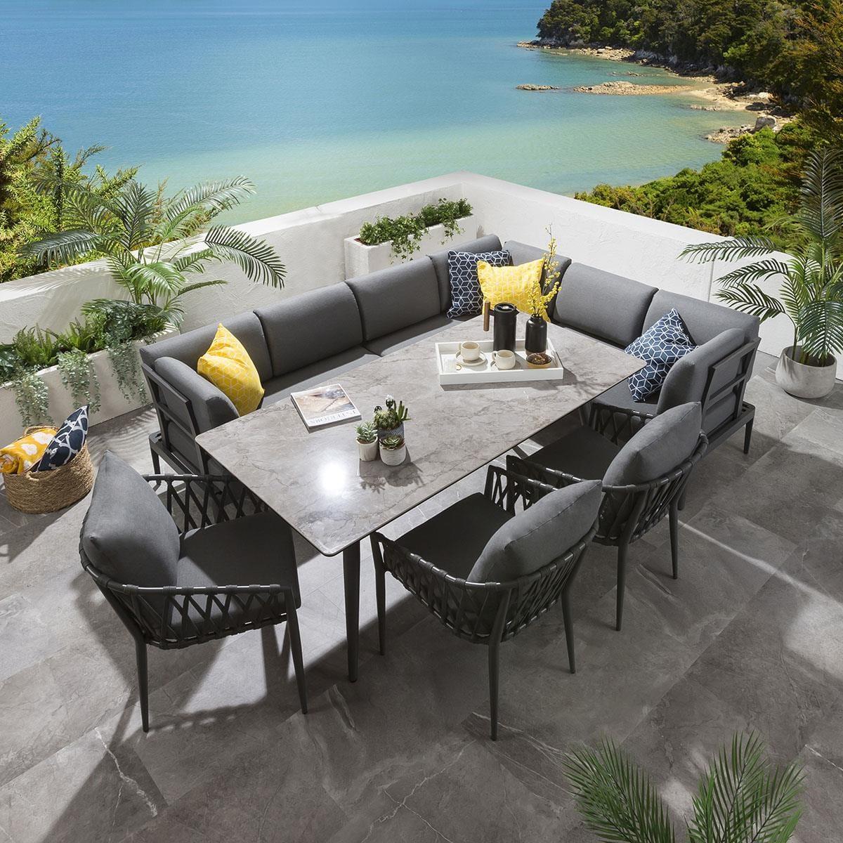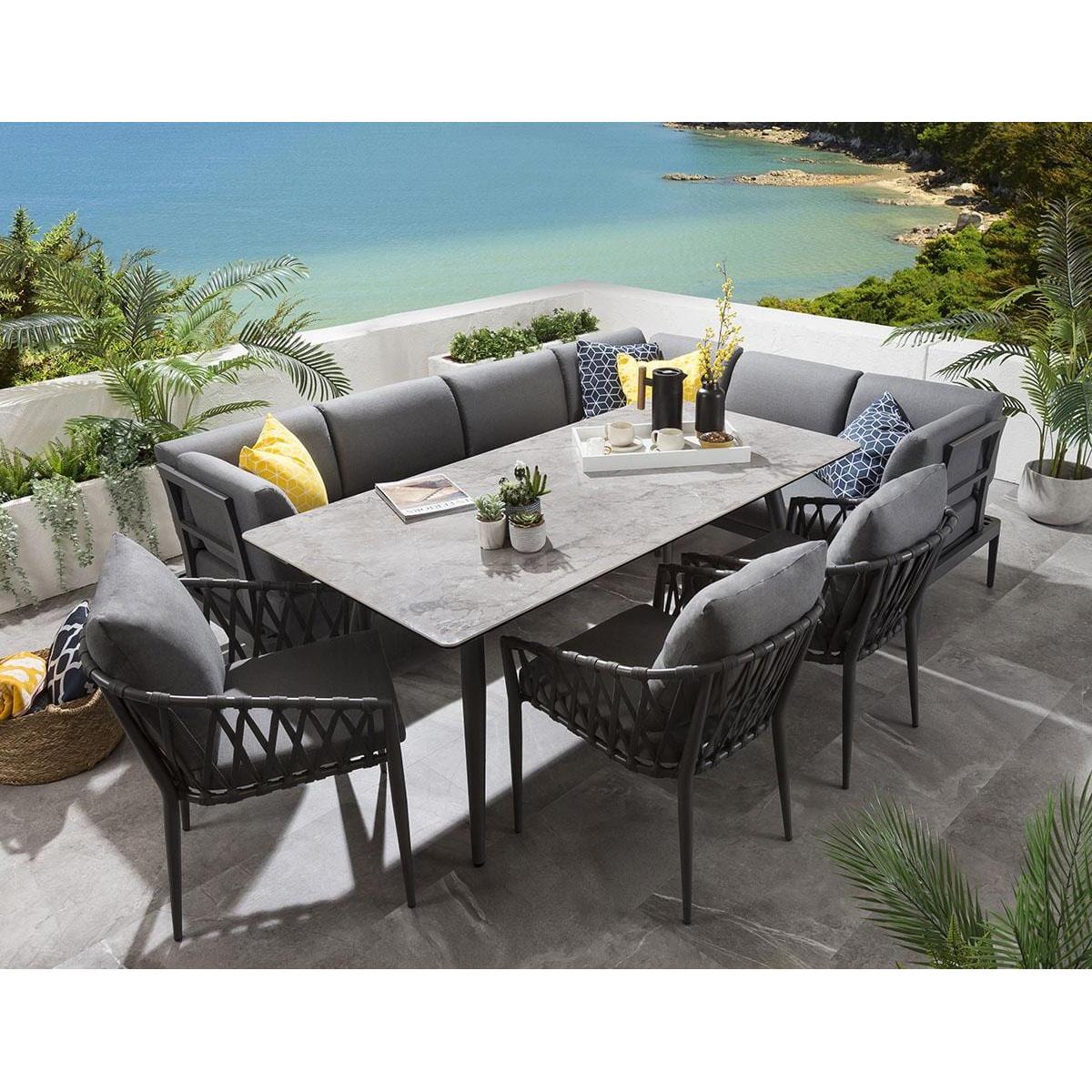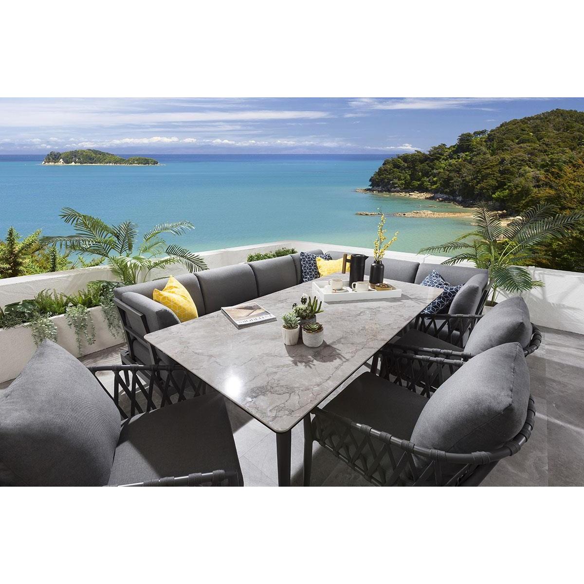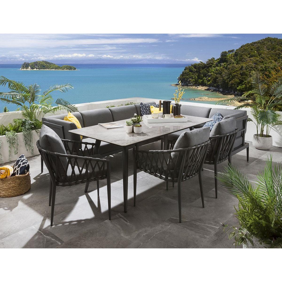 It is a socializer's dream, our Ada Garden Dining Set includes 3 modular sofa sections in grey, 3 grey luxury dining chairs and a spacious 180cm x 90cm ceramic dining table with a timeless light grey marble-effect finish table top. Whatever the occasion, you'll find it incredibly difficult to resist your outdoors with the lure of this luxurious 8 seater garden table and chairs set. The Ada Modular Garden Sofa can be configured as a corner sofa, or straight sofa, depending on your space and requirements. The small garden corner sofa and dining chairs come complete with our signature luxuriously thick cushioning that offers unbeatable comfort, topped off with rich Grey high-end marine fabric which has amazing resilience to colour fading and damage caused by extreme weather conditions and also a free winter cover. The Ada Modern Dining Bench Set includes a premium ceramic top garden table. Ceramic stone is exceptionally hard wearing, plus its heat, scratch, and fade resistant. We usually reserve this material for our designer indoor dining tables, however, it is the perfect material for outdoor tables, as it is extremely durable. Expertly crafted aluminium frames are highly durable, complemented by clean lines that lend contemporary style. It is robust and weather-resistant for outdoor use & the firm-cushioned seating offers comfortable support that's shower-resistant, but we advise that cushions are stored when not in use. W280cm D230cm H81cm Ceramic glass durable table top Seats up to 8 people - 8-Seater Grey Garden Dining Table & Chairs