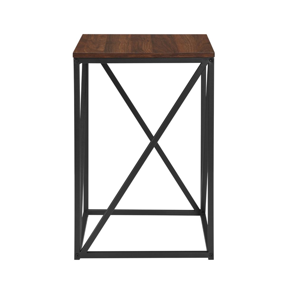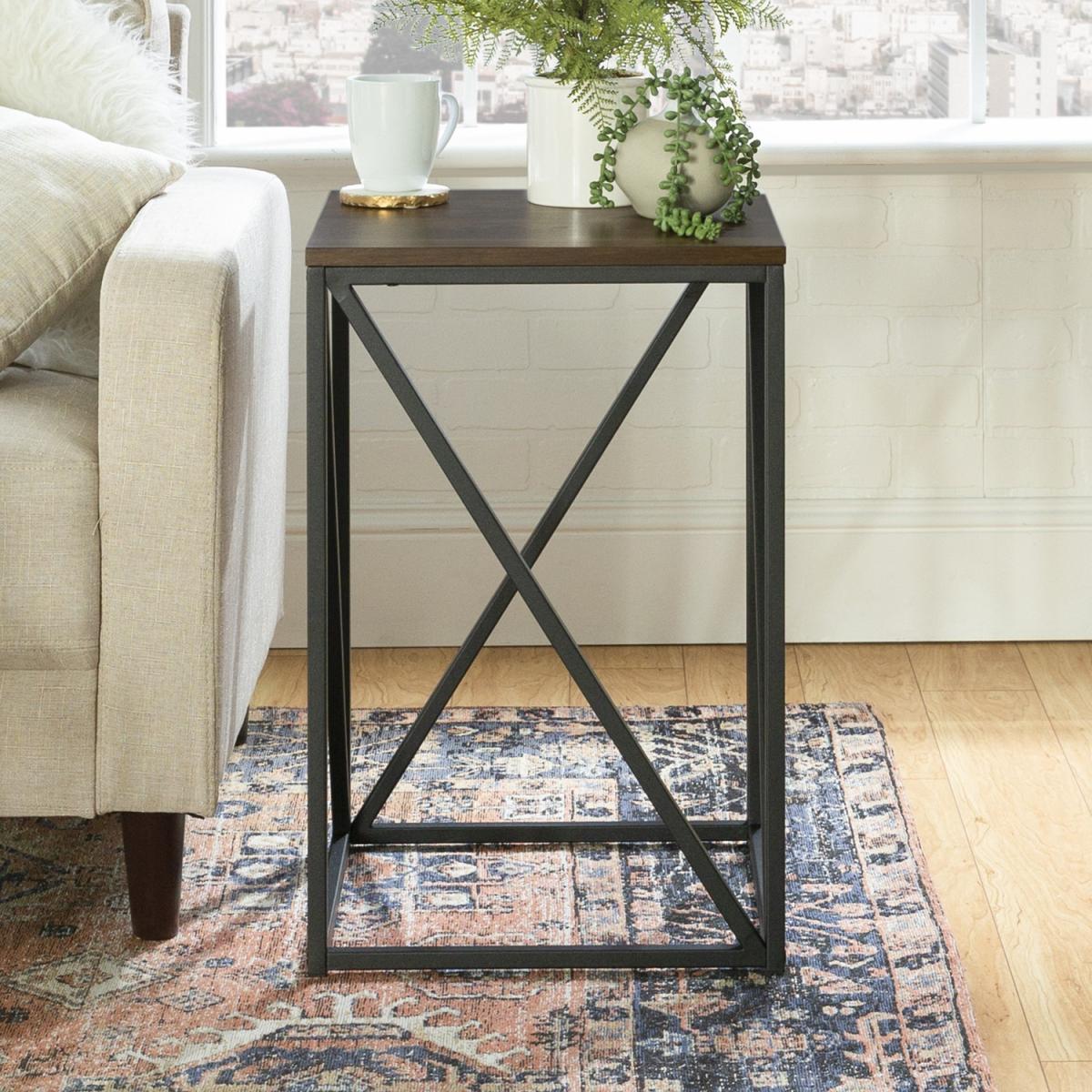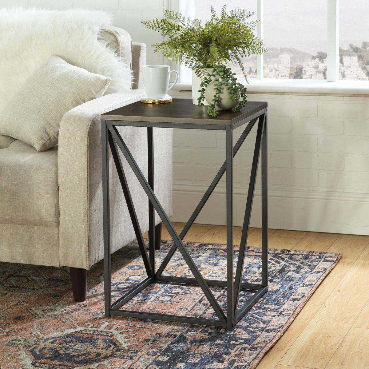 Add a stylish flair to your living room with this contemporary industrial side table. The design elevates a simple square box frame by adding geometric diagonal bars, for a modern, textural feel.
