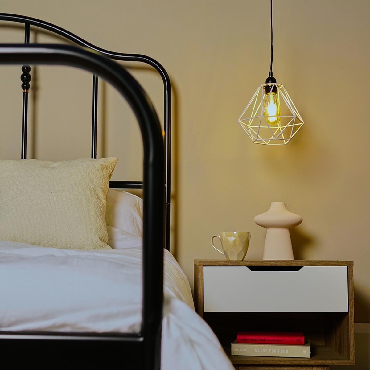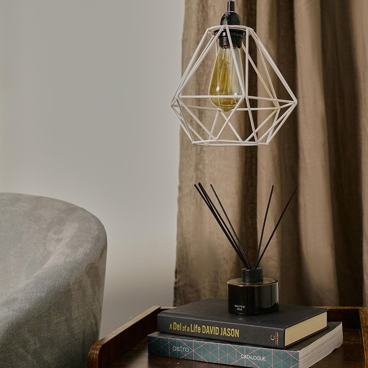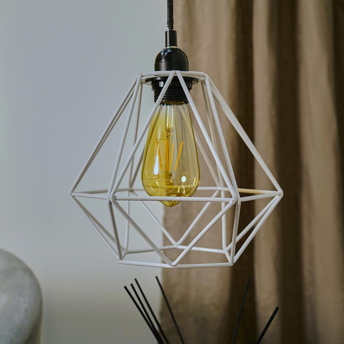 I love this modern geometric ceiling pendant for its clean, understated look that effortlessly adds a contemporary edge to various interiors. Its white metal cage design makes it versatile-perfect for minimalist, Scandinavian, or industrial-inspired spaces. It pairs well with exposed bulbs for an edgy feel or can be softened with a designer filament bulb for a warmer vibe. For styling tips, consider hanging it above dining tables or in open-plan kitchens to create a striking focal point. Make sure to balance it with carefully selected furnishings and incorporate textures like wood or textiles to keep the aesthetic inviting and in harmony with your overall design scheme.