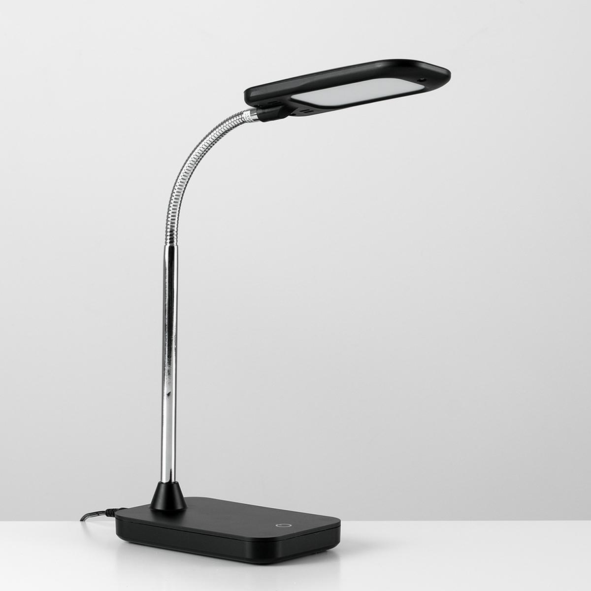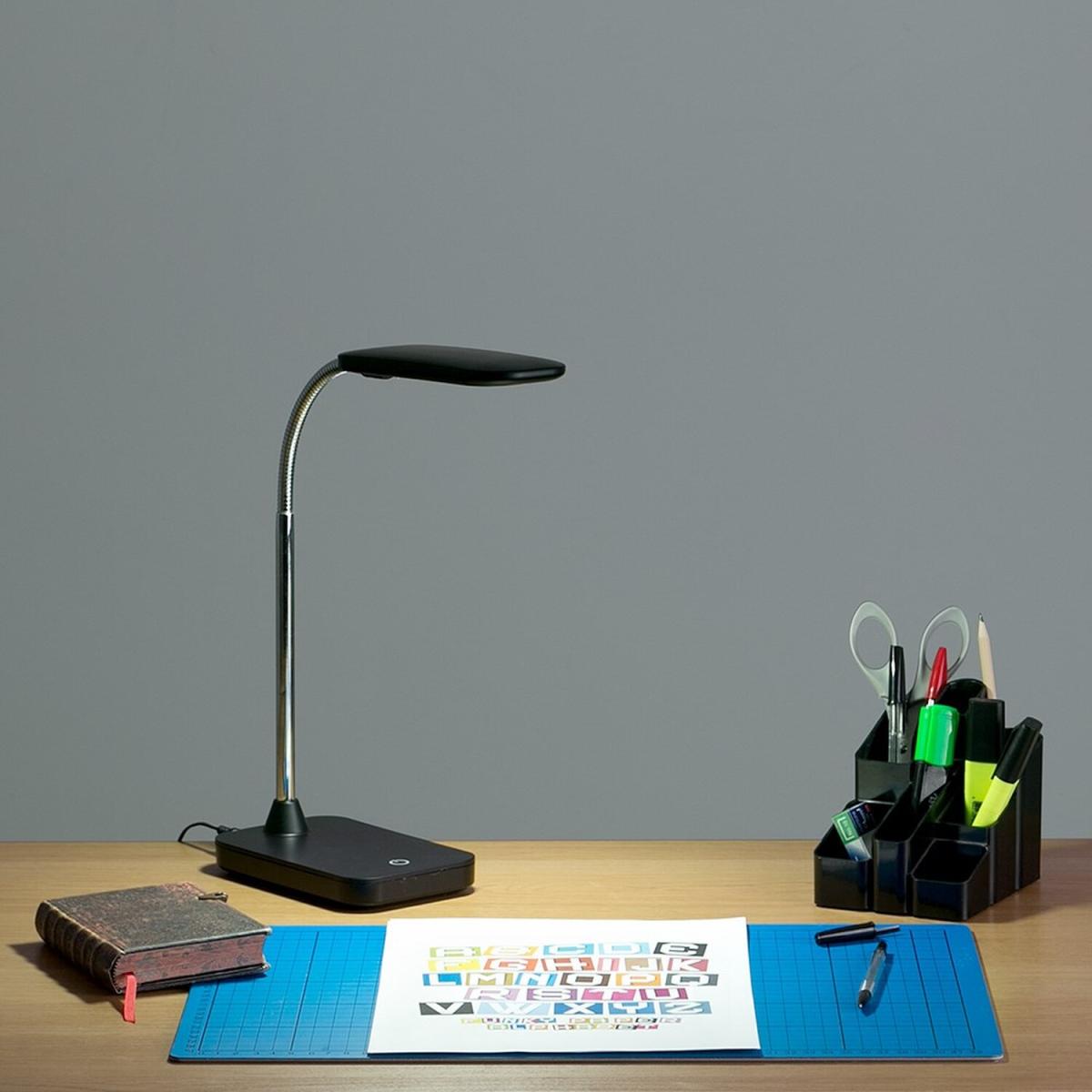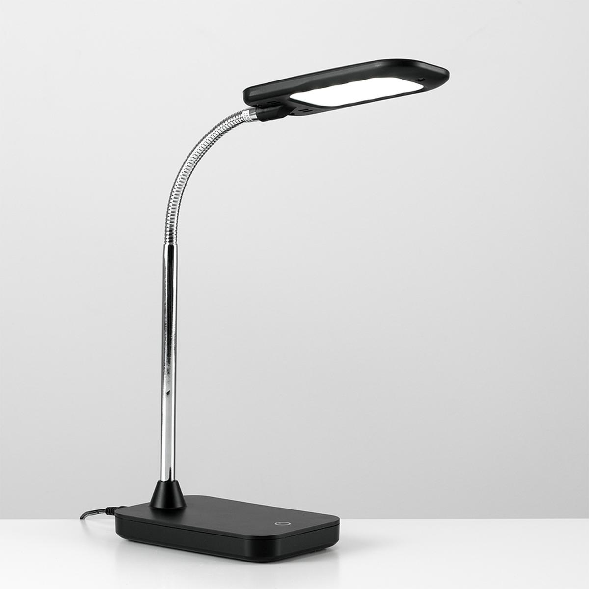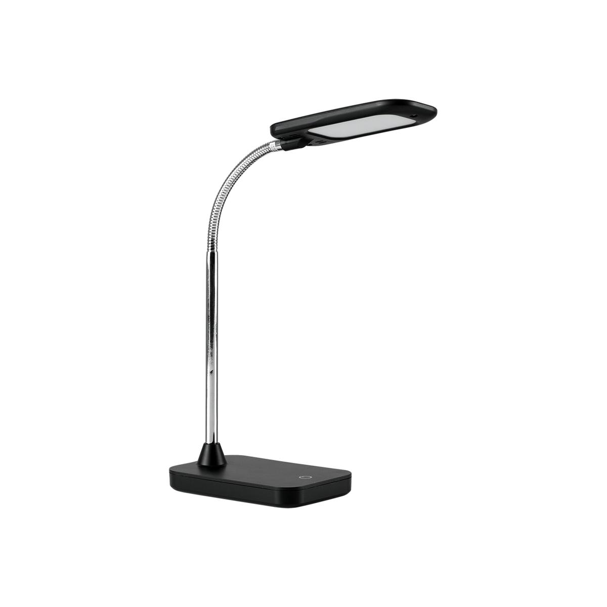 Modern sleek LED desk lamp in a gloss black finish with a polished chrome adjustable stem. They feature an integrated 5W cool white LED bulb which is great for great for homework, writing, reading, studying, hobbies, crafts and simple tasks. The fully adjustable and flexible chrome stem neck allows you to tilt and direct the light where it is required. It features a 4 stage touch dimmer Low, Medium, Bright and Off - simply touch the base of the lamp to control the light output. Stylish and contemporary, this flexible desk lamp is ideal for computer use at home or in the office, after school work or as a beside lamp for reading in bed. The sturdy weighted base enables use in any location without the fear of toppling over.