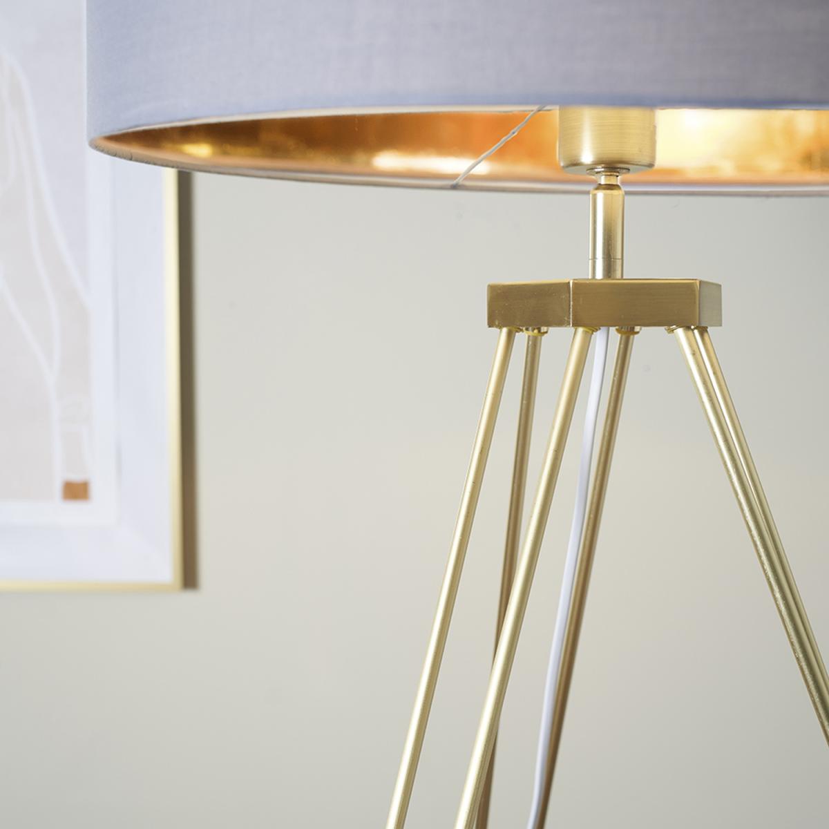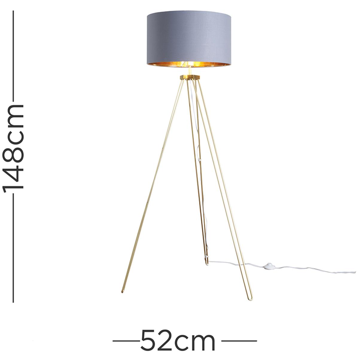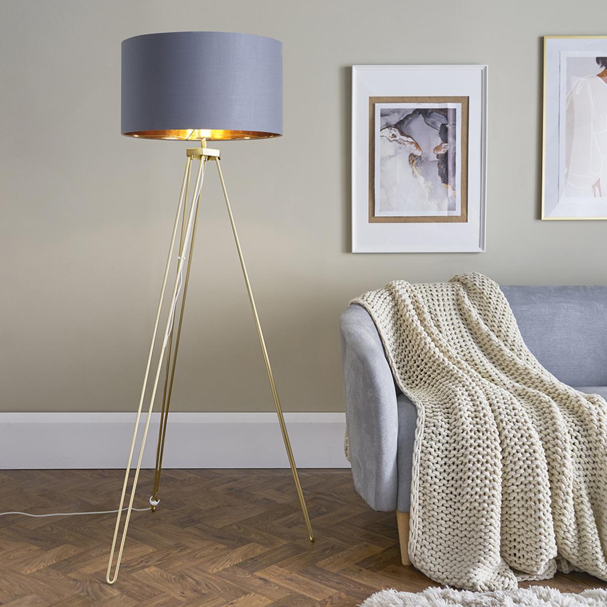 Modern tripod style floor lamp in a gold metal finish, featuring curved hairpin style designed legs making it a true statement piece for any living area! This lamp also comes with an in-line onoff foot switch for easy use and comes complete with a grey fabric cylinder lamp shade with a gold coloured interior. Floor lamps are a great way to bring additional lighting to a room or you can use them reduce your main light output, and create a more relaxing moodatmosphere.
