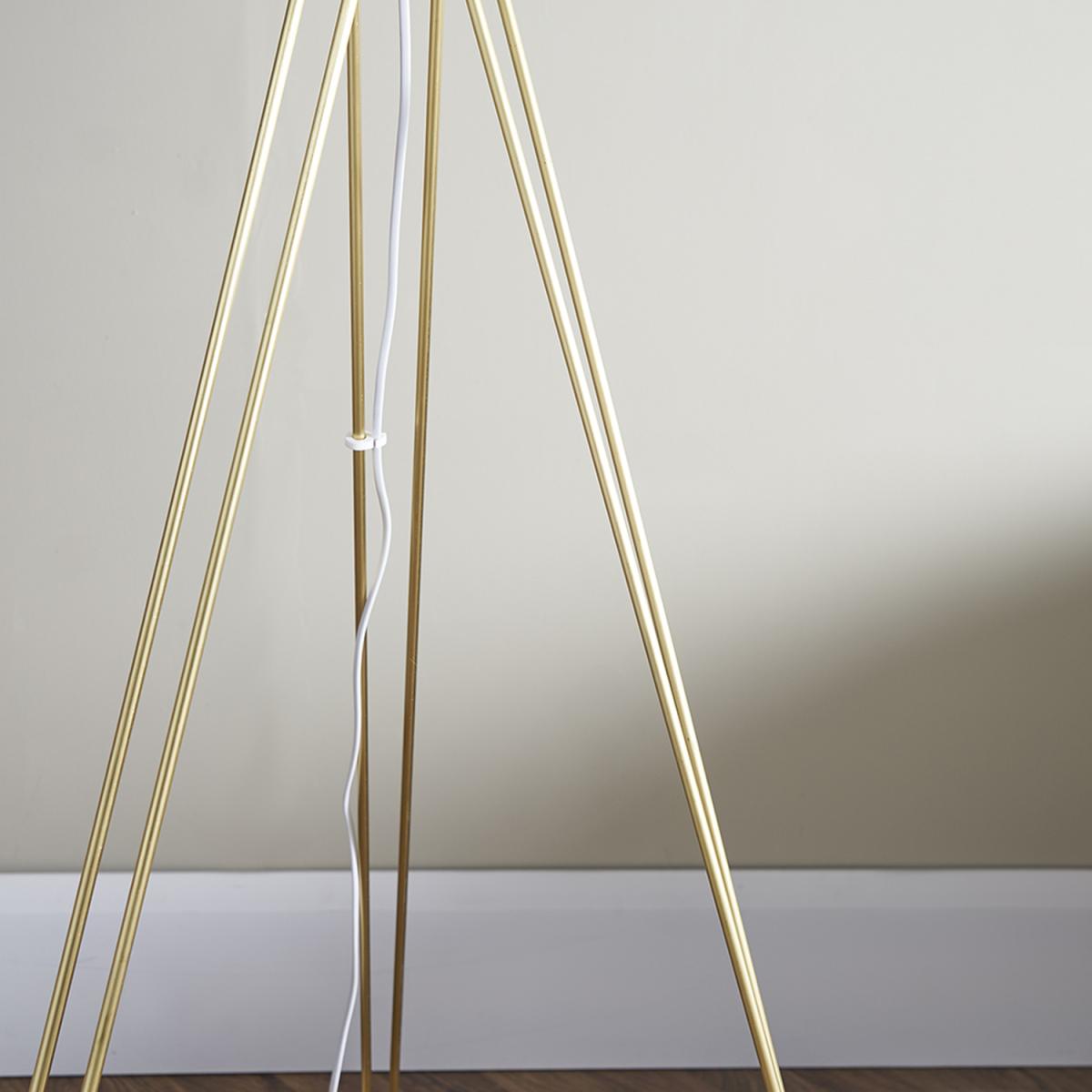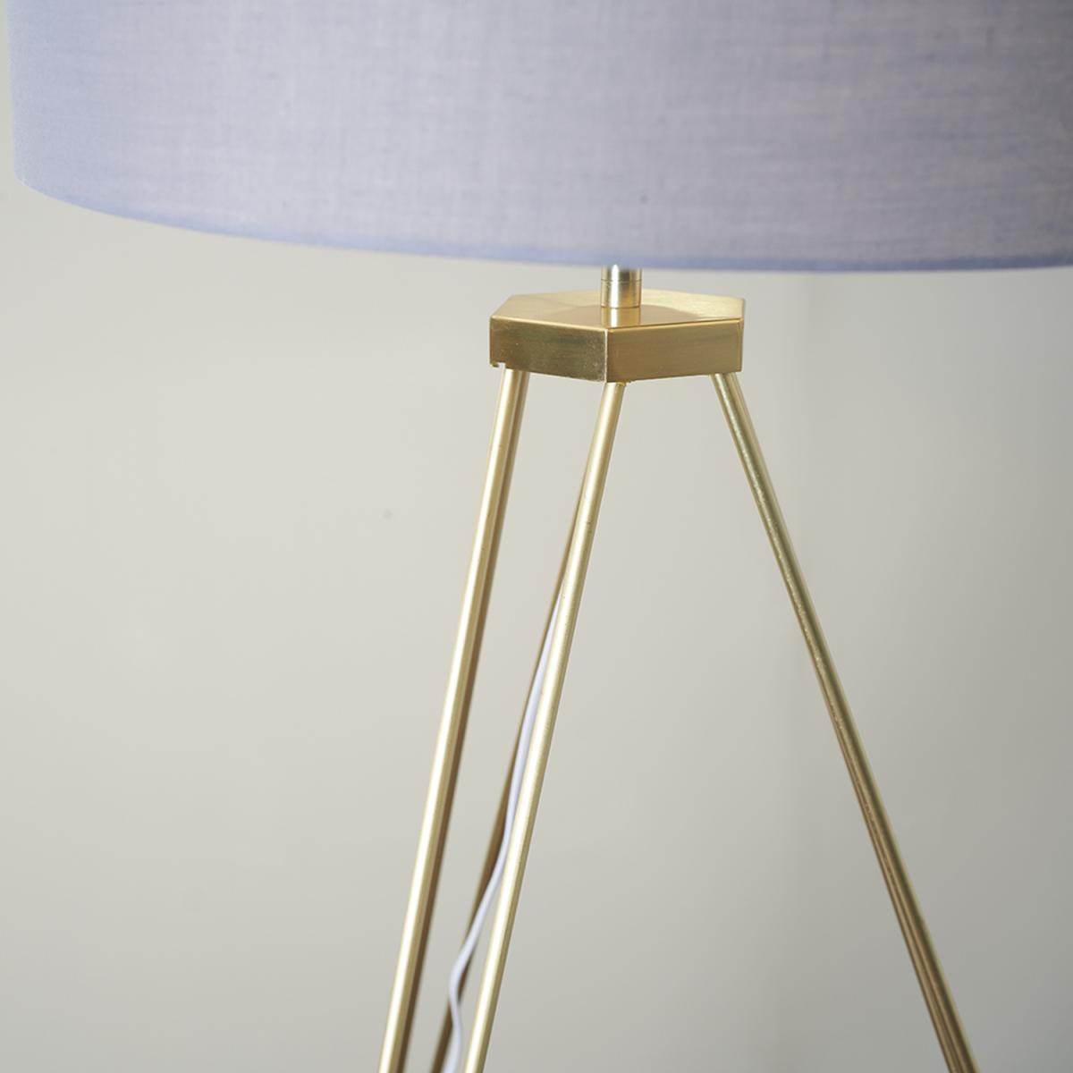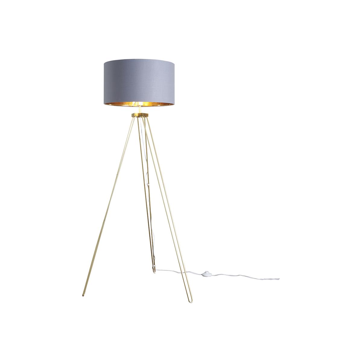Modern tripod style floor lamp in a gold metal finish, featuring curved hairpin style designed legs making it a true statement piece for any living area! This lamp also comes with an in-line onoff foot switch for easy use and comes complete with a grey fabric cylinder lamp shade with a gold coloured interior. Floor lamps are a great way to bring additional lighting to a room or you can use them reduce your main light output, and create a more relaxing moodatmosphere.