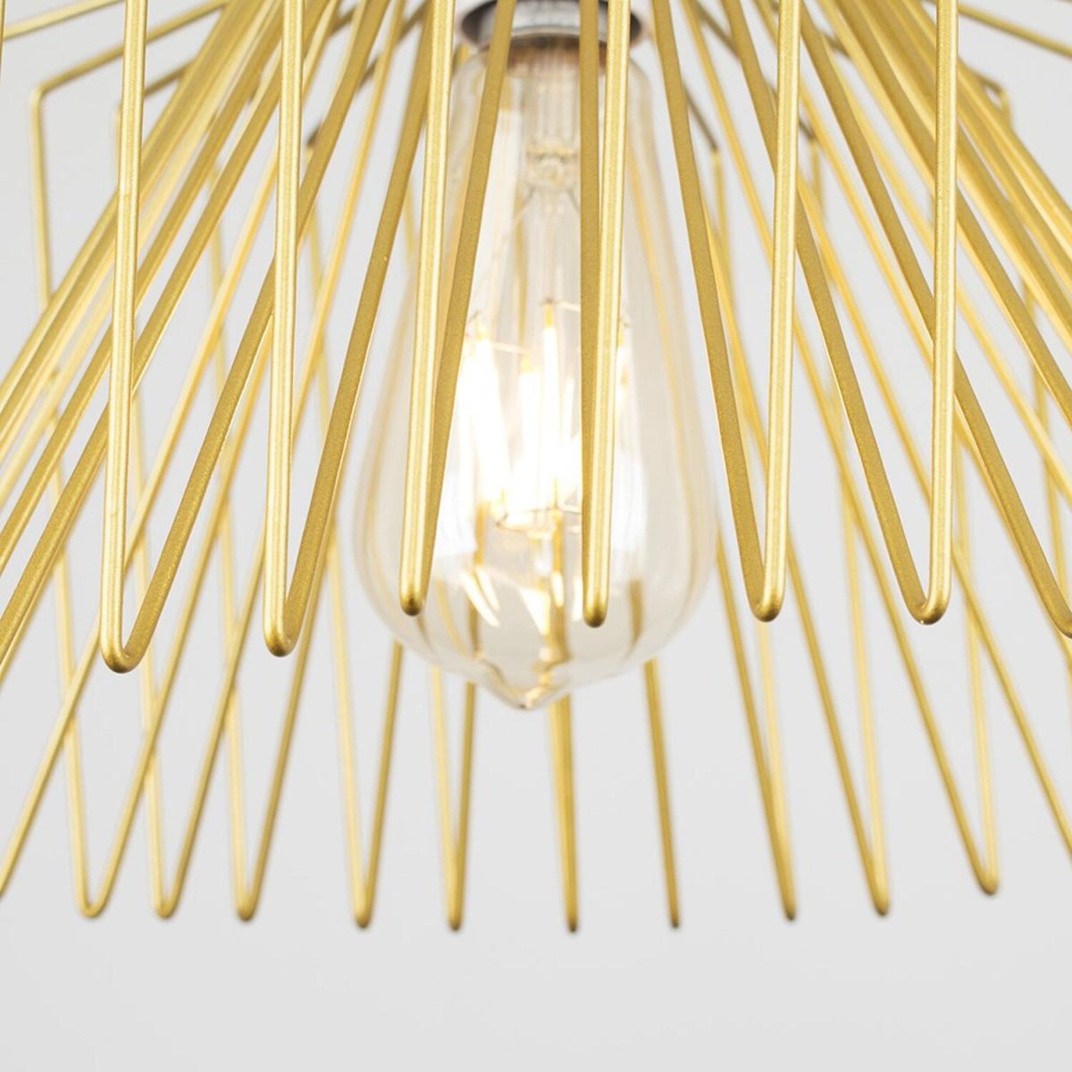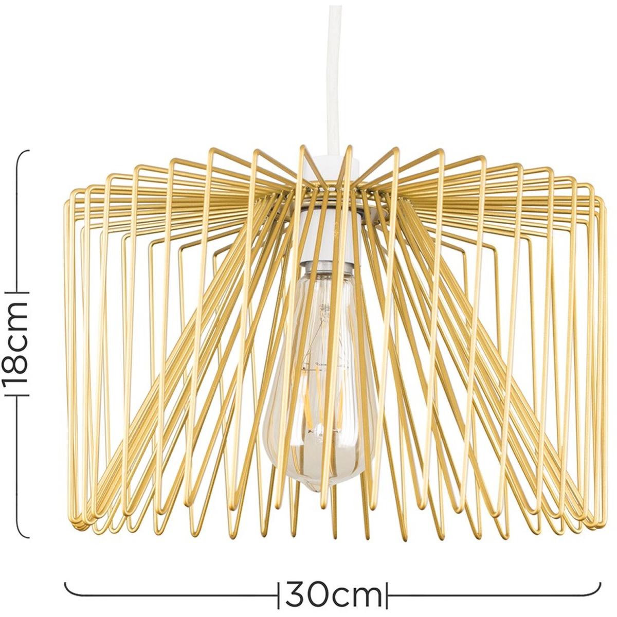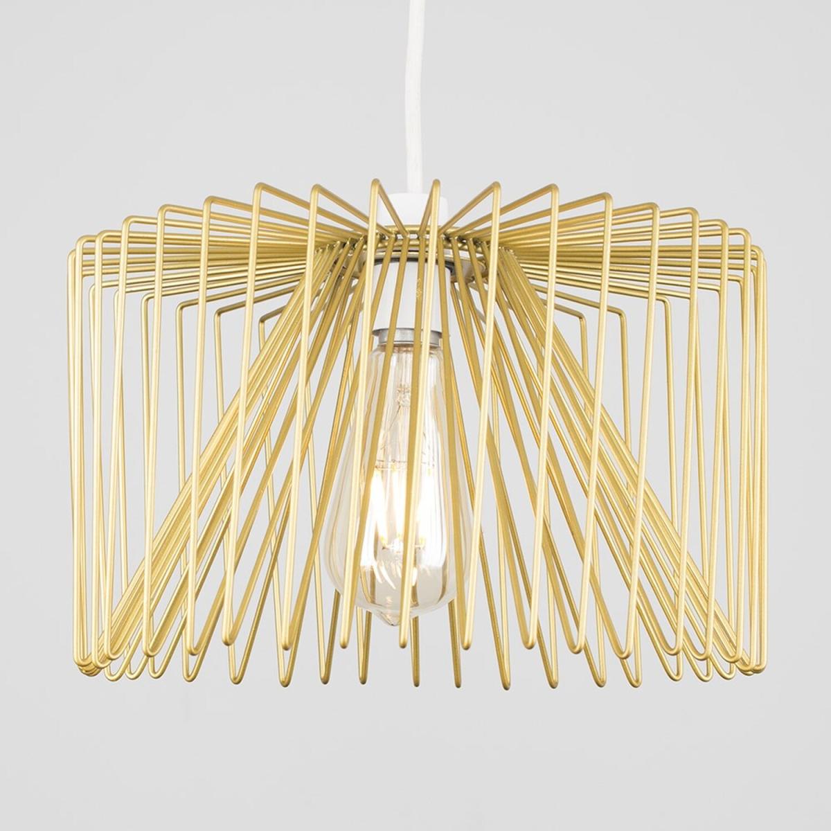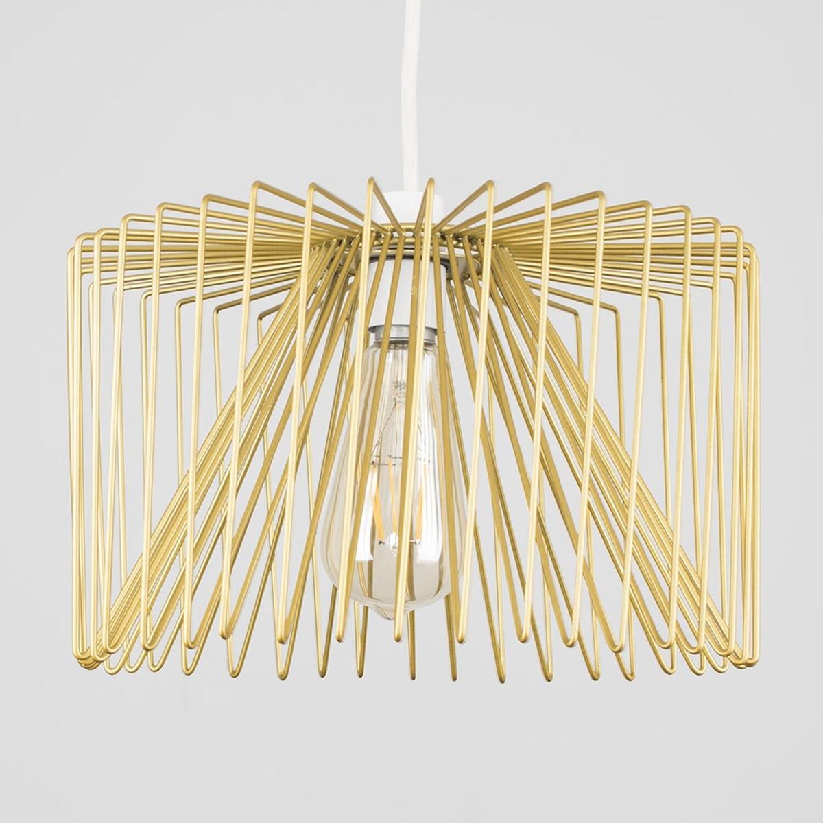 Modern wire design cylinder shaped ceiling pendant light shade in a gold effect metal finish. Features an open design which shades the bulb whilst allowing light to disperse effectively and evenly throughout the room. This light shade will make a real style statement and complete your living space look. Easily fits to your existing lamp holder in a matter of seconds - no electrical installation required. Ideal for use in lounges, hallways, bedrooms and other living areas.