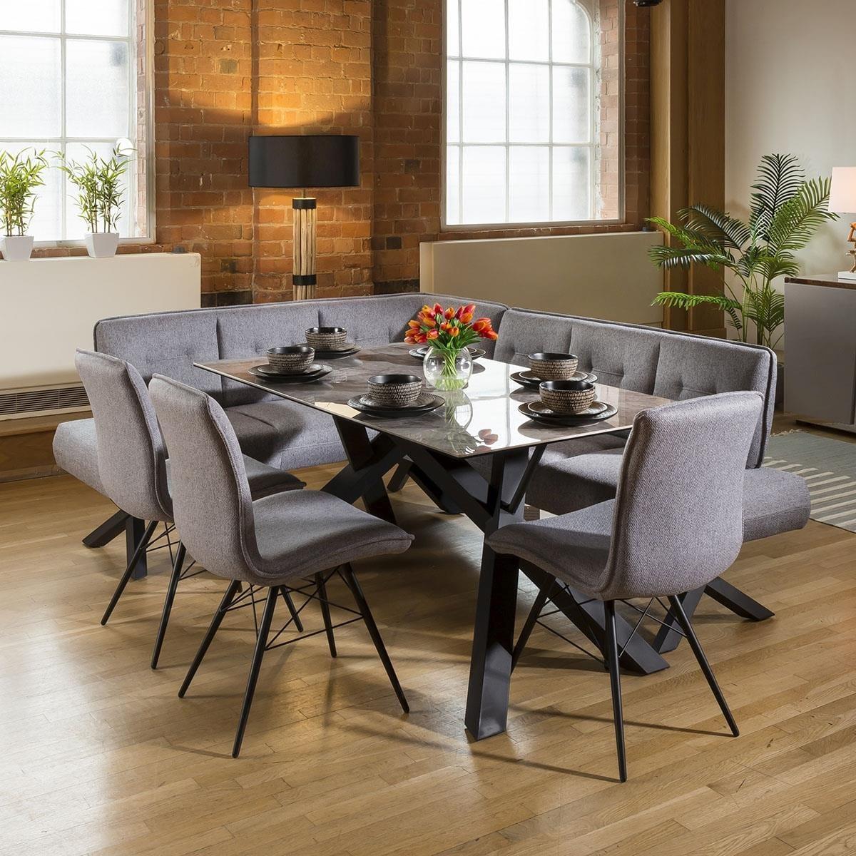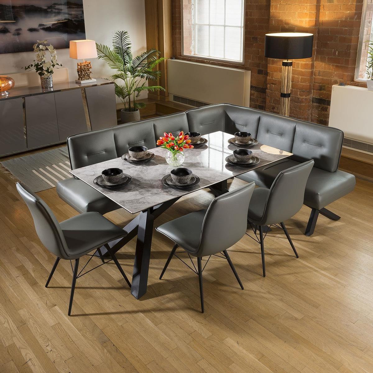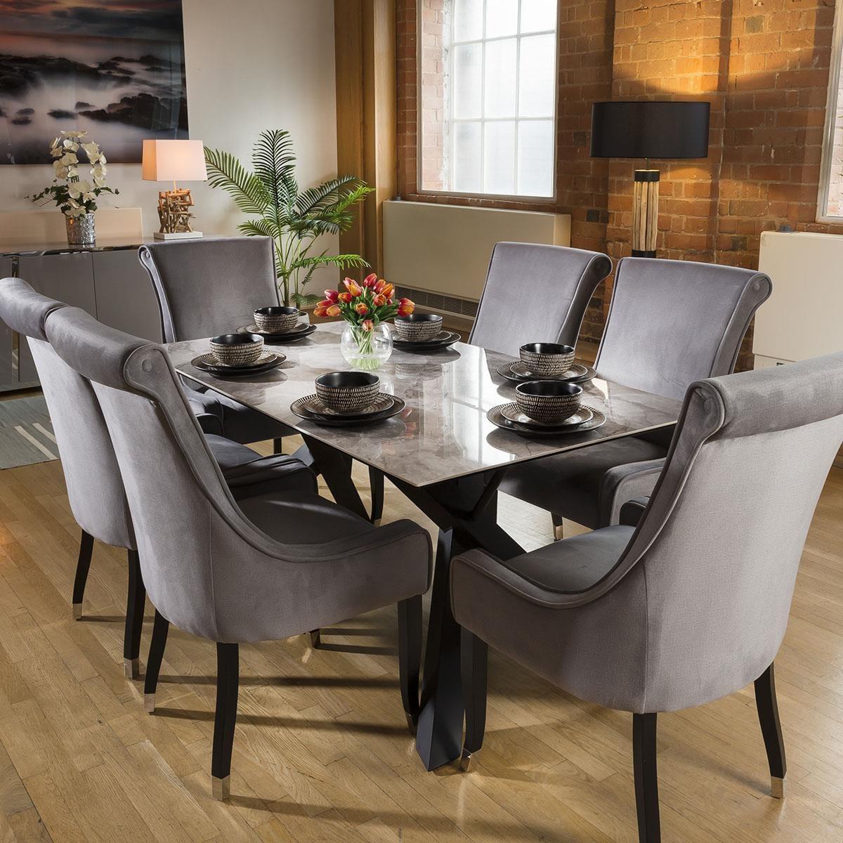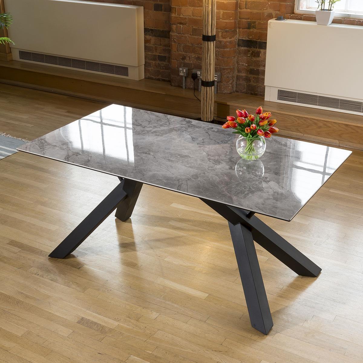 Elegance is the first word that comes to mind when you see the HT9021 dining table. Topped in 5.5mm grey ceramic and 6mm black glass all sat on black powder coated steel legs. Very strong, not only in design but construction too. Quatropi Premium Dining tables are among the highest quality designer tables in the world, with a wide choice of in-stock and made to order options. Our tables come in many forms including; round, oval, glass, marble effect, ceramic, concrete, solid oak, as well as wooden veneers in a chosen finish. Choose your size; from small, large, to extra large when extended with our extendable options that include extension leaves and folding mechanisms. Get the family together with our large 12 seater, 8 seater, and 6 seater dining sets with a large choice of dining chairs available, or for smaller dining rooms our 4 seater dining table and chair sets are the perfect choice! W160cm D90cm H76cm Highly durable marble effect ceramic tabletop X-Leg Design