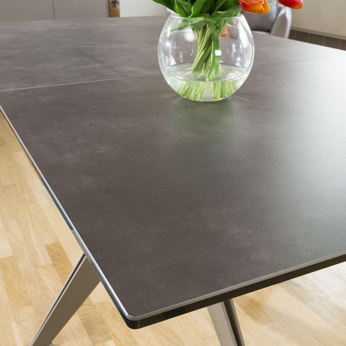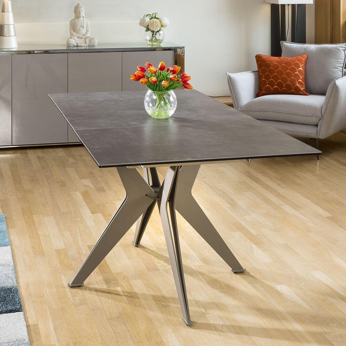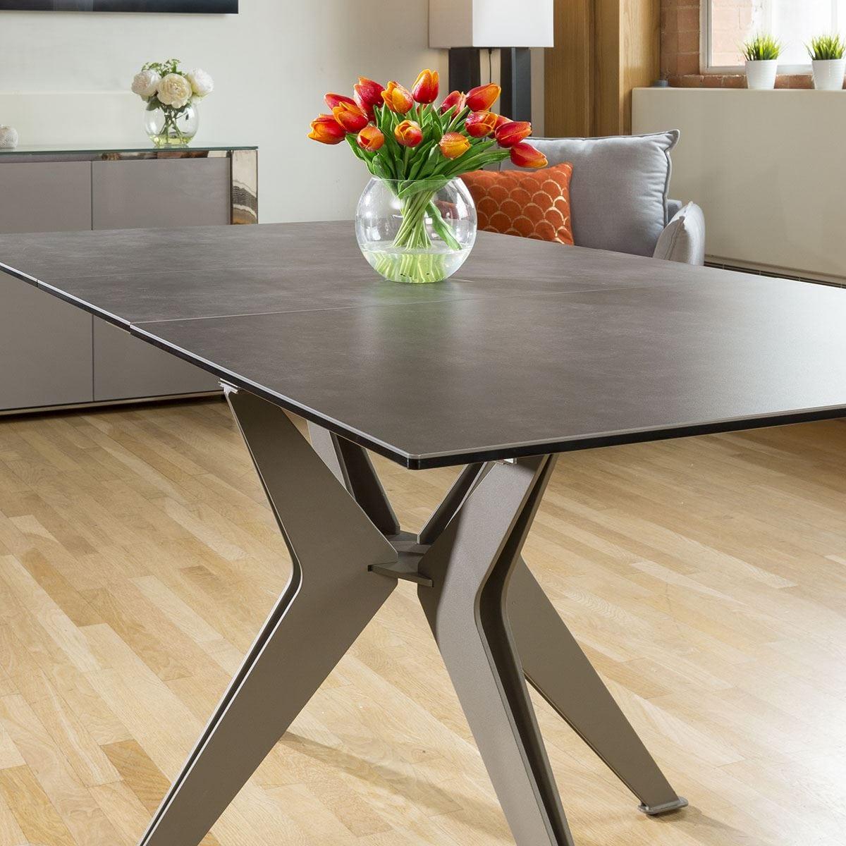 High Quality Rectangular Extending Dining Table with Grey Italian Ceramic Top and Matt Grey Powder Coated Steel Legs. The extension folds out and away by pulling the table apart from one end. The opening mechanism is smooth. Very strong and heavy from this design that works as a lovely sophisticated elegant formal dining table. W170cm D86cm H76cm Self-stowing extending table Seat up to 6 chairs when fully extended