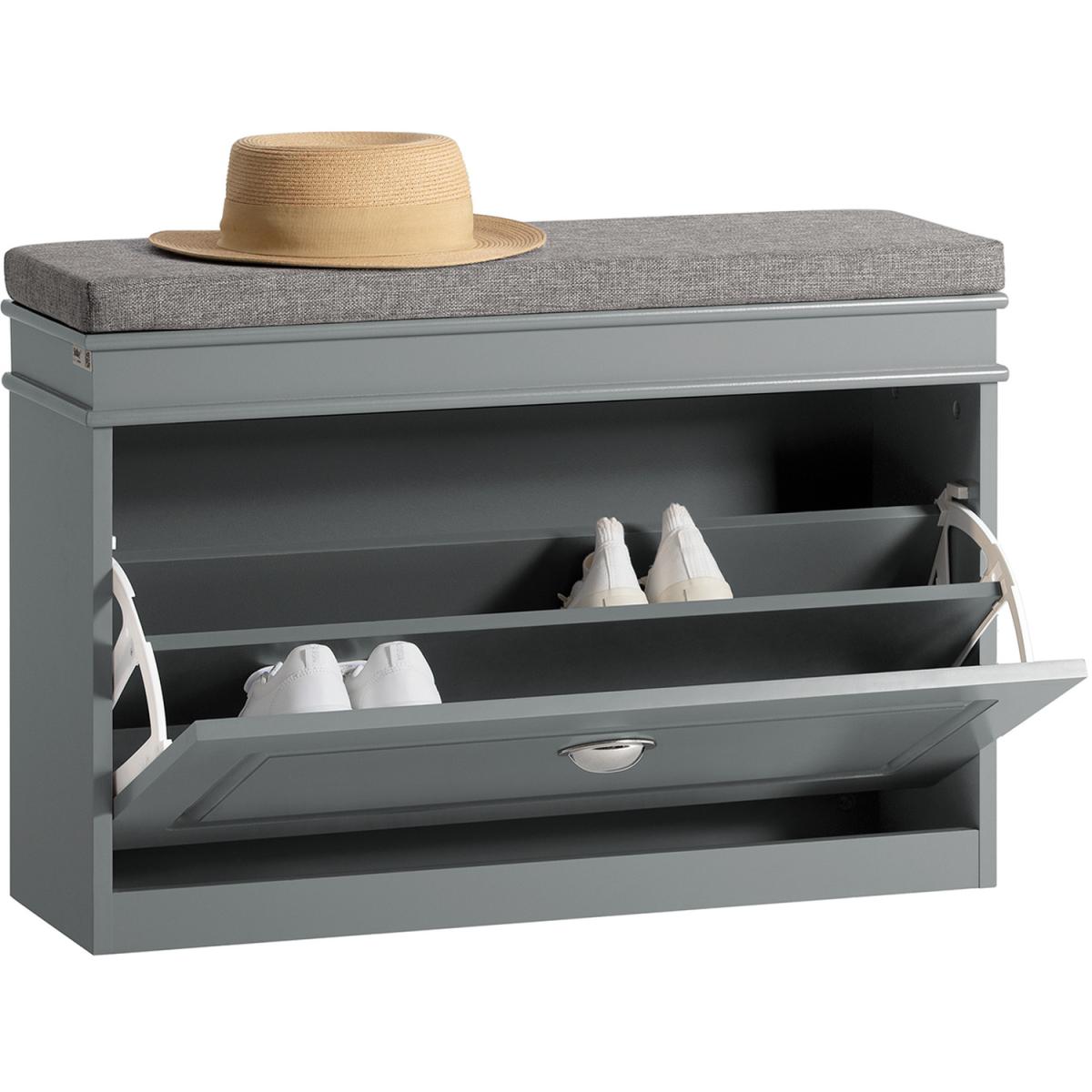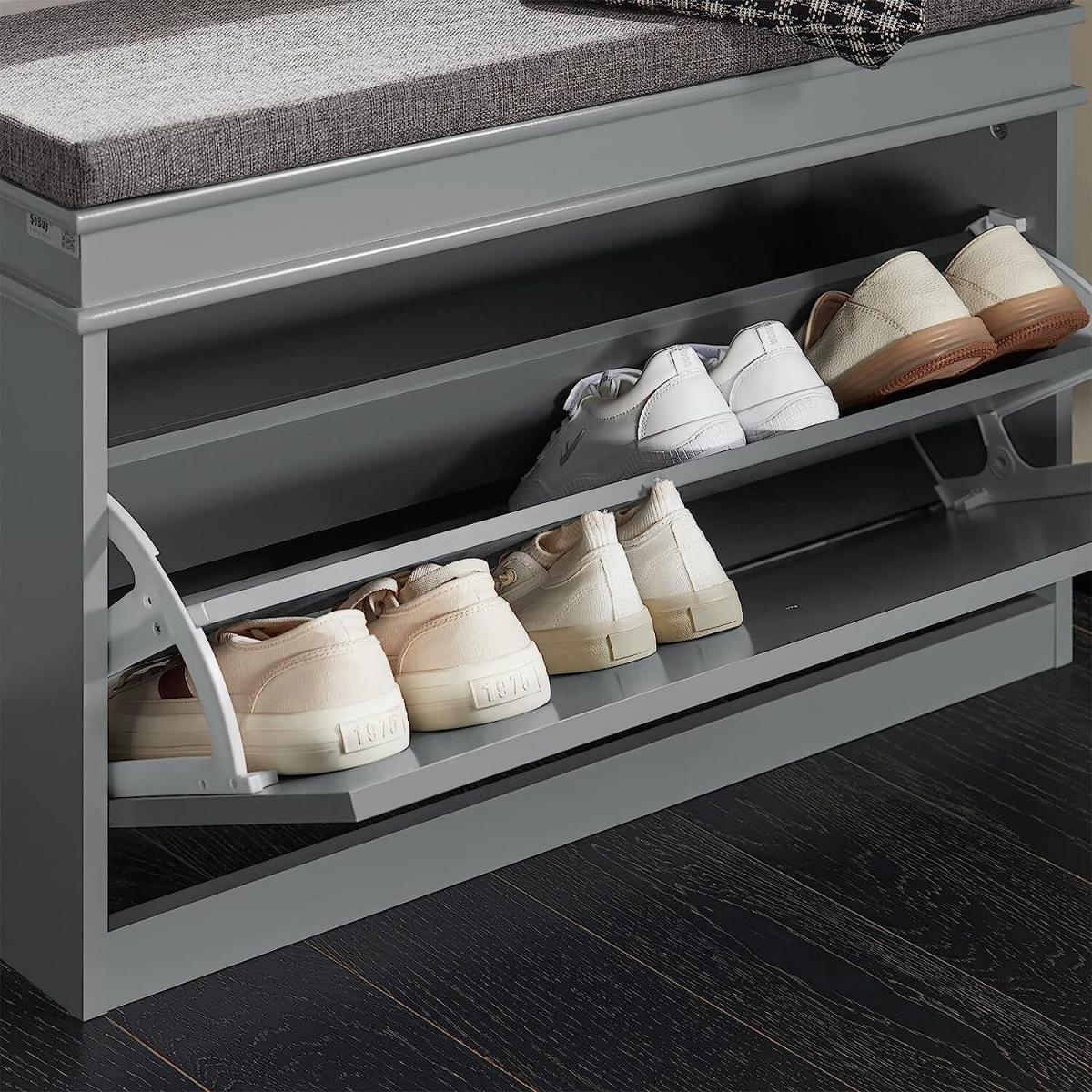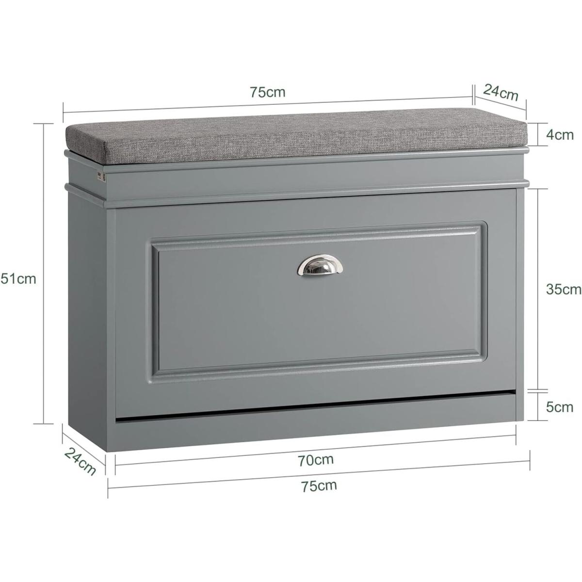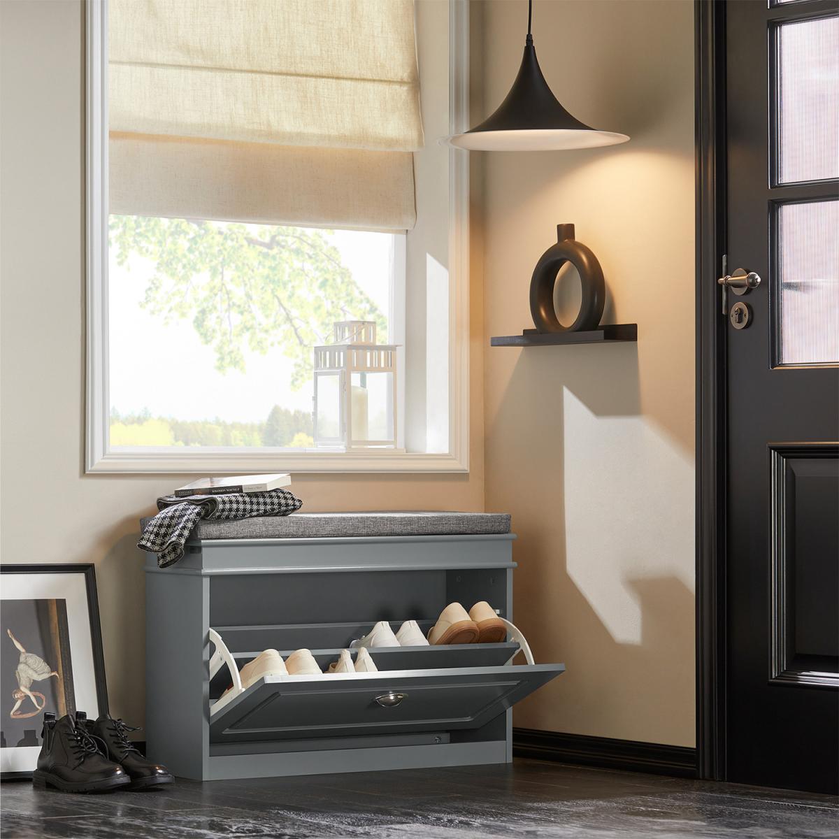 Modern design shoe cabinet with soft padded cushion, good choice for hallway, living room and bedroom. It consists of storage for several shoes in one handy flip down section beneath cushioned seat area. There is one board in the flip-drawer, which is removable for setting distance due to different sizes of shoes. The seat cushion which is removable is ideal for comfortable sitting while putting on and taking off shoes. This shoe cabinet will blend perfectly with your modern or traditional decor.