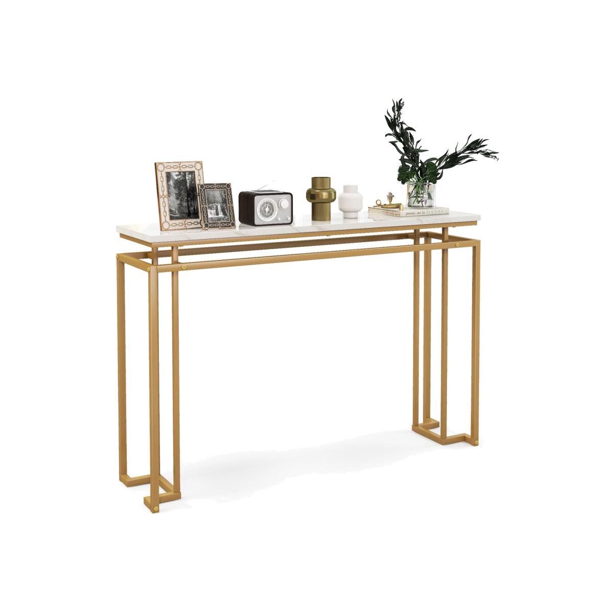 Transform your living space into an exquisite sanctuary with our luxurious console table. Its elegant faux marble tabletop looks like floating atop the gold metal frame thanks to the unique 2-tier design, adding a touch of sophistication to any room. Crafted with premium MDF and sturdy metal, this entryway table is built to last. What's more, there are 2 adjustable foot pads for enhanced stability, while the anti-tipping kit provides added safety.