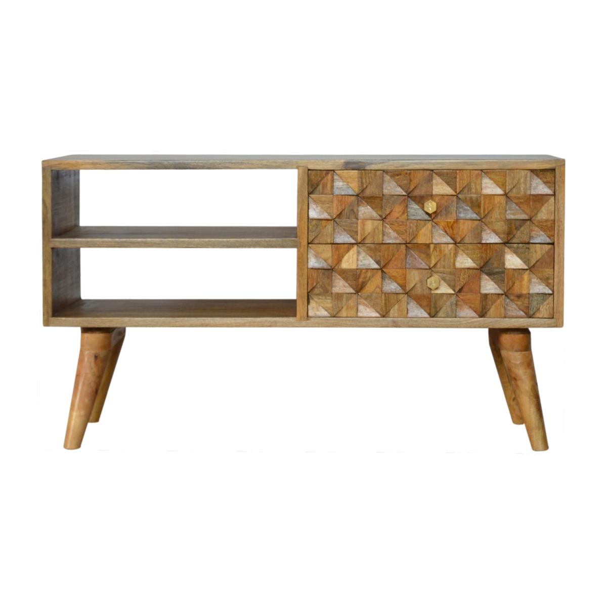 This stunning media unit adds a touch of modern elegance to any living space. Made from high-quality solid wood with a beautiful oak finish, this unit features a unique diamond-carved design on the drawer fronts, creating a visually striking and textured centerpiece for your entertainment area.