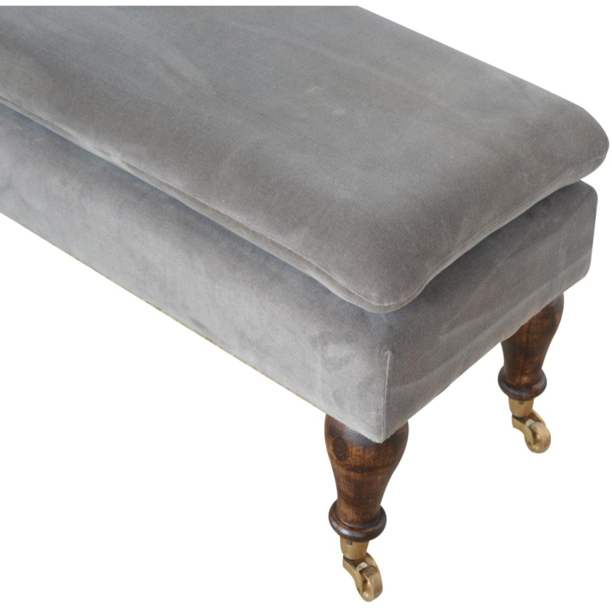 This bench is a great addition to the home. It has been upholstered in a beautiful grey cotton velvet fabric in a light walnut finish and has castor feet to allow easy movement of the bench around the home. A lovely and elegant piece for a bedroom, hallway, or living room. Please note this is NOT a storage bench.