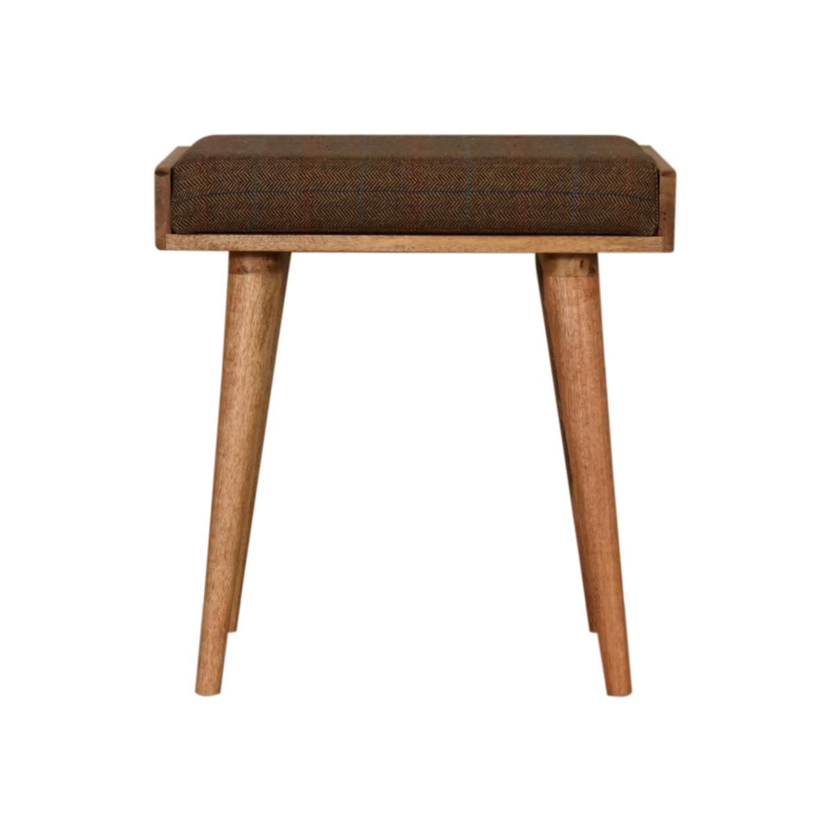 This footstool features a tray-style design and 4 Nordic-style legs constructed from 100 solid mango wood. It has an upholstered multi tweed top that works as a comfortable seat and can be incorporated into many different interior styles as it offers a very clean and modern design, along with providing a nice contrast between the material and wood.