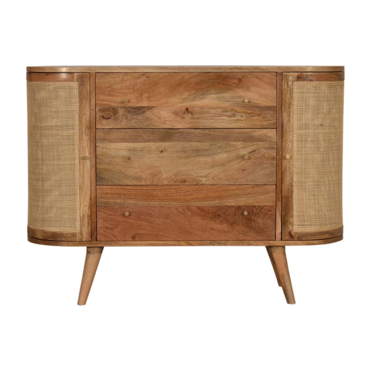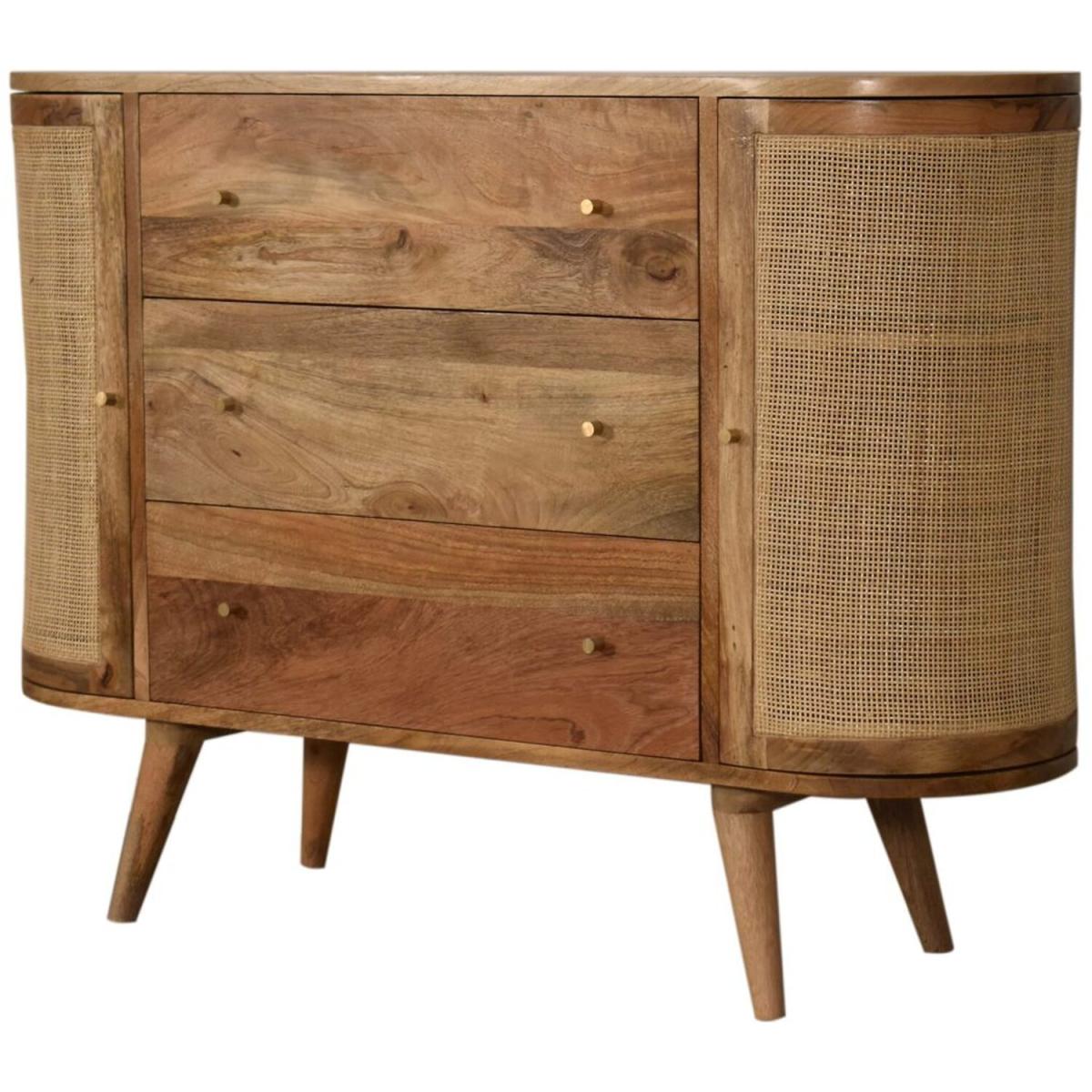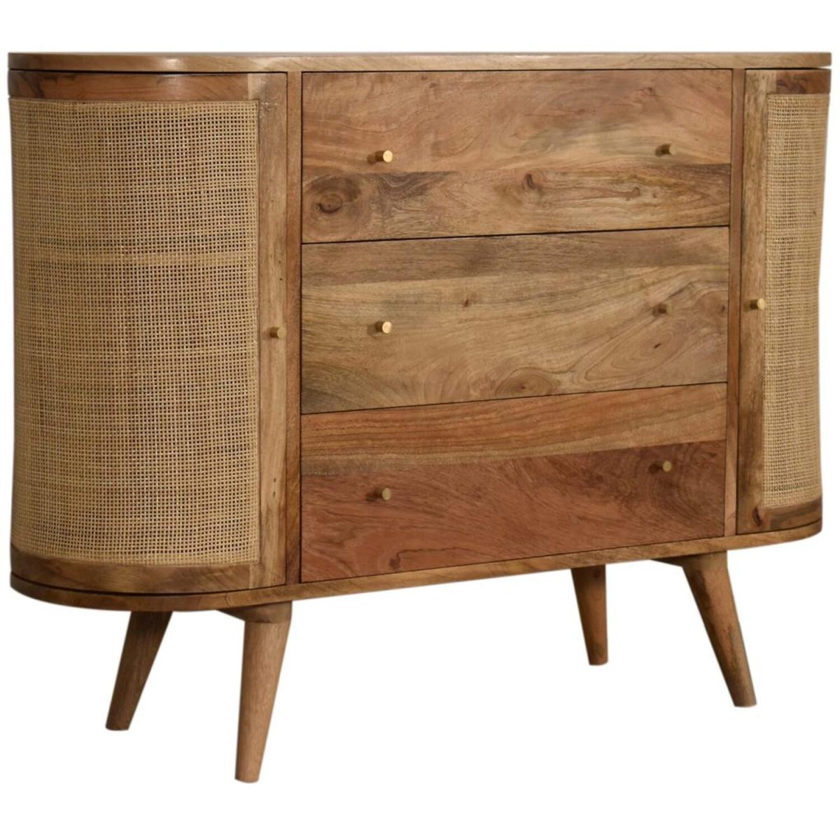 This stylish cabinet combines 2 woven-style door fronts with a smooth oak-ish finish body and legs. Constructed from 100% solid mango legs it features 3 spacious drawers perfect for storage shiny knobs on the drawers and nordic style legs. Make full use of this cabinet in the living room or bedroom and partner it with the rest of the collection.