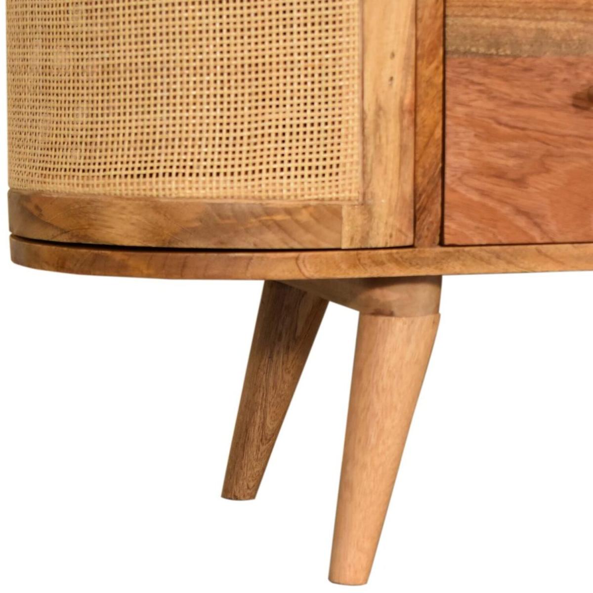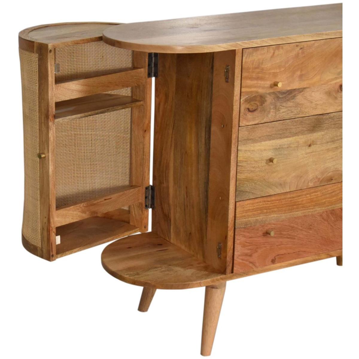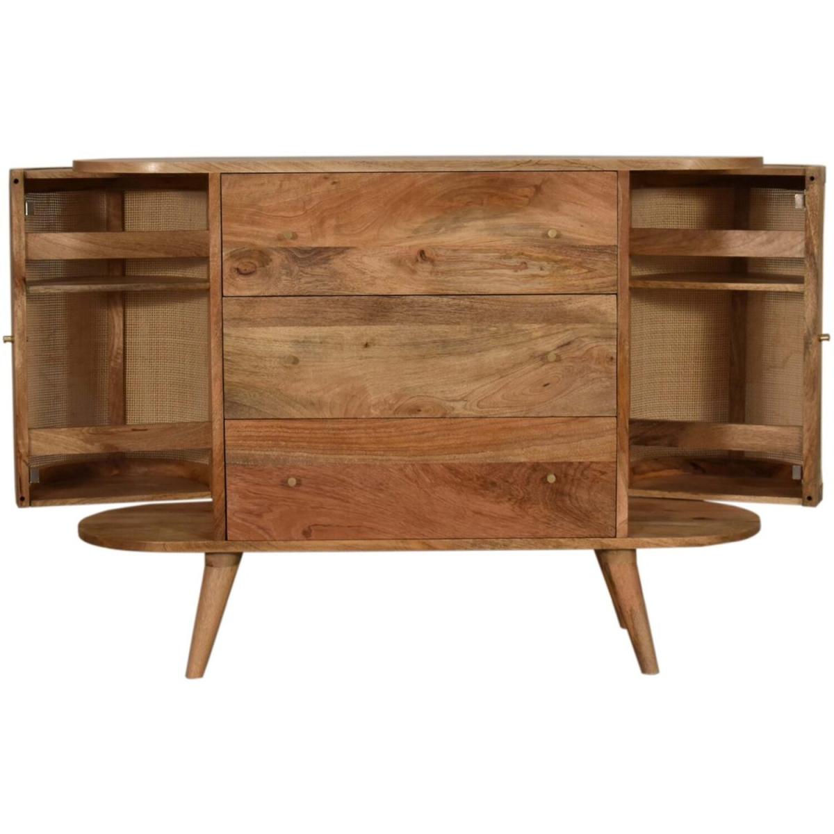 This stylish cabinet combines 2 woven-style door fronts with a smooth oak-ish finish body and legs. Constructed from 100% solid mango legs it features 3 spacious drawers perfect for storage shiny knobs on the drawers and nordic style legs. Make full use of this cabinet in the living room or bedroom and partner it with the rest of the collection.