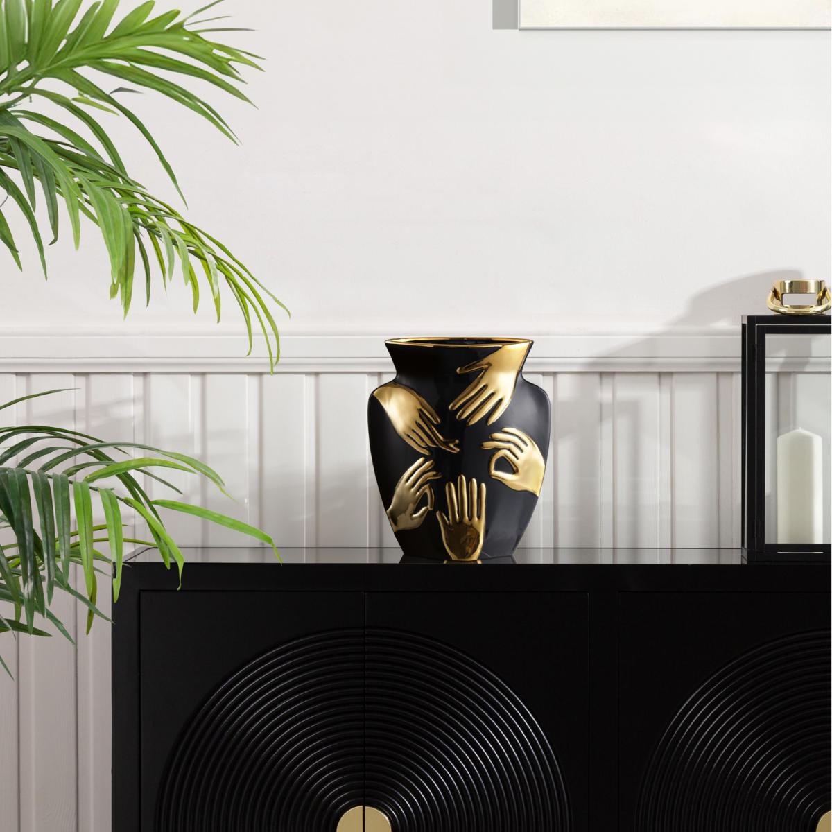 This modern handmade ceramic vase is a beautifully crafted piece that adds sophistication and style to your home decor. Featuring a sleek and minimalist design, it effortlessly complements contemporary interiors. Ideal for displaying fresh or artificial flowers or as a standalone accent piece, this vase brings elegance and charm to any room, making it a perfect addition to your living space. This handmade black ceramic vase with a gold hands design is a captivating modern accent for your living room decor. The contrast of black with the elegant gold hands creates a striking visual appeal, adding a touch of luxury and artistry to any space. Whether used for fresh or artificial flowers or displayed as a standalone piece, this vase brings contemporary elegance to your home.
