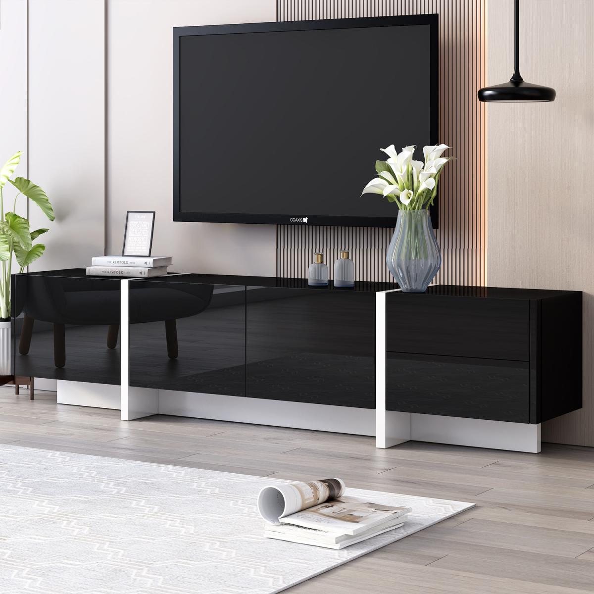 Immerse yourself in the simple elegance of our black and white TV cabinets. The high-gloss white body creates a clear, modern style, while the black legs provide an attractive contrast. The large cabinet providing enough space for your entertainment electronic devices. Three doors and two drawers ensure a neat appearance and practical storage space. The clever combination of black and white makes the TV cabinet not only visually harmonious, but also has a contemporary aesthetic. A piece of furniture that impresses both in design and functionality. Clear lines and minimalist design make this TV stand a timeless focal point. A high-gloss finish and solid black elements give it a modern feel. The interior design of the product is also very exquisite: there is a shelf inside the door, so your items can be stored neatly inside the door.