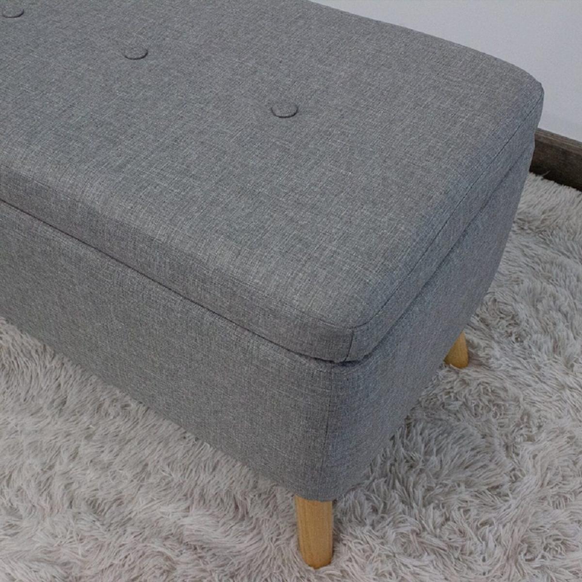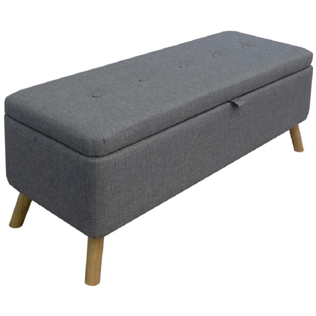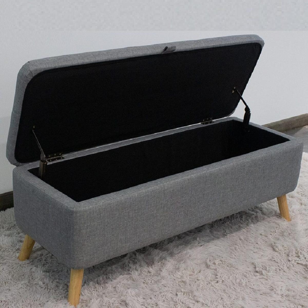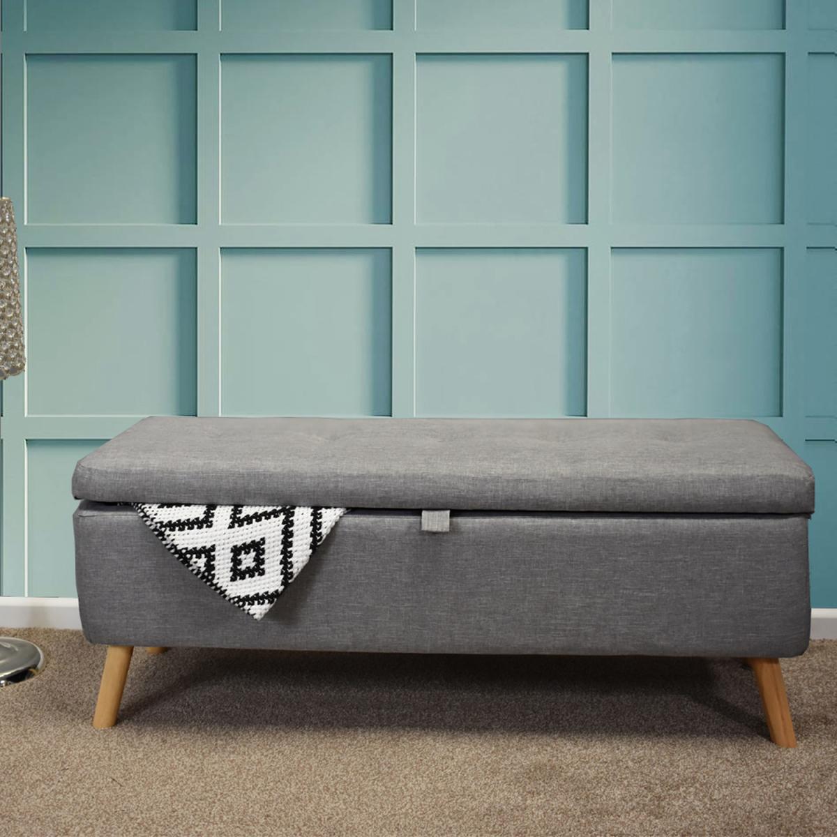 Modern Linen Ottoman Storage Bench, the Harper Ottoman Storage Seat stands on natural, solid wooden legs and is sumptuously coated in a linen fabric with buttoned stitching and a padded hinged lid. This contemporary piece comes pre-assembled for easy installation.