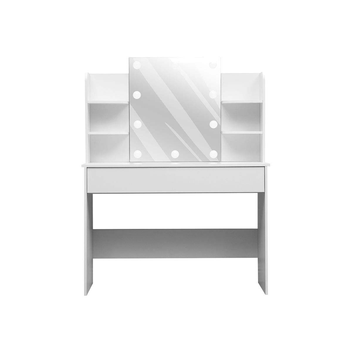 Step into the glamour of Hollywood with this exquisite vanity desk, which is designed to make you feel like a star. Its standout feature would be the large mirror, enhanced with 10 light bulbs that offer three different light modes, this set is perfect for makeup application and styling. And the bare bulbs also add that touch of Hollywood charm to your routine. On either side of the mirror, you will find shelves ideal for showcasing your skincare products, perfumes, and more. Additionally, a large drawer with three compartments provides ample storage for jewelry and everyday essentials, keeping everything neatly organized.