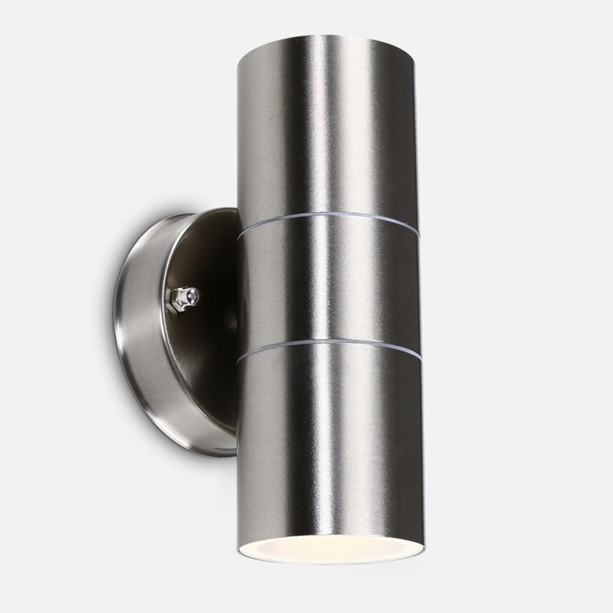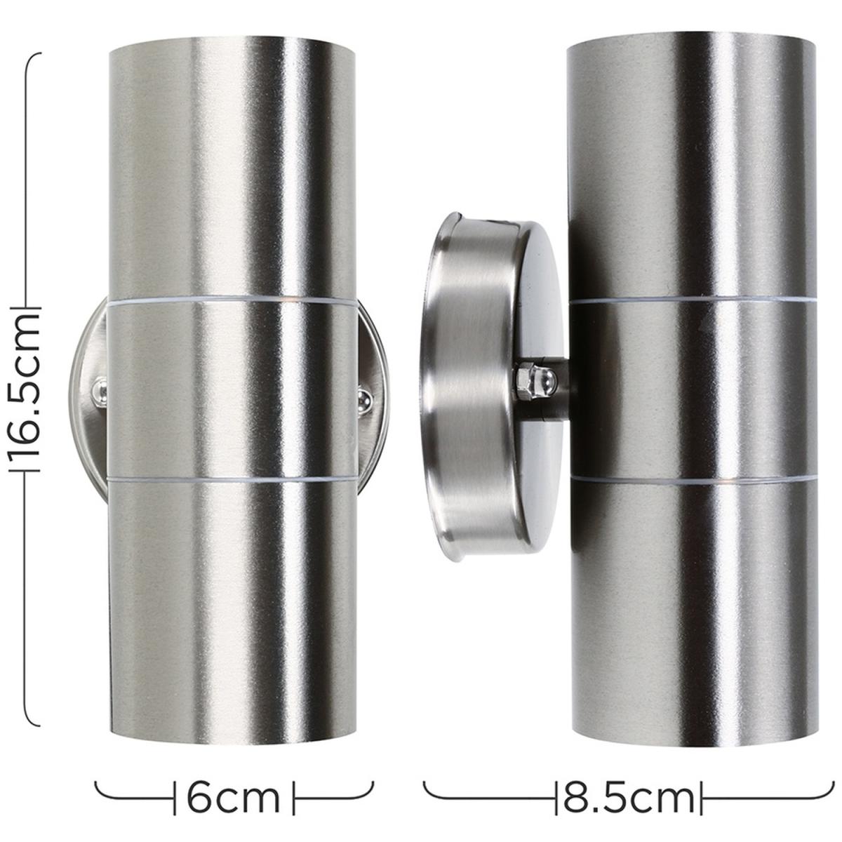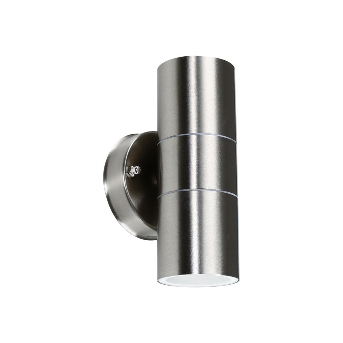 Wall mounted up down outdoor light in a brushed chrome metal finish has a modern flush cylinder design, and is ideal for lighting gardens, paths, garages, patios, courtyards, decorative porches and driveways. IP44 outdoor weatherproof rated security light - providing extra safety for the home and giving peace of mind. The wall-mounted outdoor flush light comes in a sturdy and weatherproof durable design and emits bright light from both the top and bottom. This robust, illuminating external light is IP44 Rated and is fully certified for outdoor installation.