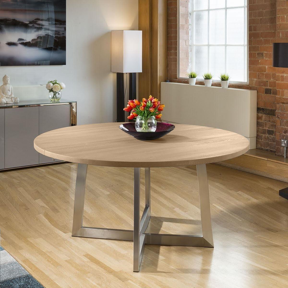 Super High Quality Large Round Dining Table Crafted from Solid Oak. Lovely quality from this top Danish manufacturer. Solid with a smooth, simple and strong extending mechanism. Stainless steel frame with solid 40mm thick solid oak top - super durable and really stunning to view. W150cm D150cm H75cm Natural Oak Finish Brushed Metal Legs