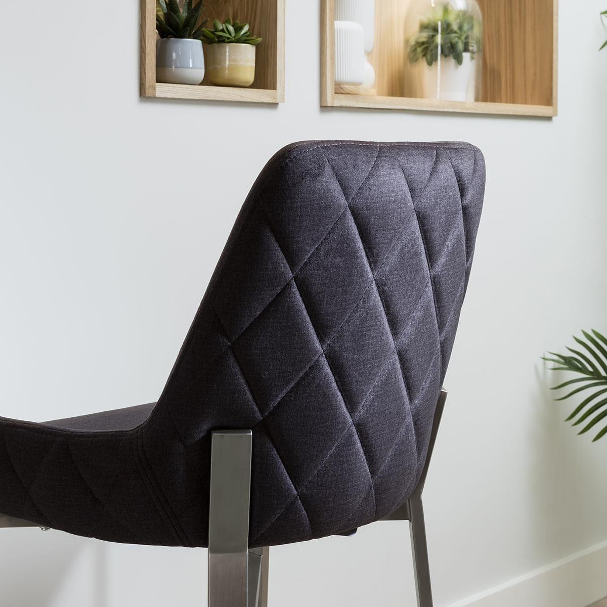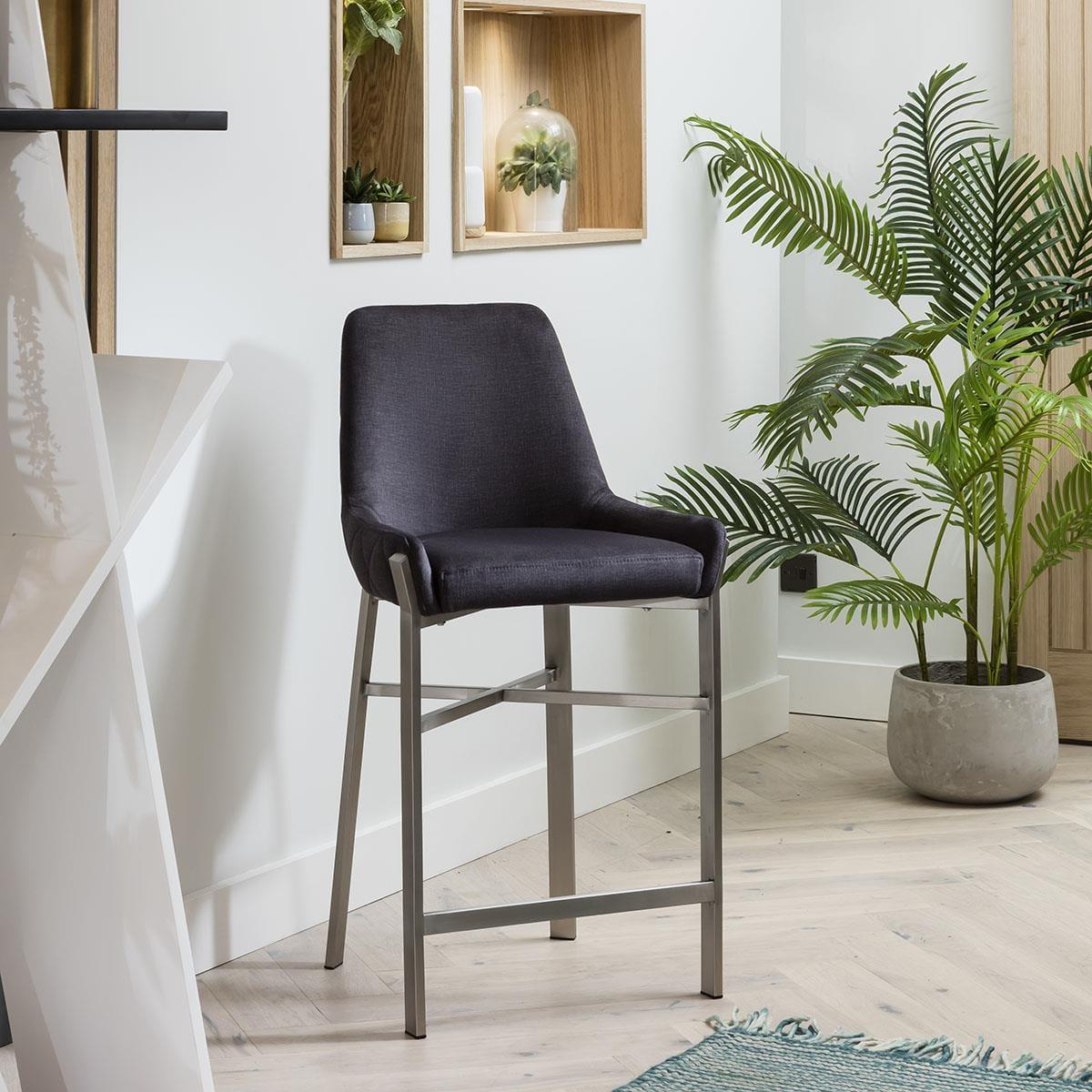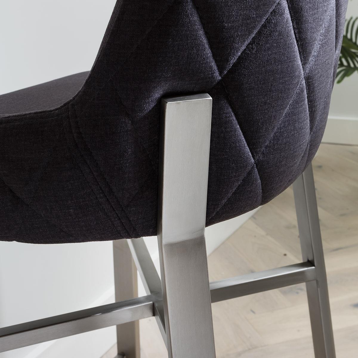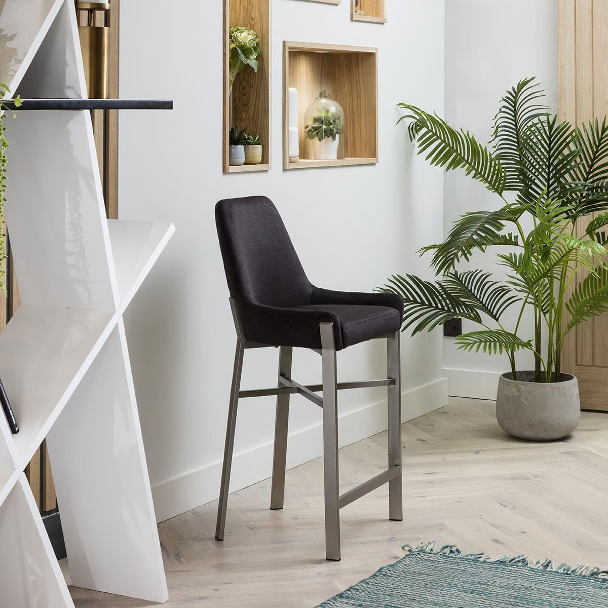 The perfect blend of modern design and optimal comfort, these kitchen bar stools with backs are designed to elevate your dining space. The bar stool features a unique carver style with low-profile arms, a sleek silhouette in premium charcoal grey fabric, highlighted by the quilted detail, and ultra-modern metal legs. Crafted for luxurious dining experiences, this stool is upholstered in a premium charcoal grey fabric that exudes sophistication. The diamond quilting adds a touch of luxury while the high-quality foam padding ensures a comfortable seating experience, even during extended gatherings. Accentuating its ultra-modern appeal are the brushed metal modern legs. The chair's distinctive leg design not only adds visual intrigue but also enhances stability. With a variety of colors to choose from, you can effortlessly complement your existing decor or create a bold statement by mixing and matching. Elevate your dining area with the epitome of contemporary design and comfort. Our Ultra-Modern Carver Style Bar Stool is a true masterpiece, harmonising form and function with its distinctive silhouette, premium fabric, and unique leg design. Make a statement in style and comfort at every meal. W55cm D47cm H101cm Seat Height 69cm Modern Kitchen Bar Stool With Back