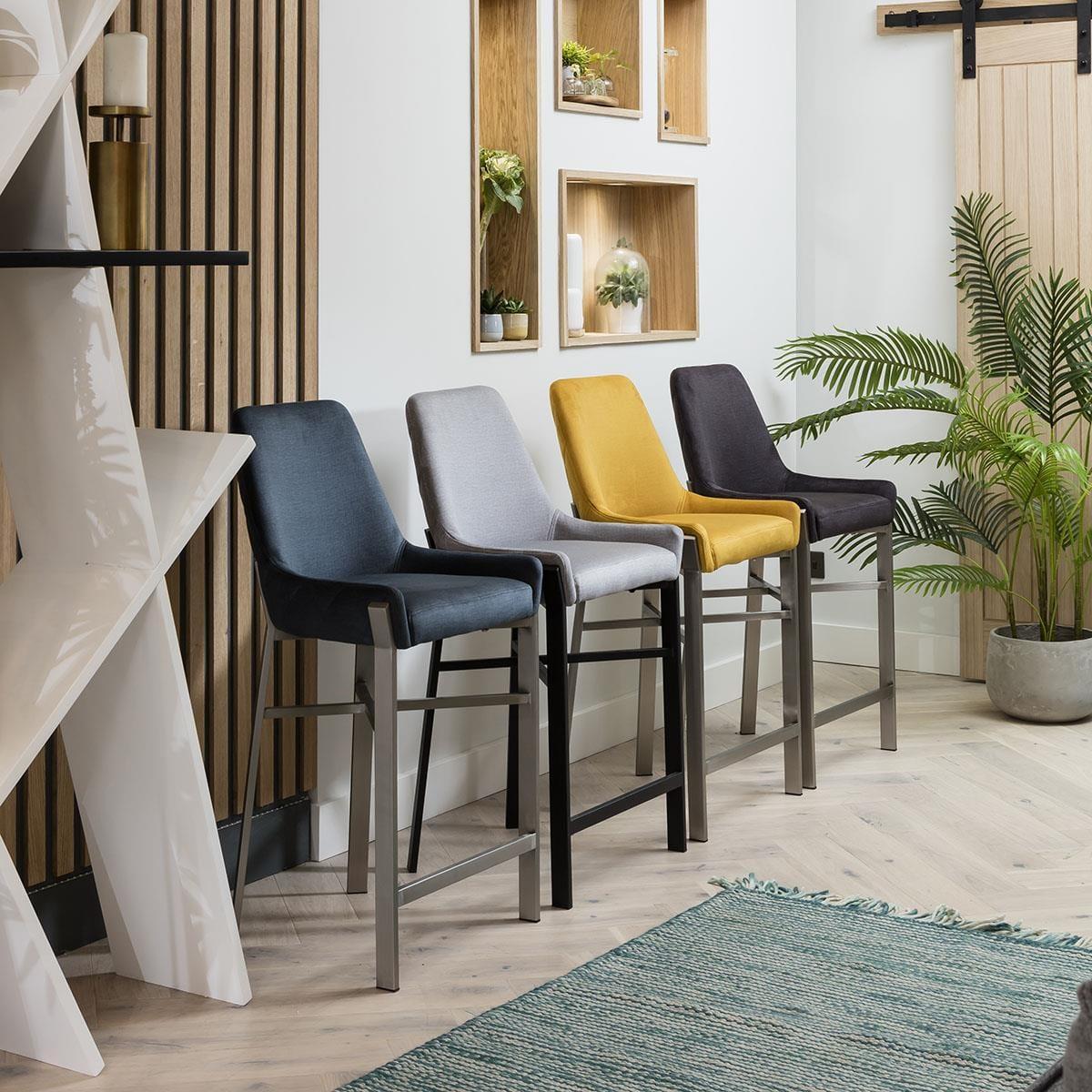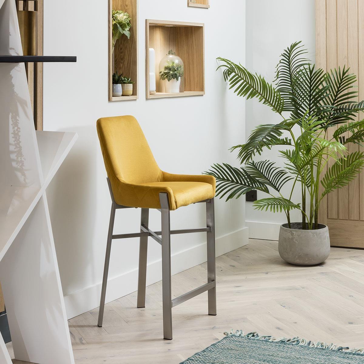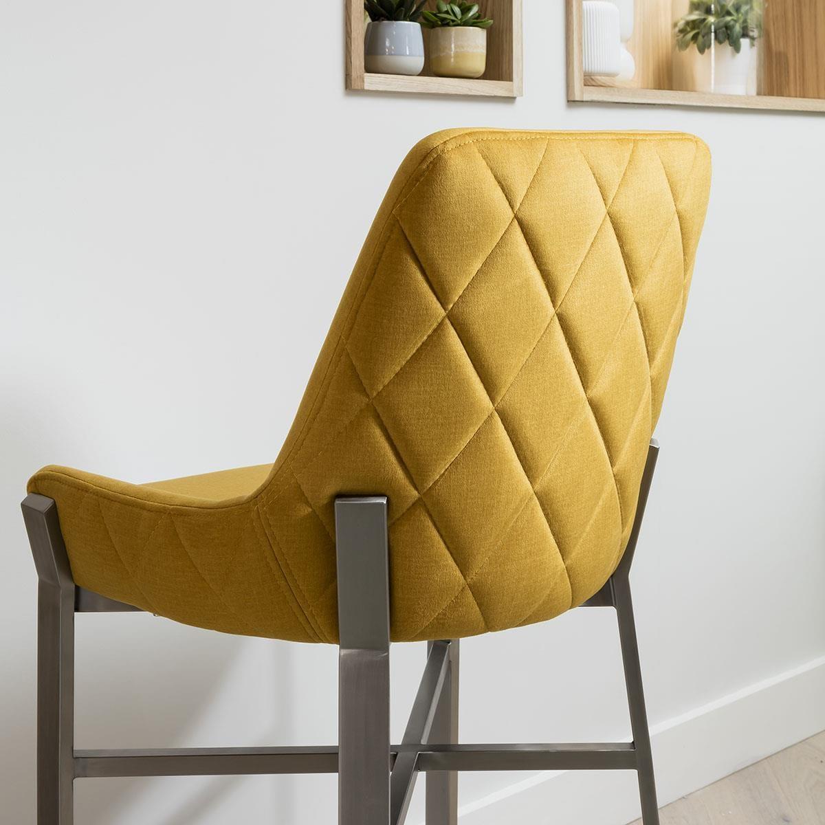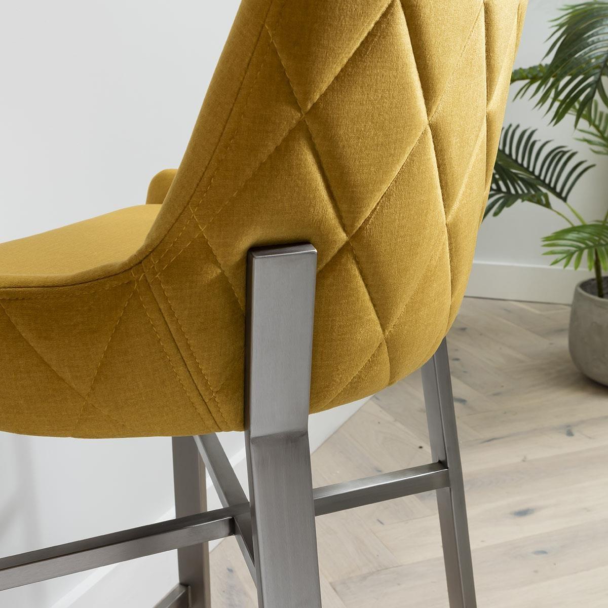 The perfect blend of modern design and optimal comfort, these kitchen bar stools with backs are designed to elevate your dining space. The bar stool features a unique carver style with low-profile arms, a sleek silhouette in premium light blue fabric, highlighted by the quilted detail, and ultra-modern metal legs. Crafted for luxurious dining experiences, this stool is upholstered in a premium mustard yellow fabric that exudes sophistication. The diamond quilting adds a touch of luxury while the high-quality foam padding ensures a comfortable seating experience, even during extended gatherings. Accentuating its ultra-modern appeal are the brushed metal modern legs. The chair's distinctive leg design not only adds visual intrigue but also enhances stability. With a variety of colors to choose from, you can effortlessly complement your existing decor or create a bold statement by mixing and matching. Elevate your dining area with the epitome of contemporary design and comfort. Our Ultra-Modern Carver Style Bar Stool is a true masterpiece, harmonising form and function with its distinctive silhouette, premium fabric, and unique leg design. Make a statement in style and comfort at every meal. W55cm D47cm H101cm Seat Height 69cm Modern Kitchen Bar Stool With Back