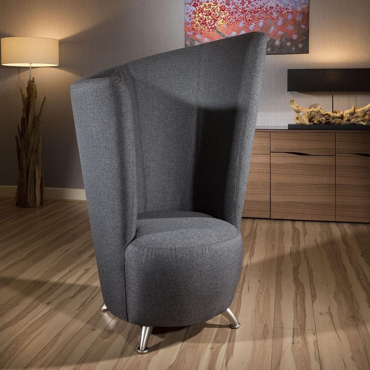 I love this high-back, curved armchair for its striking silhouette and contemporary appeal. Its grey fabric makes it versatile enough to suit a range of interiors, from modern minimalist spaces to more eclectic or even classic schemes. Because of its elevated height and enveloping shape, it creates a cosy nook, perfect for reading or relaxing. Practical styling tips include pairing it with layered lighting-perhaps a floor lamp nearby-and adding a textured throw or cushion to introduce some warmth and personality. This chair is particularly well-suited to living rooms, bedrooms, or home offices where it can serve as a standout accent piece that combines comfort with style.