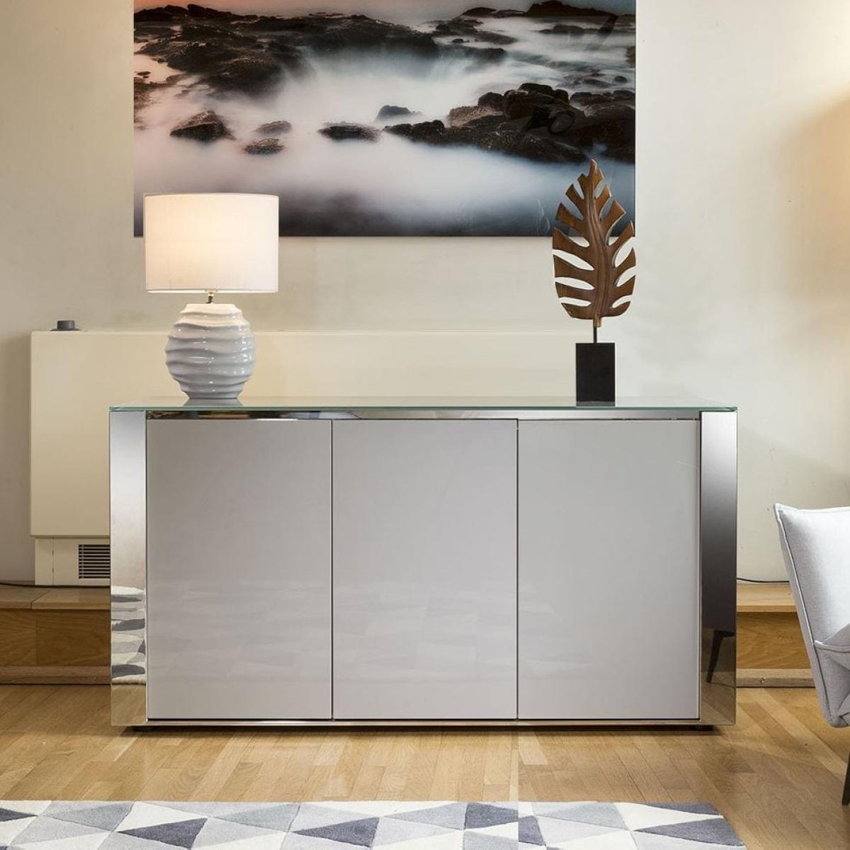 Elevate your living space with the Sophie 3-door sideboard. Crafted with precision and designed for the modern home, this fully assembled sideboard stands at an impressive 160cm wide. The cabinet features a glass top and sleek grey gloss finish exudes elegance, while the polished metal accents add a dash of glamour. Boasting an ultra-modern design, this sideboard cabinet features a sleek glass top that not only adds a touch of luxury but also provides a smooth surface for displaying decor, cherished keepsakes, or additional storage. The polished metal accents lend a contemporary edge, catching the light and creating a captivating interplay with the grey gloss finish. Durability meets style with our sideboard's sturdy metal frame construction, ensuring it withstands the test of time and remains a staple in your home for years to come. Whether you're storing dinnerware, linens, or other essentials, the spacious interior offers versatile organisation options, keeping your space clutter-free and organised. Embrace the future of interior design with this remarkable sideboard unit that seamlessly combines form and function, making it a must-have for those seeking a statement piece that embodies both elegance and practicality. W160cm D50cm H82cm Fully Assembed Includes internal shelving with vent/cable holes