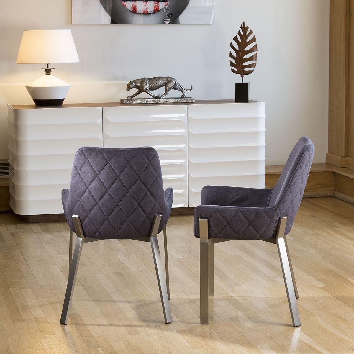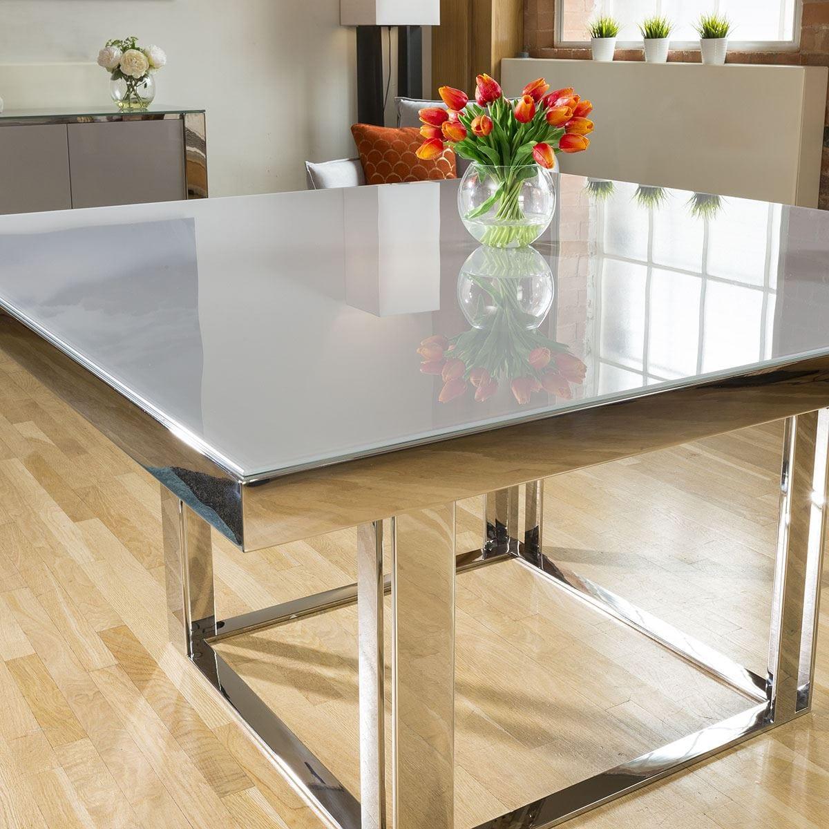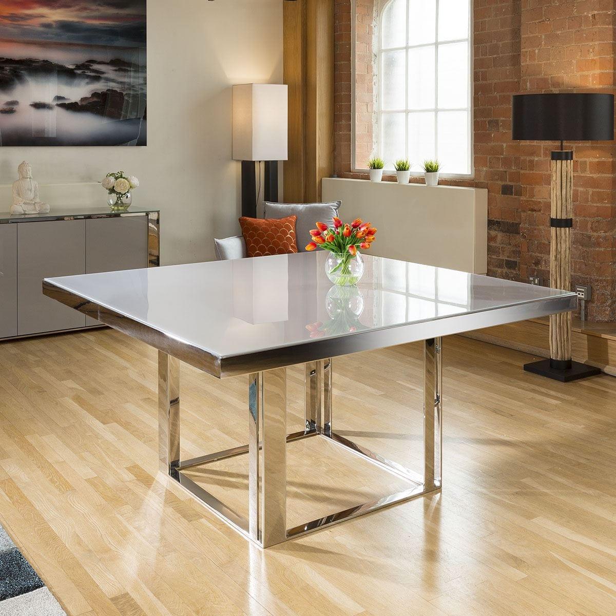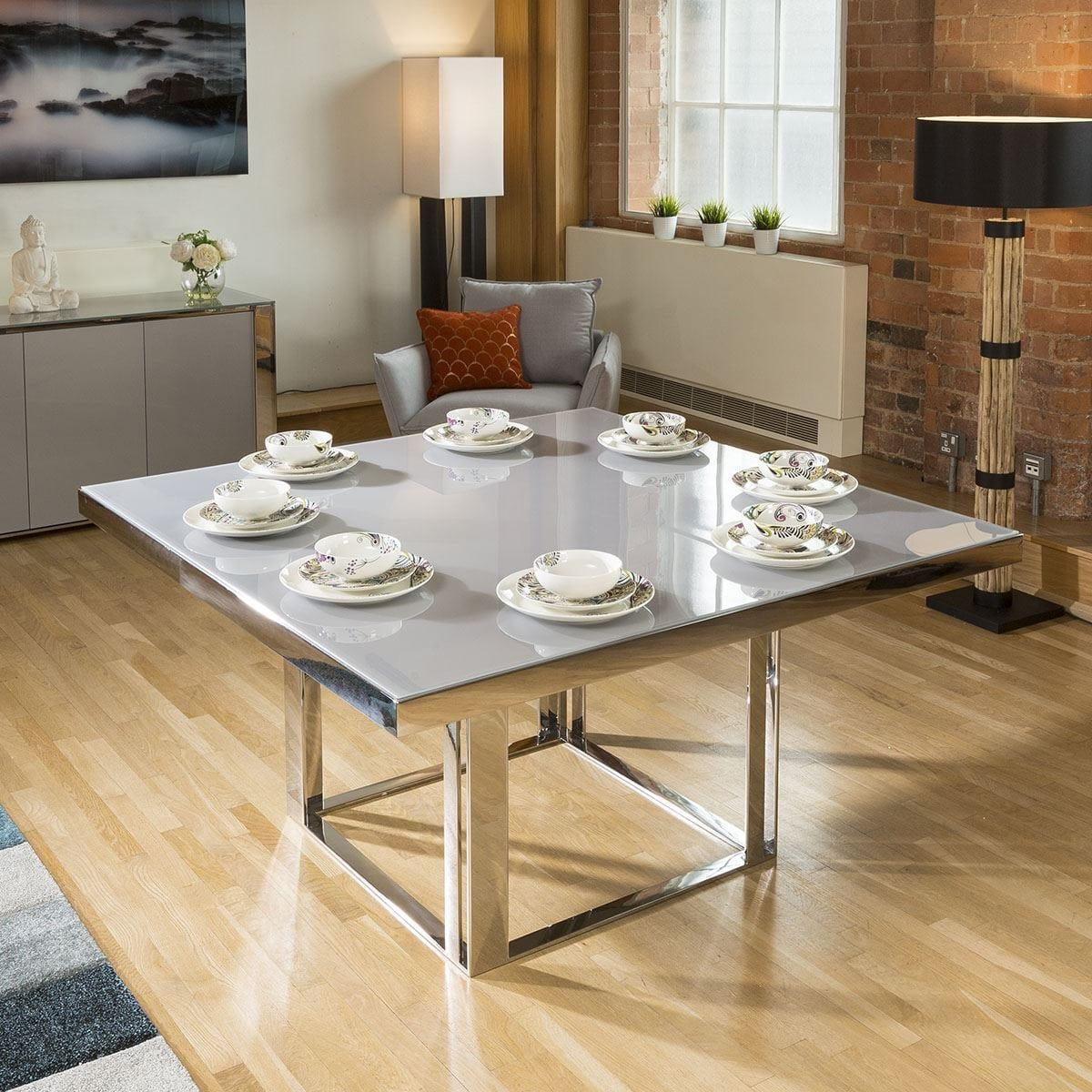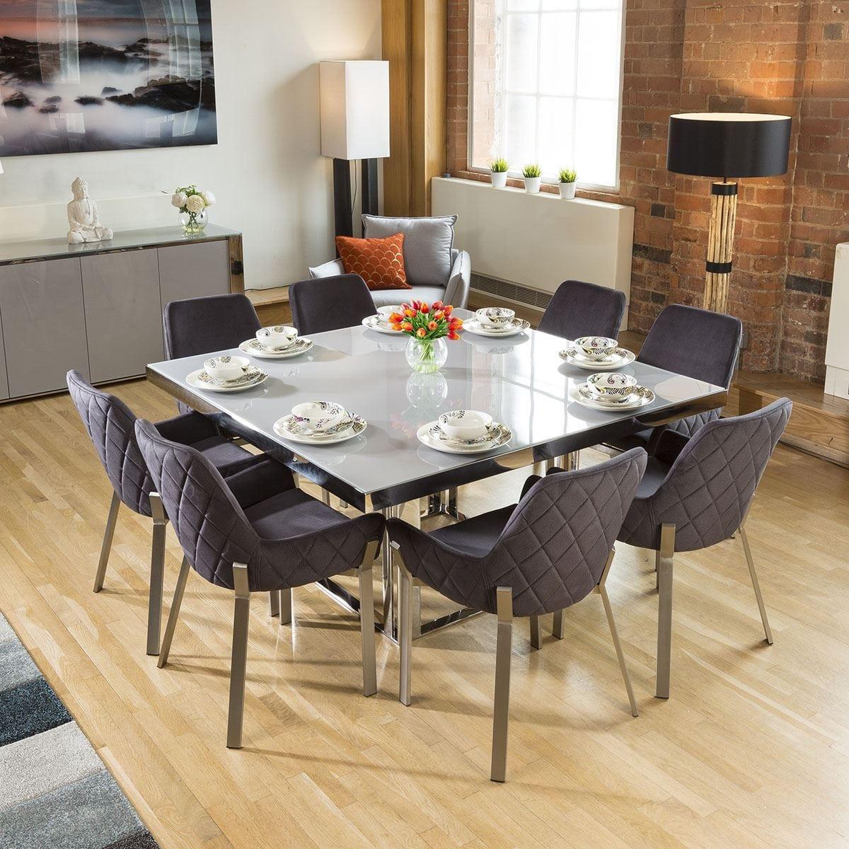 Introducing the Sophie range of designer furniture exclusive to Quatropi. This high end range exudes ultra modern style and features beautiful dove grey hi-gloss paint, matching grey glass and stainless steel frames and feet. The Sophie Dining tables all feature dove grey tempered glass tops and thick mirror finish stainless steel frames and legs. This square table is 1.5 meters and perfect for up to 8 large dining chairs The table is accompanied by 8 high end, Grey fabric carver chairs with detail stitching on the back. Superb quality and strength from this stunning design. Felt feet ensure no damage to any type of flooring. W150cm D150cm H76cm Stainless Steel Detailing Ultra-Modern Carver Dining Chairs with Arms