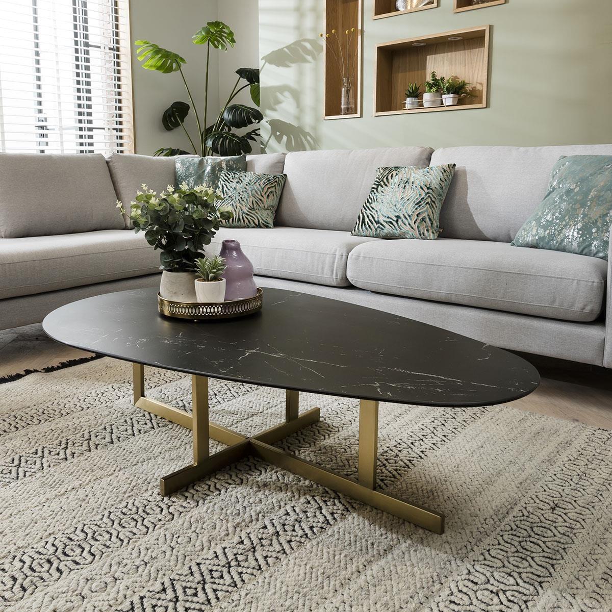 Sleek black marble combined with champagne brushed metal? So unique. Give the living area instant impact and a luxury feature with our Tesoro Oval Coffee Table, which is finely crafted to produce an elegant, curvaceous design. Multiple finishes on the coffee table provide harmonious contrast, the brushed champagne coloured refined metal legs elevate the range with an eye-catching angular design which complements the bold silhouette, together with the contrasting black ceramic marble top makes the coffee table so enchanting, hygienic & incorporates a modern twist to any interior. You can't miss the Tesoro Oval Coffee Table's proportions, sat atop a champagne coloured brushed metallic frame which accentuates its curvaceous tabletop. If you need more information about this product, use the Live Chat service to speak to the team or send us a message. Spread the cost our with interest-free finance options. Minimum spend applies. W130cm D80cm H35cm Black Ceramic Marble Top with Champagne Brushed Steel Leg Large Oval Coffee Table with Black Marble To