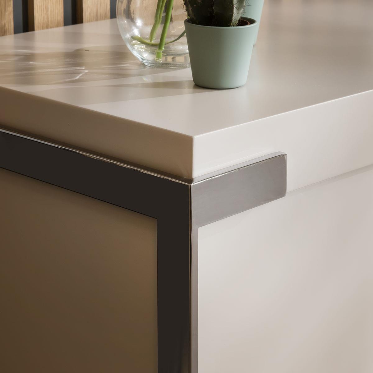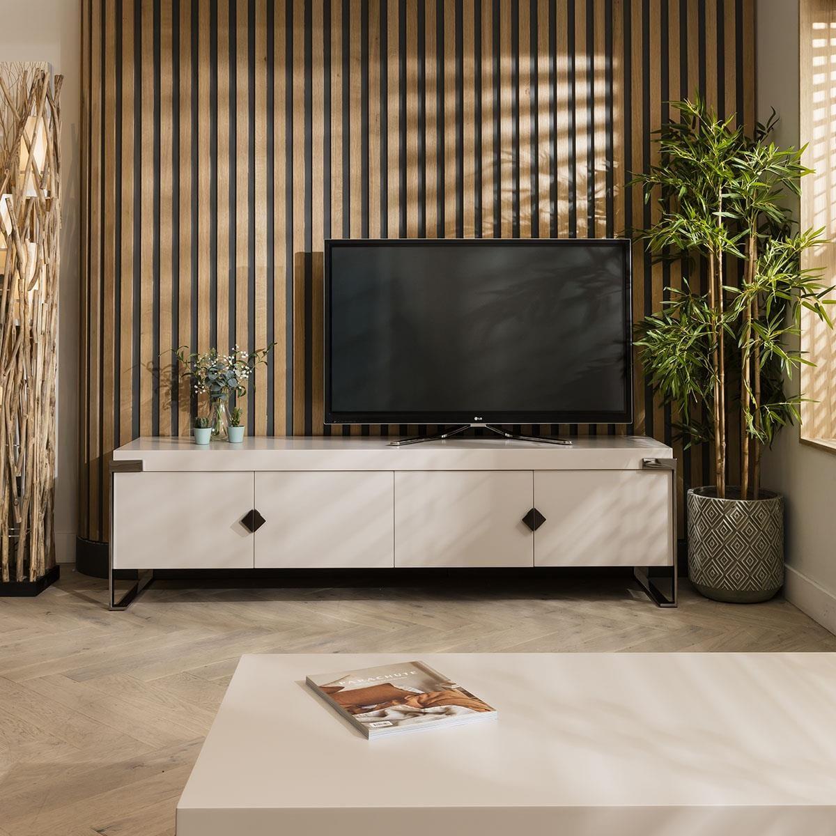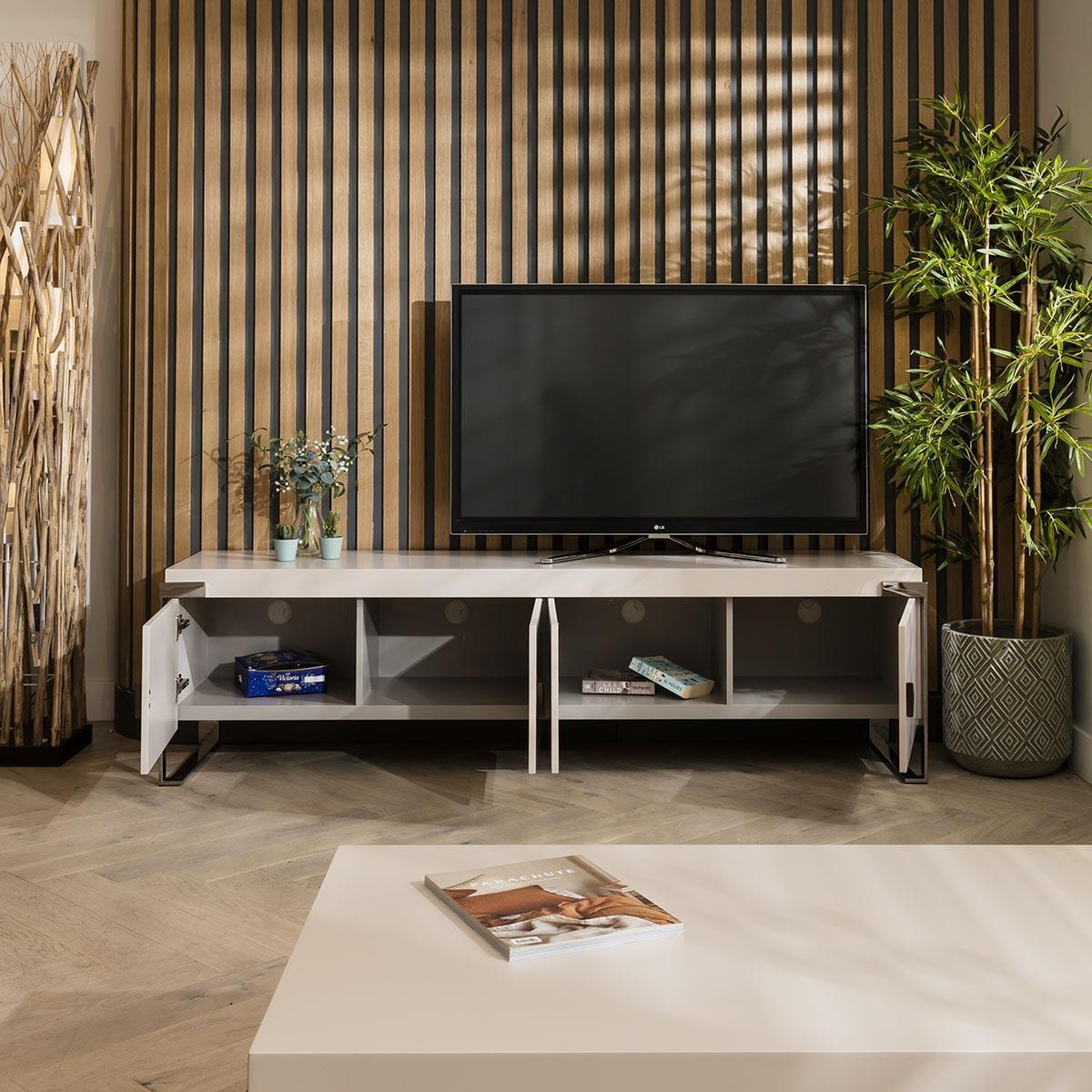 The Carbonado TV Stand spells a contemporary charm and a quintessential touch, while providing welcome surface space and storage. This TV unit is visually pleasing in its modern design, and is crafted with a premium matte Chalk painted finish encased by the sleek lines of the smoked chrome shaped into handsome legs. The 2 metre TV stand creates a visually appealing contrast, lending to the elegance of this addition to your living room with a stainless steel base and matte Chalk painted body, it's a perfect focal point of your living area or lobby. At Quatropi, we've got the complete range of TV stands and cabinets for ultra-modern interior decors, so whatever look you have in your living room, there will be a premium stand to complement it. We have everything from wood, glass and metal designs for a really smart showroom look. W202cm D47cm H56cm Modern Chalk & Smoked Chrome 2 metre TV Stand View matching items in the Carbonado range