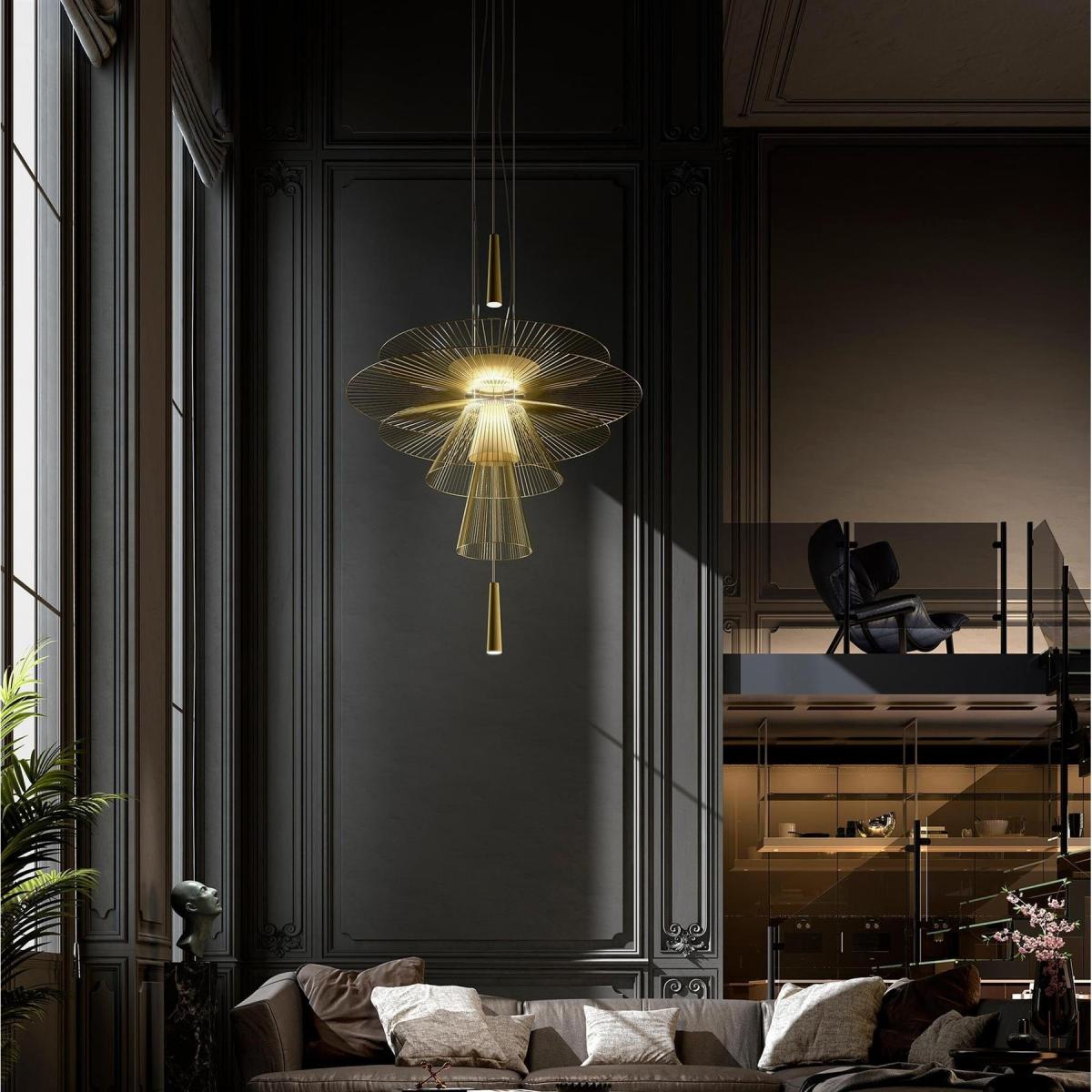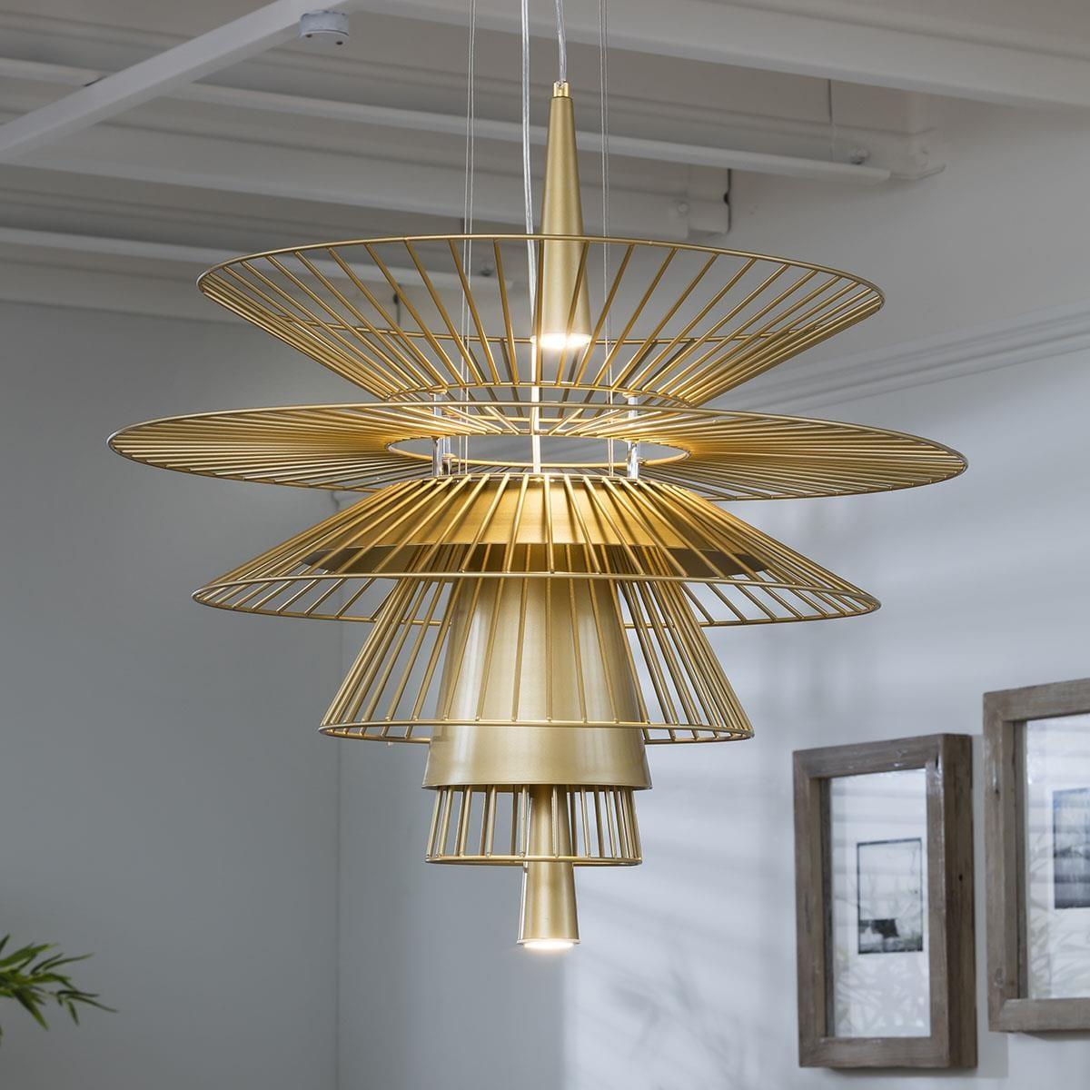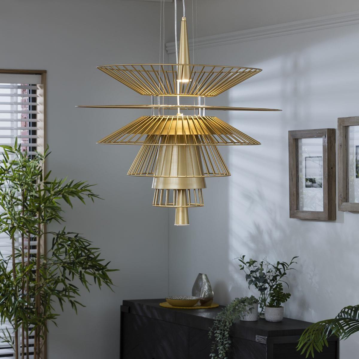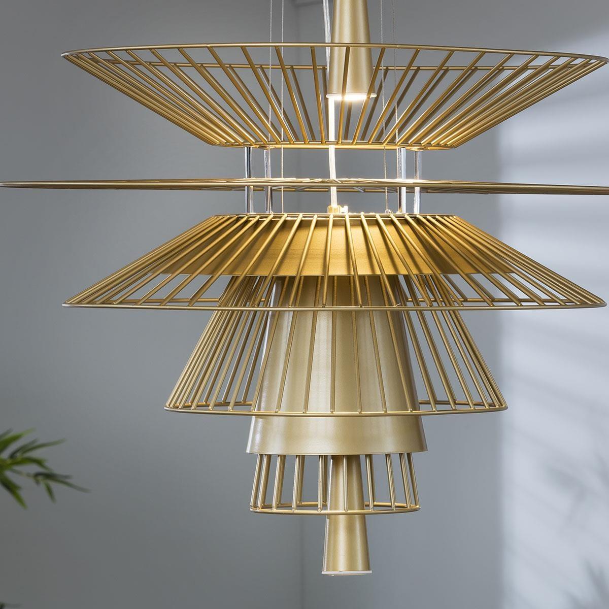 Round metal layers cover this modern layered ceiling chandelier, making it a low glare fixture with high levels of downward light. Enhanced with clean lines, minimal materials and satisfying design. The luxury ceiling light embodies everything we love about modern style, with a mix of ultra-modern edge and delicate elements. The LED ceiling light is crafted of high-quality metal, making it more durable, sturdy and has a luxurious gold finish that makes for a timeless style with elegant look. Self-assembly required. This fitting has an intricate design and should be assembled by someone that is very famililar with lighting components and self-assembly furniture. This oversized pendant is sure to be a standout feature. GU10 Bulbs Lightsource Power: 10W CCT: 3000. K W68cm D68cm H66cm Unique Gold Layered Chandelier Ceiling Ligh Includes GU10 Bulb