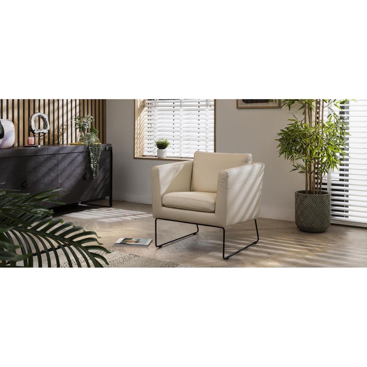 Our stylish Almond colour Aztec Accent Chair will introduce a modern, retro-inspired touch to your living space. The contemporary armchair has inviting proportions with metal legs and low profile back make this modern mid-century style accent chair standout showpiece. The Aztec leather occasional chair comes with generously filled, encapsulating supporting foam cushions with a soft-medium firmness for the highest level of comfort topped off with luxurious genuine leather, making it the perfect place to sit back and unwind on and a welcome addition to any home. If you need more information about this product, use the Live Chat service to speak to the team or send us a message. Spread the cost our with interest-free finance options. Minimum spend applies. W72cm D80cm H82cm 100% Genuine Leather Modern Leather Accent Chair