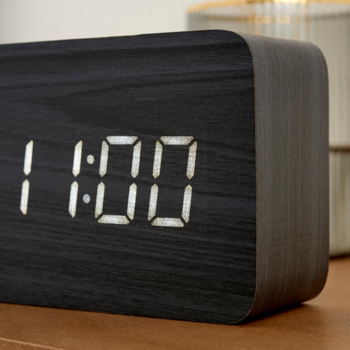 Designed with a black wooden finish, this stunning black alarm clock will complement an array of bedrooms with its fashionable look and design. Easy to read, this LED clock with a digital face and alarm is perfect for your home.