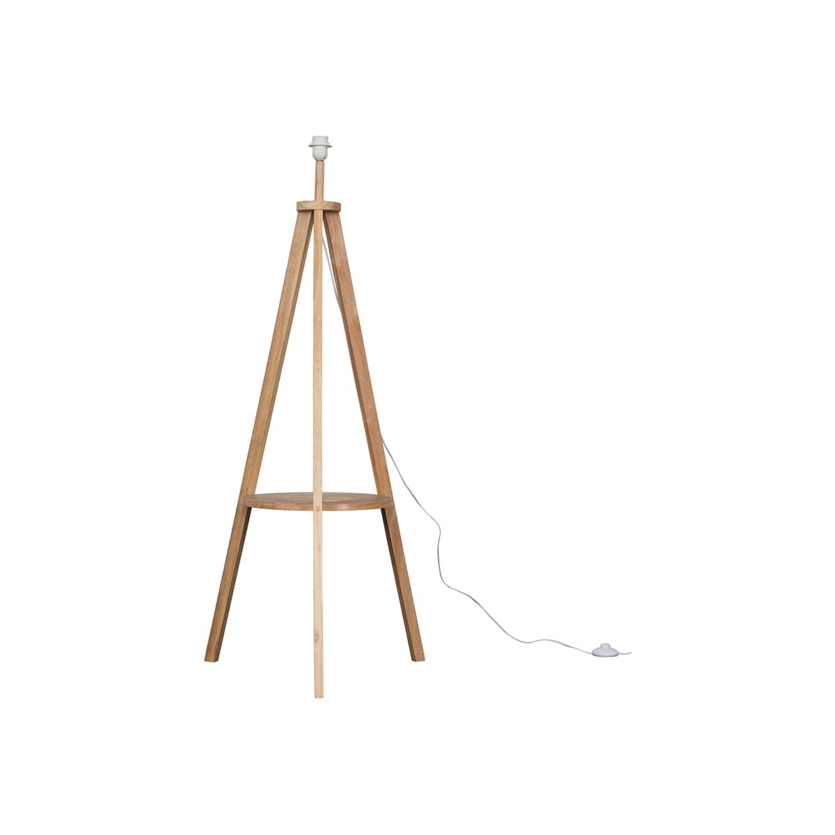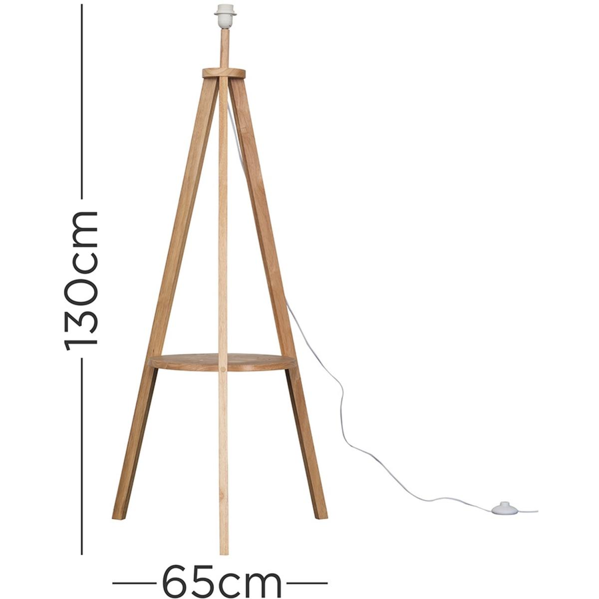 Modern tripod style floor lamp base in a light brown painted wood finish, complete with a shelf for convenient storage or to use as a decoration place. Features an in-line onoff foot switch for easy use. Floor lamps are a great way to bring additional lighting to a room or you can use them reduce your main light output, and create a more relaxing moodatmosphere. Lamp base only - pair with a shade of your choice.