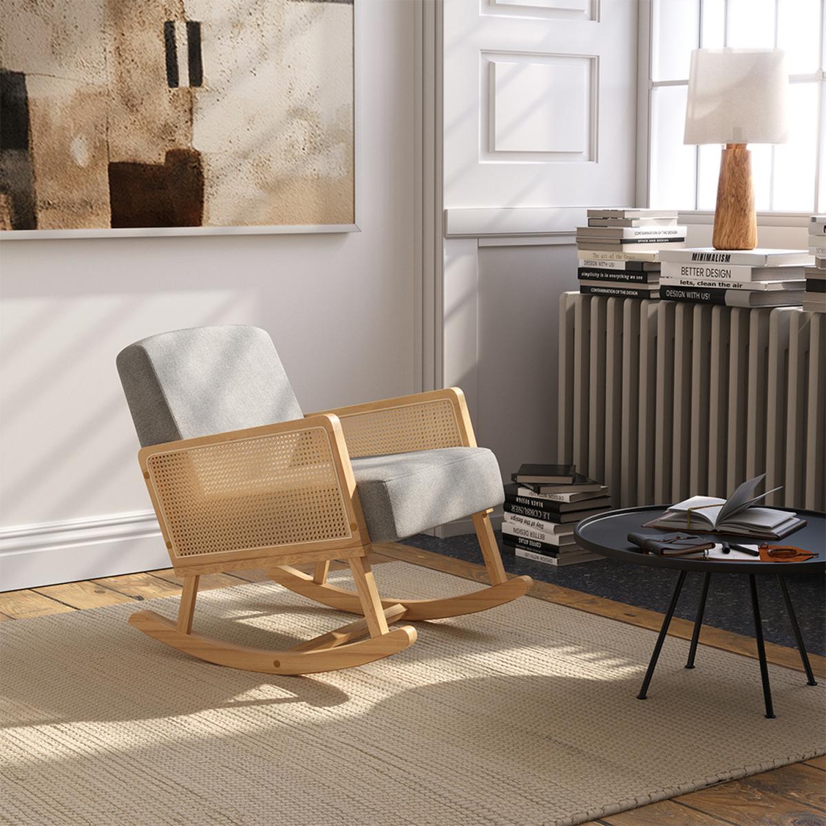 I love this grey rocking chair for its sleek, modern design combined with a touch of natural warmth from the wood. It’s a versatile piece that works beautifully in a range of interiors, from Scandi-inspired schemes to more contemporary, minimalist spaces. The neutral grey fabric keeps it understated yet stylish, making it easy to style with cushions or throws for added comfort. Practical tips include pairing it with a cosy throw or a little side table for your morning coffee to create a relaxed reading nook. Its understated elegance makes it a great statement piece without overwhelming the room, and the wood finish adds a natural, organic feel that complements both lighter and darker colour palettes.