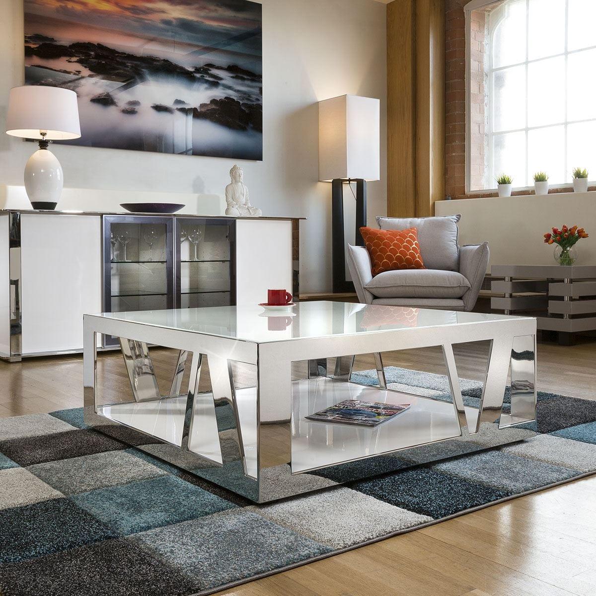 Quatropi's 216E. 2 1000mm Square White Coloured Glass Topped Coffee Table. This statement piece will be the talk of your living space with its eye-catching stainless steel base and lush white glass top. The Bali luxury coffee table ensures an influx of character, style and practicality on your home interior, the perfect piece for larger spaces and contemporary styled homes. Superb quality and strength from this stunning design. Beautiful high class lacquered White gloss wood base gives a truly unique look that's beautifully emphasised the table's designer look. The Quatropi "V" luxury coffee table ensures an influx of character, style and practicality for your home interior, the perfect piece for larger spaces and contemporary styled homes. W100cm D100cm H38cm High Gloss Finish Other Colours Available