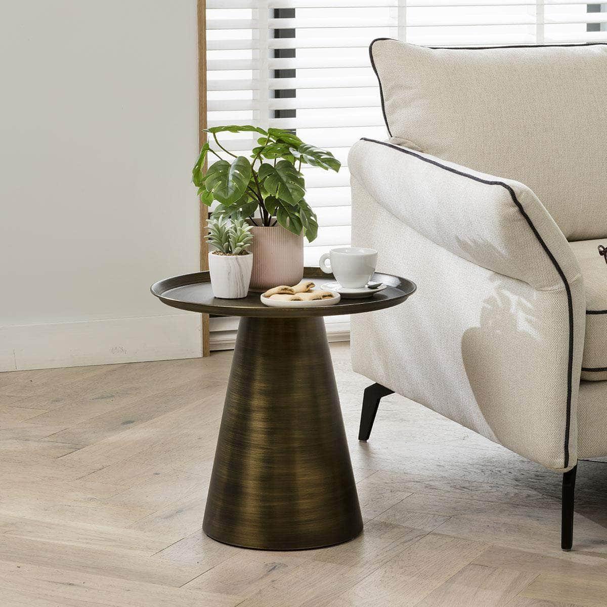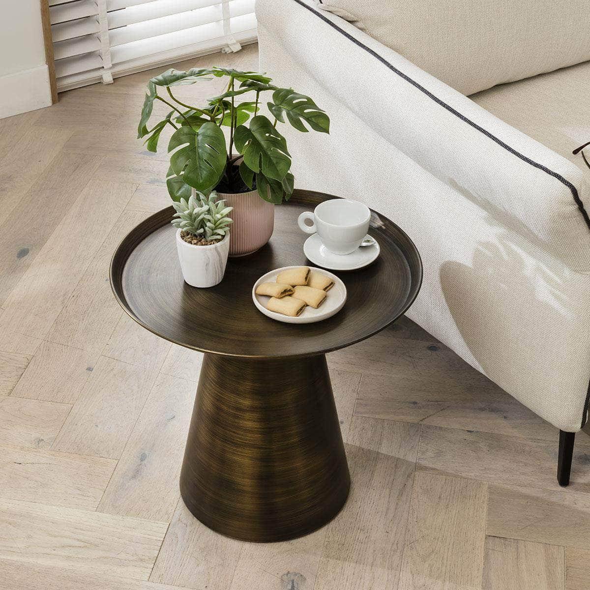 Add a retro flair to your space with the Auric gold pedestal side table. This sculptural lamp table design showcases a round gold metal cone-shaped base accent with a lipped tray top that adds functional decor to any seating space. Small enough to move about the room, the sturdy accent table adds elegant utility to your living room, reading nook or bedroom. Our modern Auric side table collection is as much a piece of art as a piece of furniture. It is an eye-catching addition to any living room when placed next to a sofa or a metal coffee table. W48cm D48cm H45cm Bronze Stainless Steel & Titanium Bronze Metal Cone-Shape Lamp, Side, Accent Table