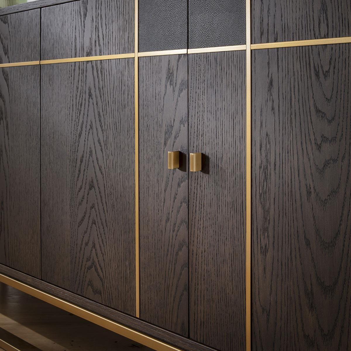 Elevate your space with this modern oak sideboard. At 180cm wide, this dark wood sideboard showcases a rich stained oak veneer with sleek gold metal accents and grey shagreen detailing. Designed for style and function, its a fully assembled contemporary oak sideboard perfect for any interior. Crafted from premium stained oak veneer in a deep brown hue, this wooden sideboard blends luxury and modern aesthetics. The natural wood grain brings warmth to your room, while its gold metal base frame adds a touch of glamour, making this piece ideal as a buffet or storage cabinet. The sideboard features four sleek doors adorned with gold metal strip accents and grey shagreen panels. Behind the doors, youll find a spacious storage solution with a shelf in each compartment, making it the perfect cabinet for organising essentials. This large brown oak sideboard arrives fully assembled, ensuring convenience and immediate use. Its robust structure and premium finishes make it a stylish, practical addition to any dining room, living space, or office. W180cm D40cm H86cm Preassembled Large Sideboard Cabinet