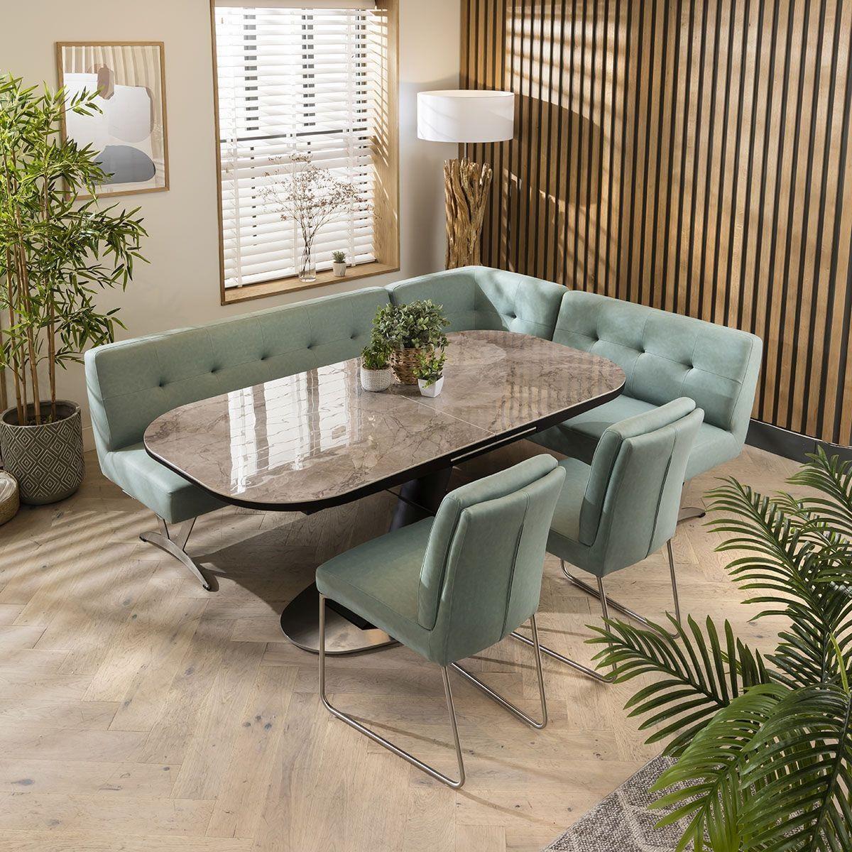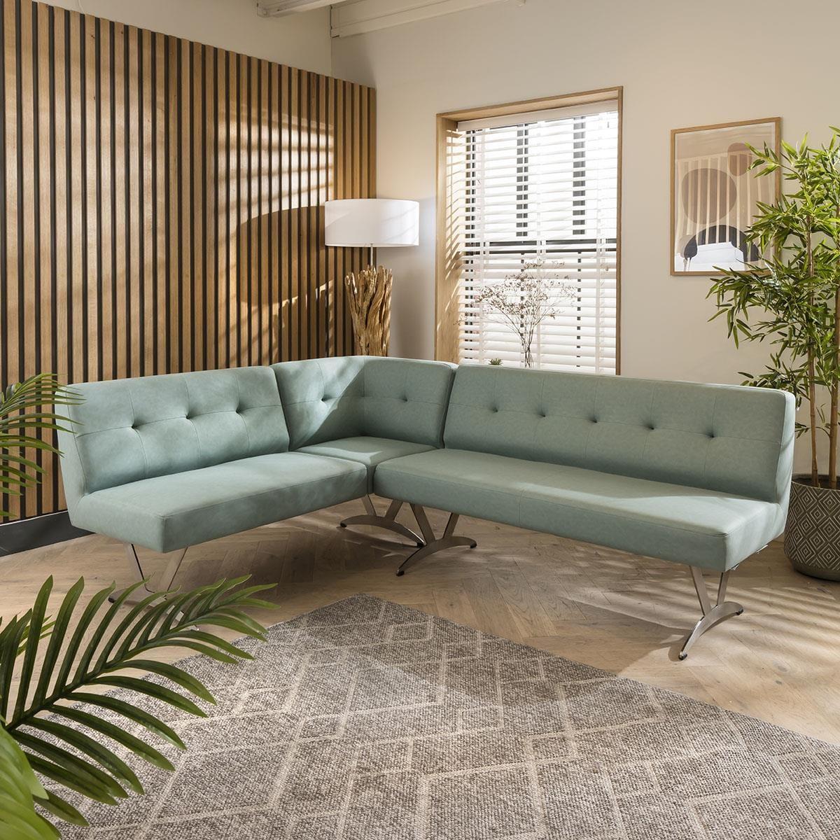 The Taylor Corner Dining Bench is a sleek and versatile seating solution, designed to enhance your dining space with style. Seating up to 5 people, this dining bench seat is perfect for social gatherings. Its comfortable cushioning and soft upholstery in mint green suede fabric will leave your guests impressed. Crafted with an eye-catching ultra-modern design, this corner bench effortlessly combines elegance and functionality. The tufted upholstery adds a touch of sophistication, making it a stunning addition to any contemporary interior. The brushed stainless steel legs provide a sturdy and durable base, ensuring long-lasting use and stability. Not only does this dining bench offer exceptional style, but it also offers versatility. You can easily configure it to fit your space by choosing between left or right-hand placement. This adaptability allows you to optimise your dining area, no matter the size or layout of your room. Indulge in the luxury of comfort and aesthetic appeal with our Taylor corner dining bench. Whether you're enjoying a cosy family meal or hosting a dinner party, this dining bench provides the perfect seating solution. Upgrade your dining experience and make a statement in your home with this modern and versatile piece of furniture. W217cm D168cm H83cm Seat Height 49cm, Seat Depth 47cm Left or Right Hand Corner Dining Bench in Green