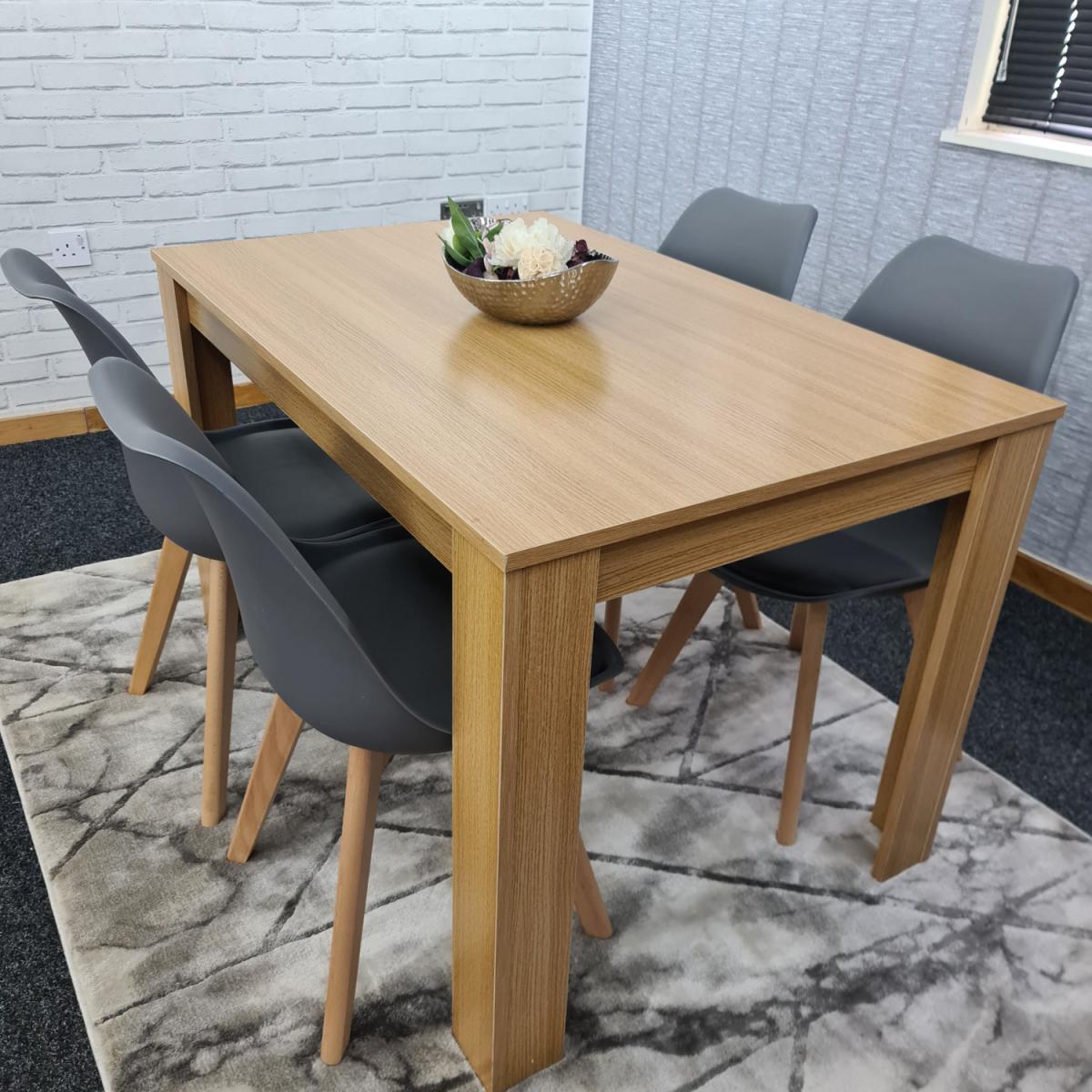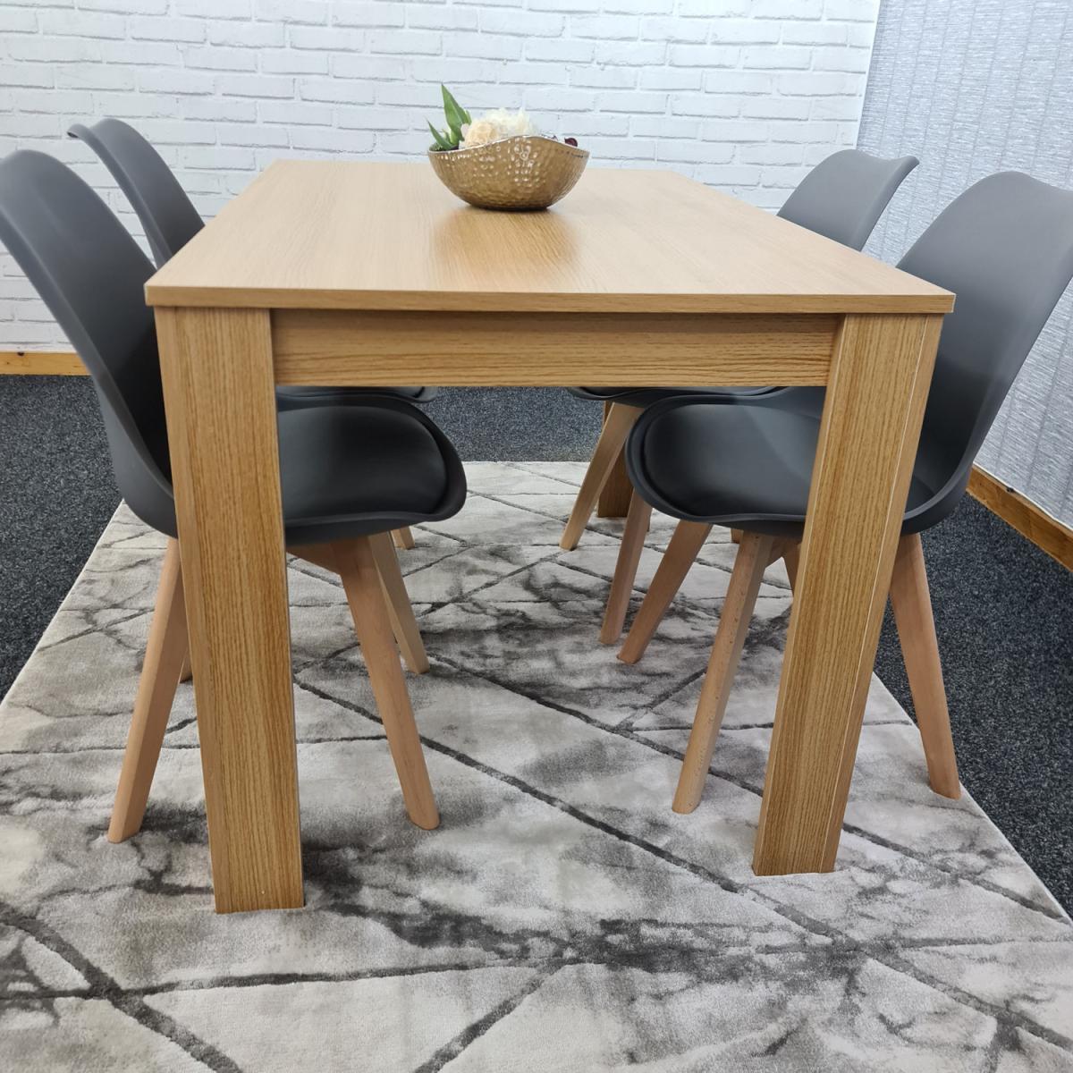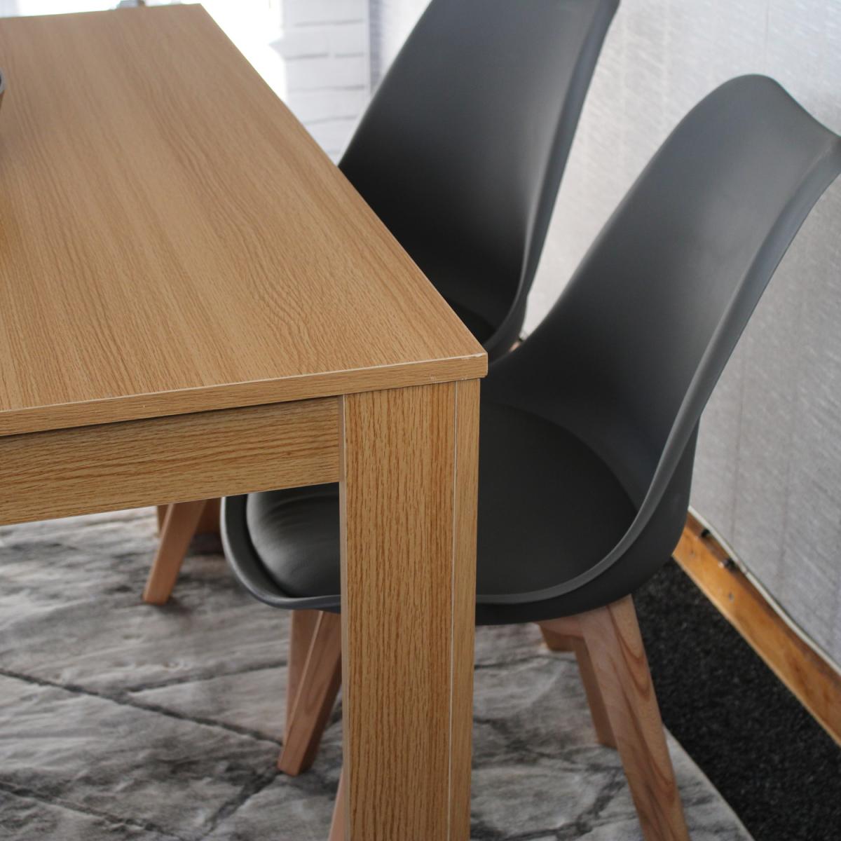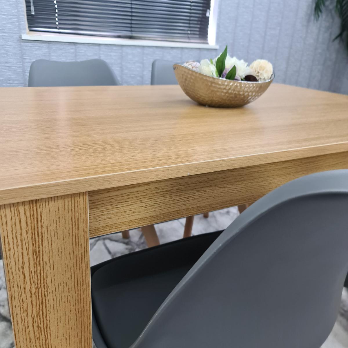A Stunning wooden Dining Table set with 4 gorgeous dark grey tulip chairs. Transform & brighten your dining area with this stunning, contemporary dining table with 4 dark grey tulip chairs. The chairs are of a classic design, the plastic curved so sophisticatedly and it has a cushioned leather seat for that extra comfort. The table is made from wood (oak effect) and has a melamine laminated Light Oak natural wood grain finish which looks great and is easy to wipe clean. The item comes flat packed and requires some home assembly.