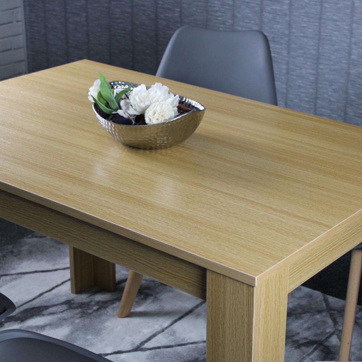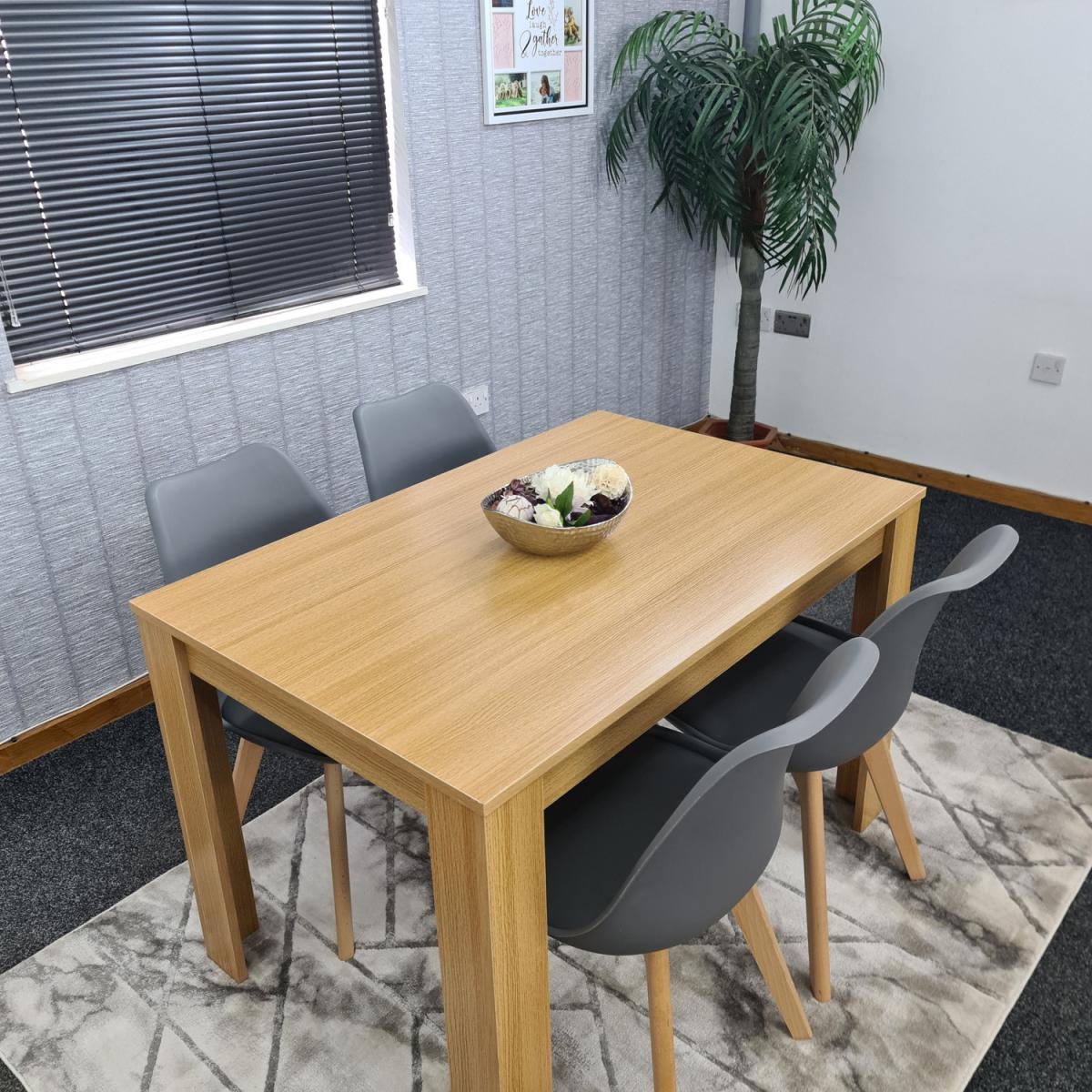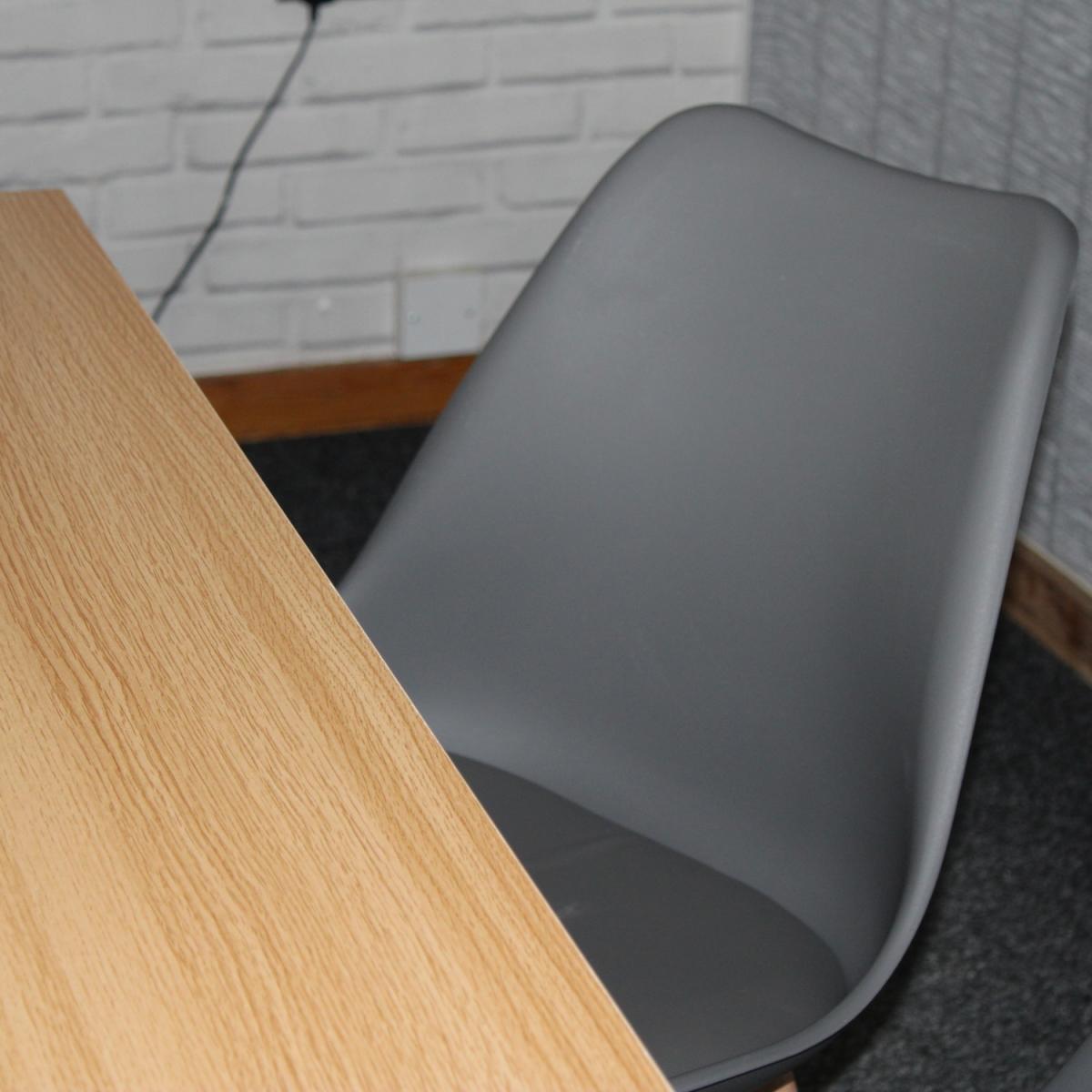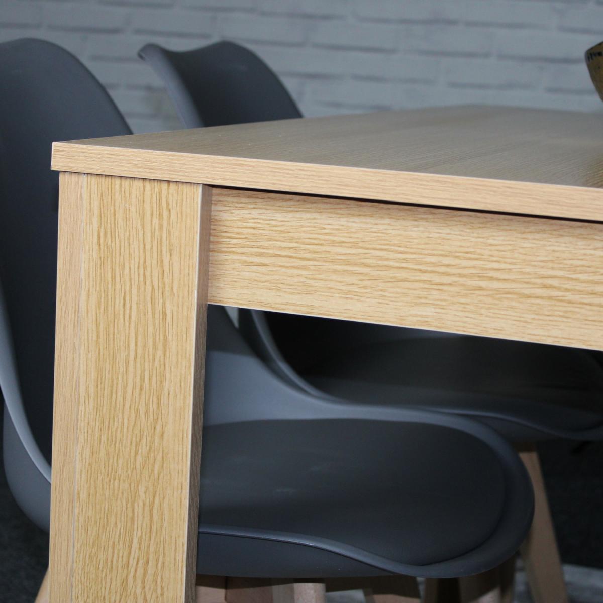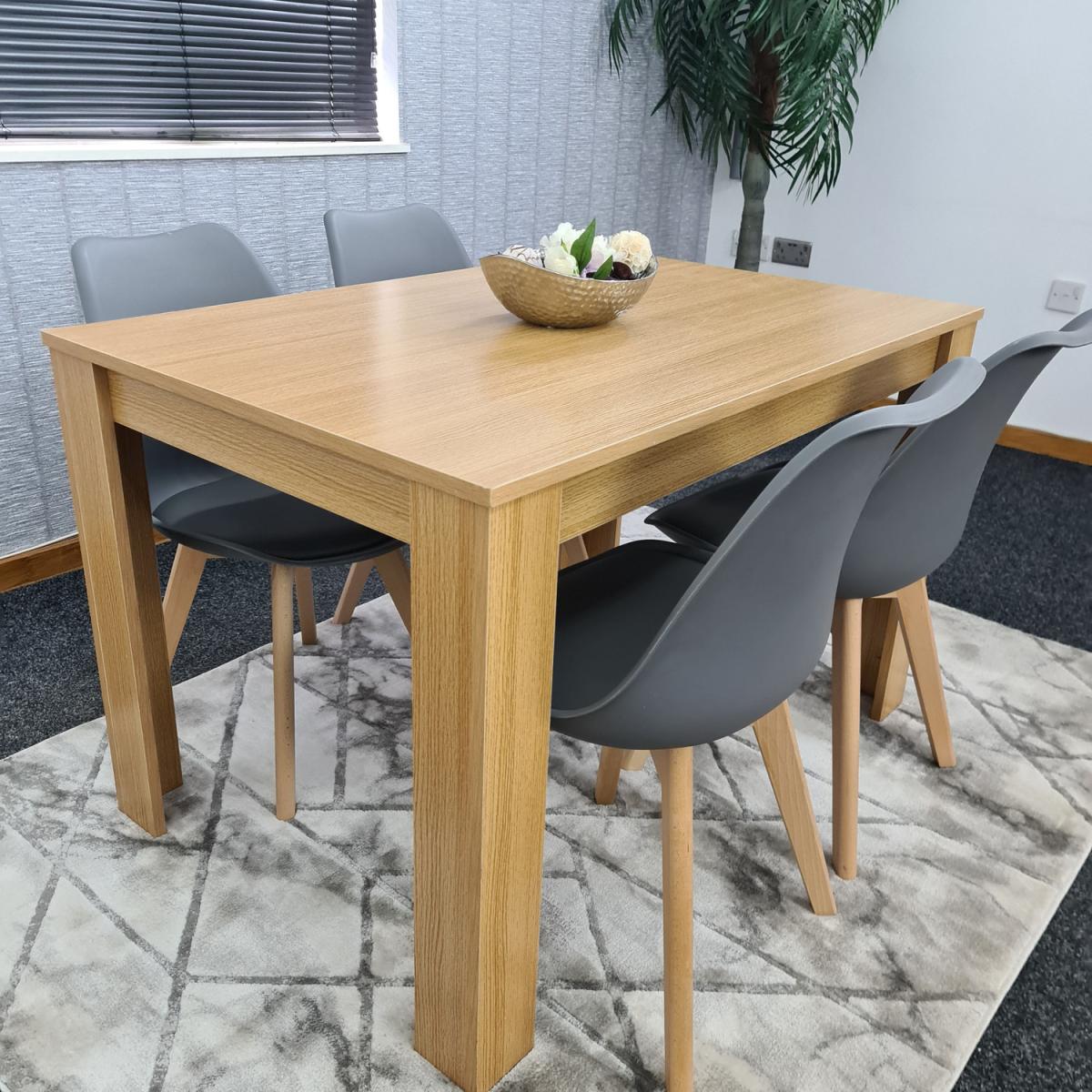 A Stunning wooden Dining Table set with 4 gorgeous dark grey tulip chairs. Transform & brighten your dining area with this stunning, contemporary dining table with 4 dark grey tulip chairs. The chairs are of a classic design, the plastic curved so sophisticatedly and it has a cushioned leather seat for that extra comfort. The table is made from wood (oak effect) and has a melamine laminated Light Oak natural wood grain finish which looks great and is easy to wipe clean. The item comes flat packed and requires some home assembly.