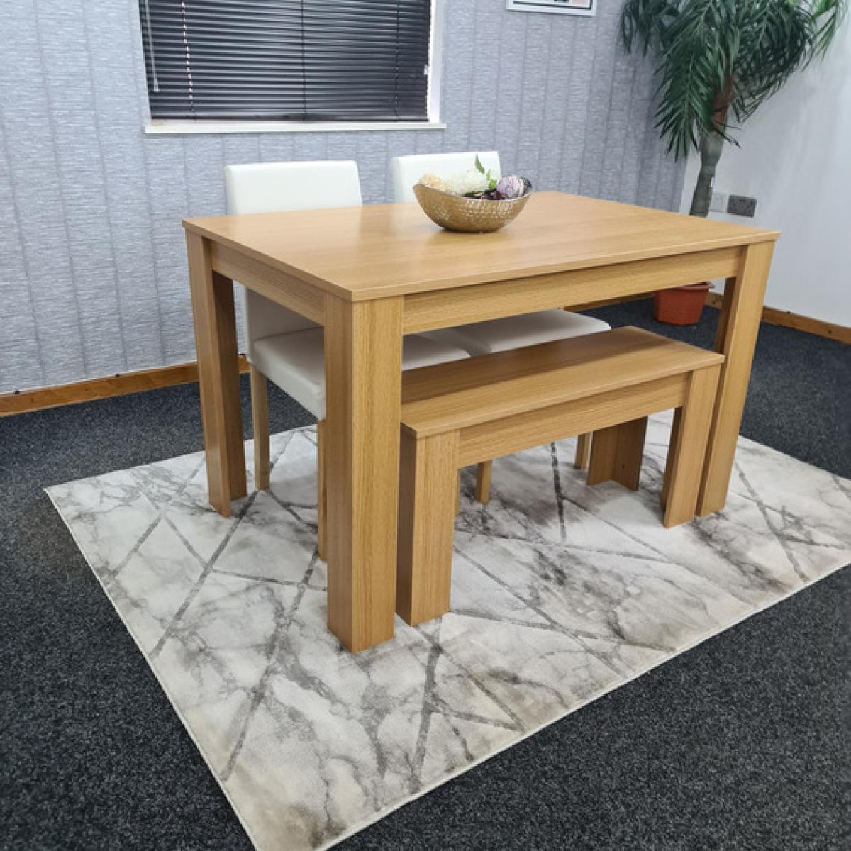 I love this piece because it offers a versatile and practical dining solution, perfect for both casual and contemporary interiors. The oak effect gives it a warm, natural feel that works especially well in Scandi, minimalist, or farmhouse-styled spaces. The inclusion of two cream chairs and a bench provides flexibility, making it ideal for smaller rooms or those wishing for adaptable seating options. For styling, consider adding neutral or muted-toned tableware to enhance its understated elegance, or introduce colourful accessories for a more lively vibe. To keep it looking fresh, pair it with textured rugs and simple centrepieces - a bowl or a small plant can elevate the look without overwhelming the overall aesthetic.