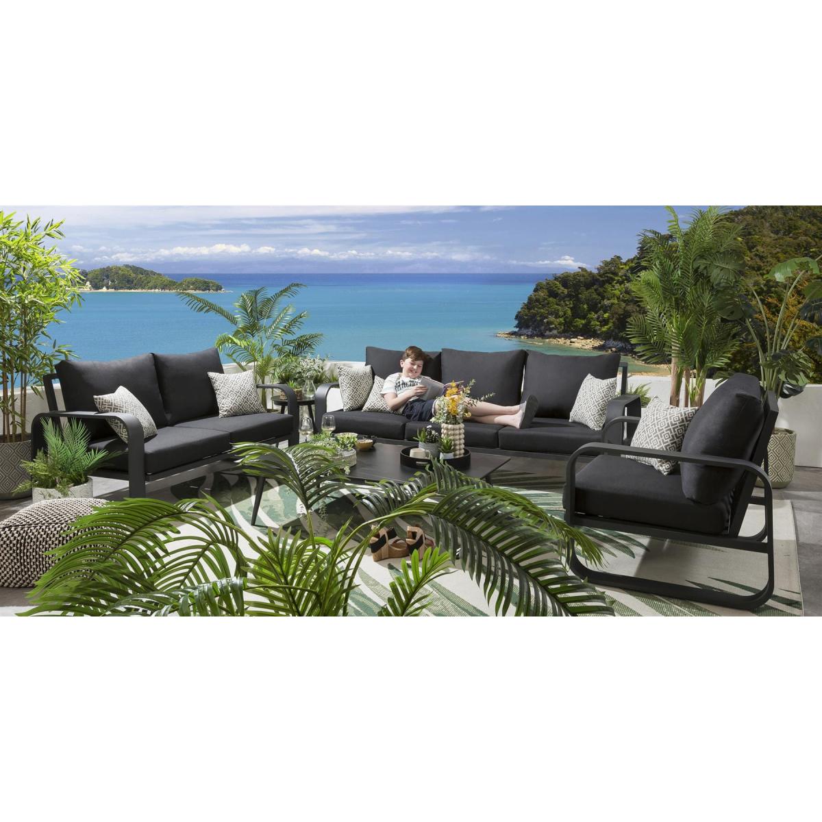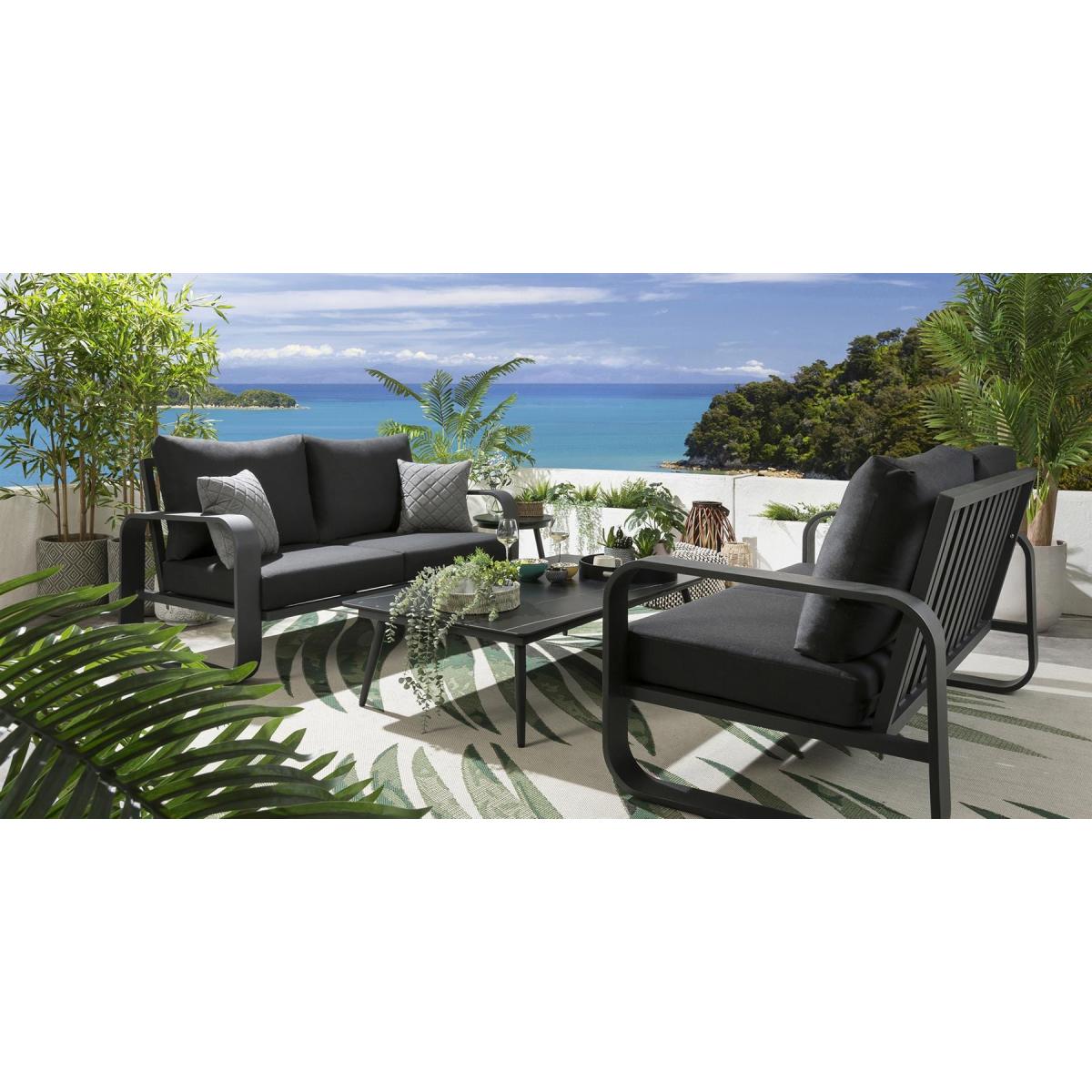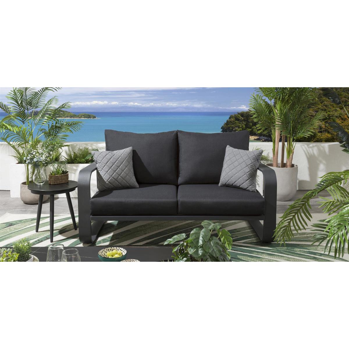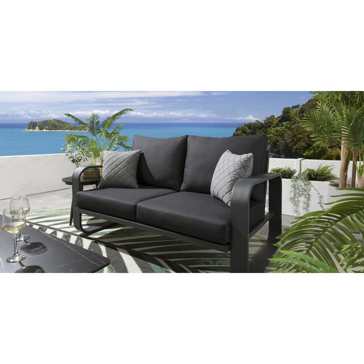 Not only does the Quatropi Freddy ultra modern Garden Sofa Range look great, but it is also designed to withstand the elements, making it ideal for outdoor use. The deep, soft cushions provide maximum comfort, while the oversized aluminum frame ensures durability and stability. The dark grey aluminium frames and cushions offer a dramatic and contemporary look to any outdoor space, If you need more information about this product, use the Live Chat service to speak to the team or send us a message. Spread the cost our with interest-free finance options. Minimum spend applies. W160cm D92cm H84cm 5 Year Warranty Free Winter Cover
