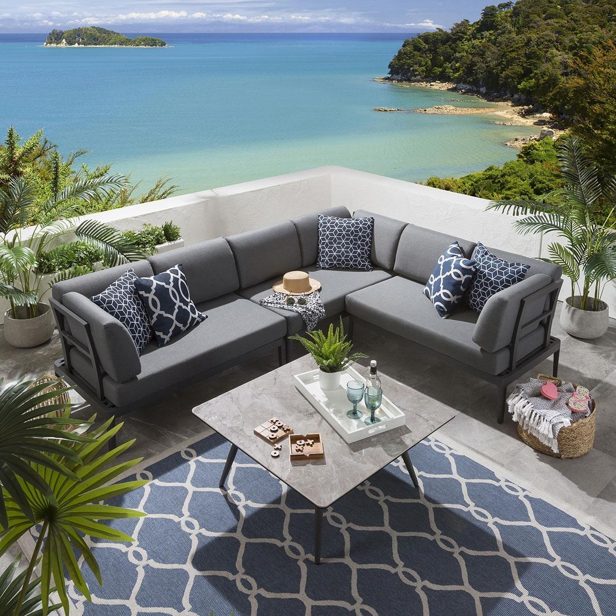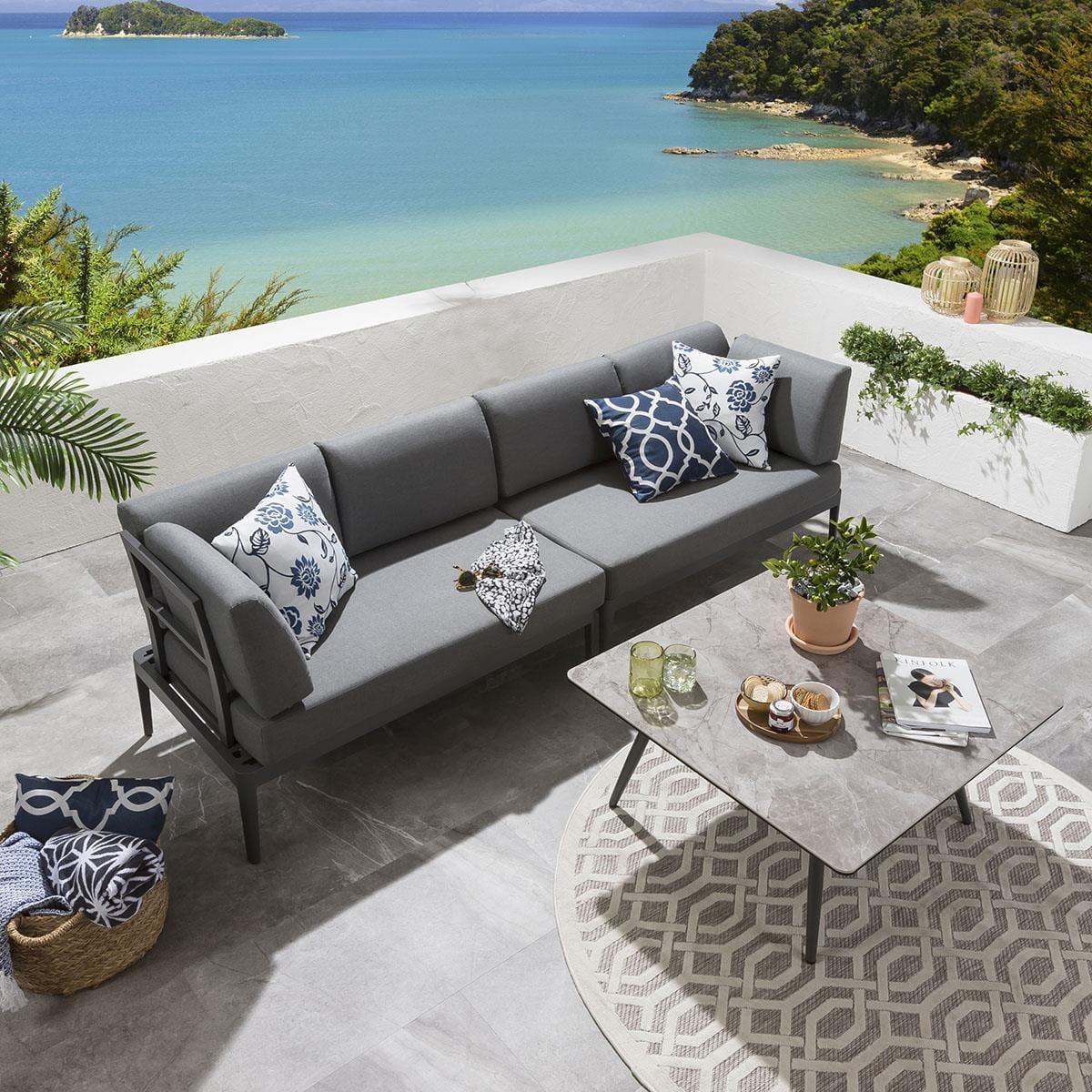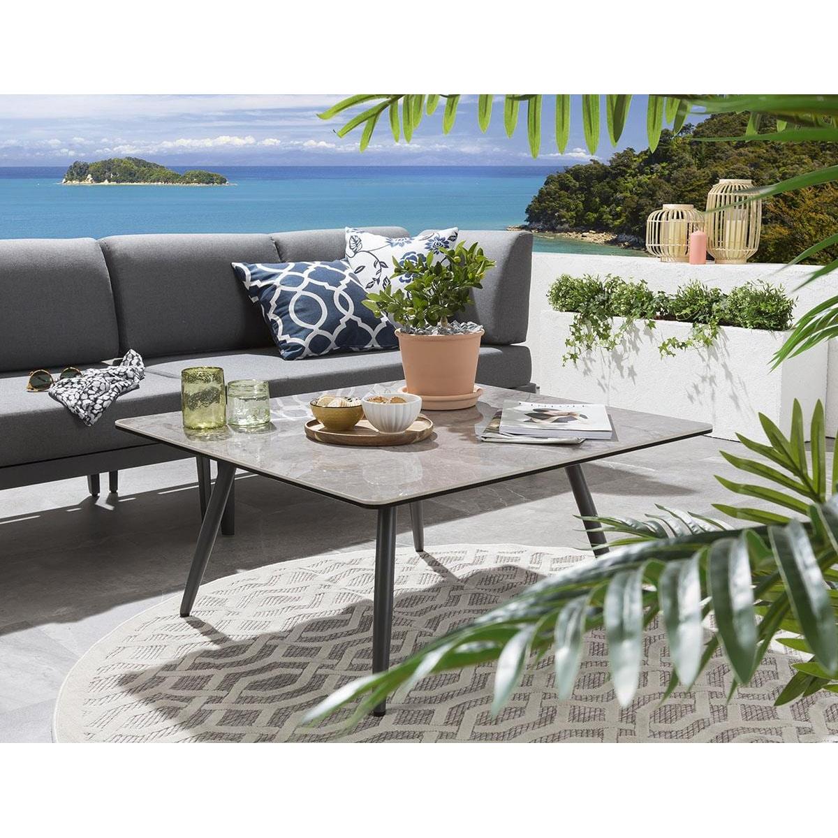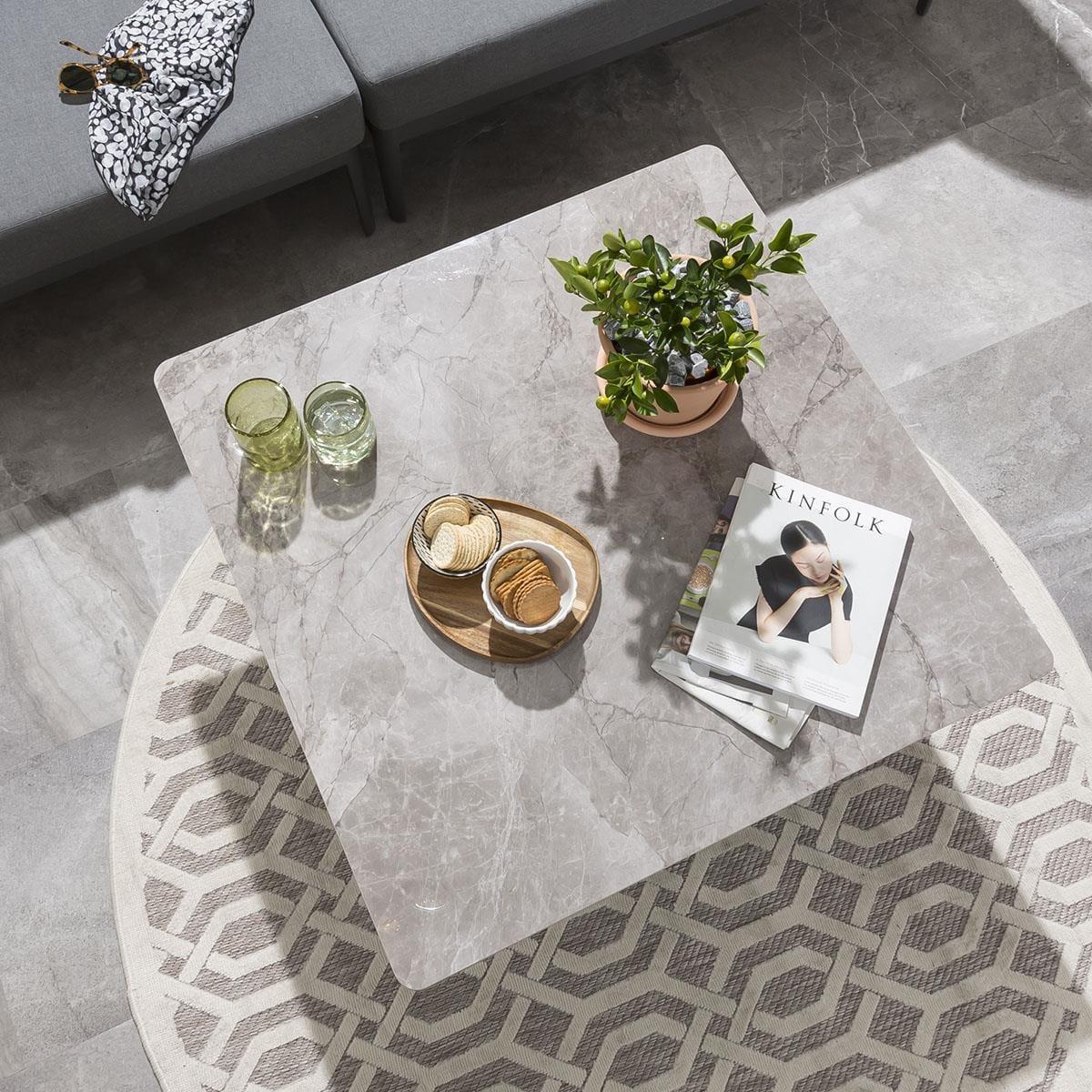 It's a brilliant addition to any contemporary, modern or minimalist outdoor garden seating area, this square grey coffee table table with a premium ceramic marble effect top provides somewhere convenient to place your drinks while enjoying the sunshine in comfort. Made from robust and ultra-durable ceramic in a natural smooth grey marble-effect finish, atop a hard-wearing grey aluminium metal frame, this luxury coffee table is a beautiful complimentary piece for luxury garden sofa sets. Expertly crafted aluminium frames are highly durable, complemented by clean lines that lend contemporary style. It is robust and weather-resistant for outdoor use & aluminium frames will not rust and are lightweight to move around. W90cm D90cm H42cm Grey Garden Coffee Table with Ceramic Top Ceramic is scratch, stain and heat resistant