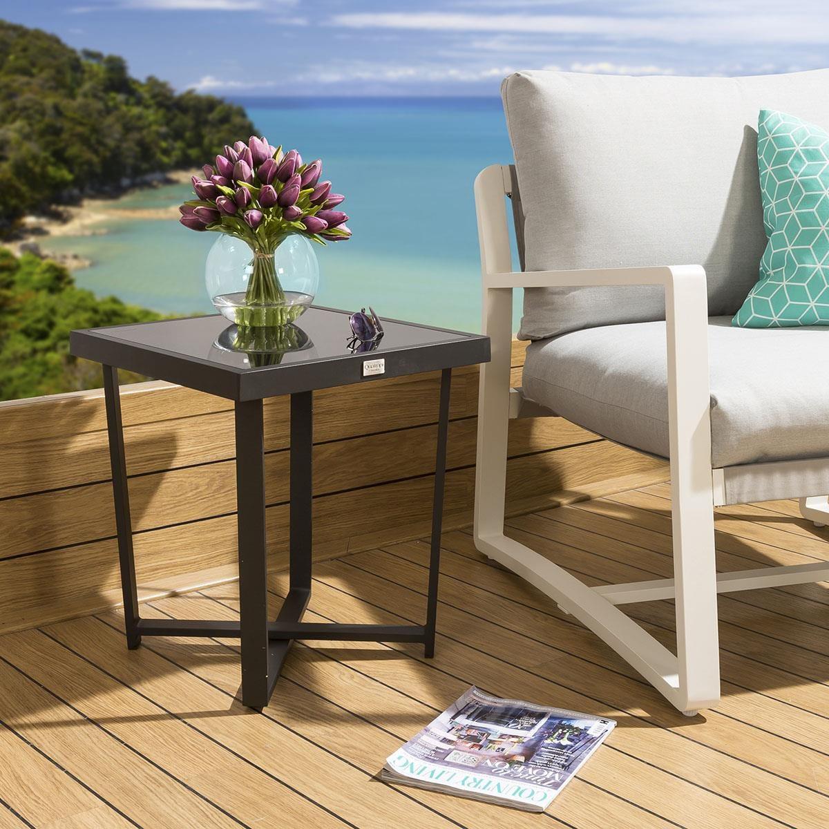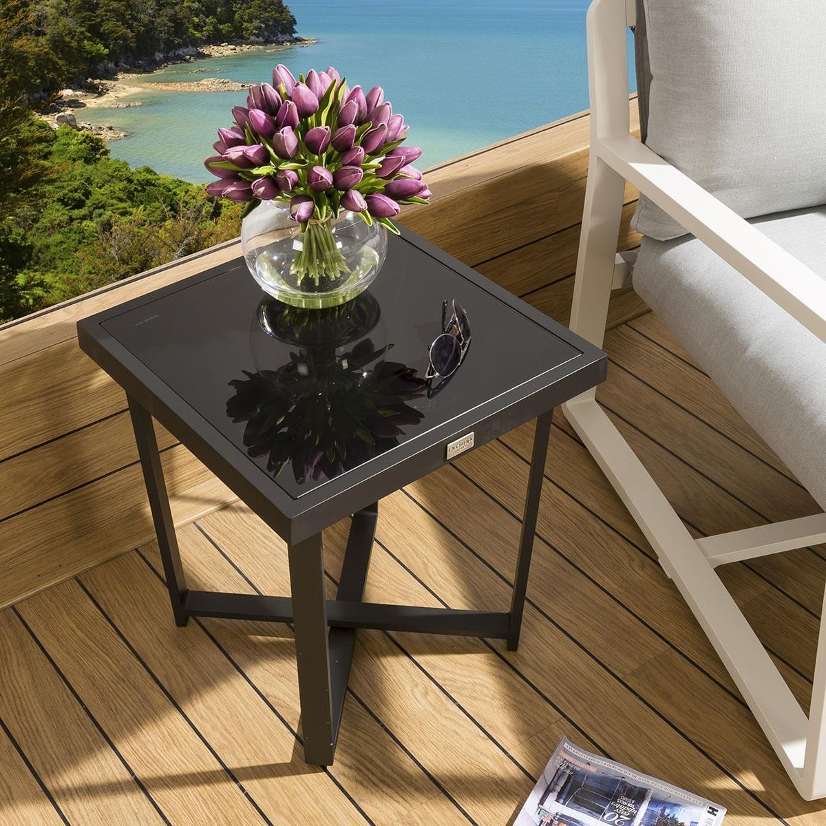 The 1911 garden end table in black by Quatropi is an essential addition to a full 1911 lounger set. The table is made from high-grade aluminium which makes it very lightweight and easy to change around when the occasion dictates. The side table design pulls on the minimalist inspiration behind the aluminium 1911 garden furniture range, with a bold cross leg design and hard-wearing black glass top. Complete the set with matching 1911 stackable sun loungers. Aluminium garden furniture requires very little maintenance, making it the perfect choice for fuss-free dining. You won't need to scrub it or treat it, just an occasional wipe down with warm soapy water and a clean cloth to keep it looking its best. Great garden furniture can enhance and complement your garden or balcony, as well as expanding your socialising options beyond the living and dining room. Investing in your outdoor living space can pay great dividends in the spring and summer months, opening up your choices for al fresco dining, garden parties and evening cocktails. Welcome in the beautiful spring and summer months with a gorgeous patio lounger set, the quintessential option for tranquil relaxation with a refreshing cocktail and a good book. These sets offer a relaxing and comfortable option for your back garden or outdoor space. If you need more information about this product, use the Live Chat service to speak to the team or send us a message. Spread the cost our with interest-free finance options. Minimum spend applies. W45cm D45cm H50cm Modern Garden Furniture Premium Quality Furniture