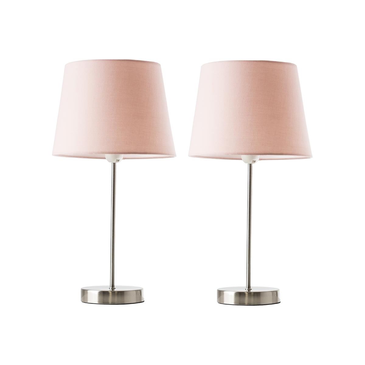 Modern Pair Of Satin Silver Table Lamps With Pink Shades - Silver
