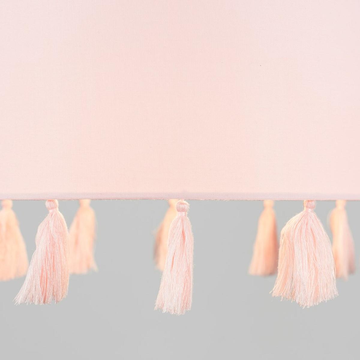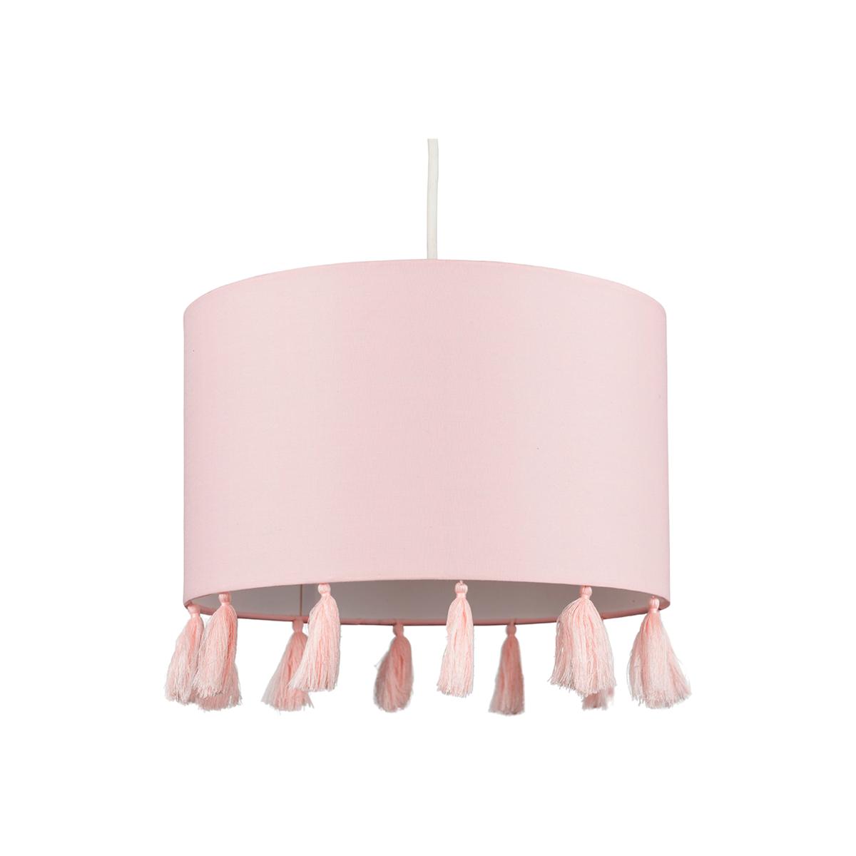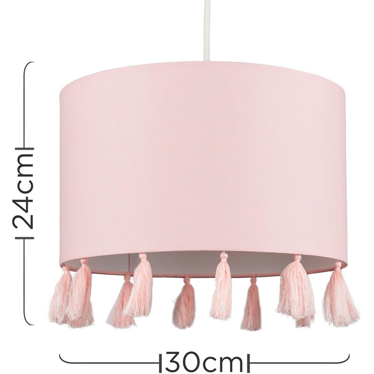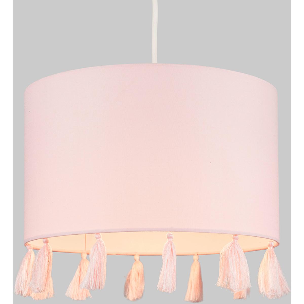 Modern cylinder ceiling pendant light shade in a pink fabric finish, complete with pink tassels. Easily fits to your standard ceiling light socket - no wiring required. Ideal for lounges, dining rooms, bedrooms and hallways.