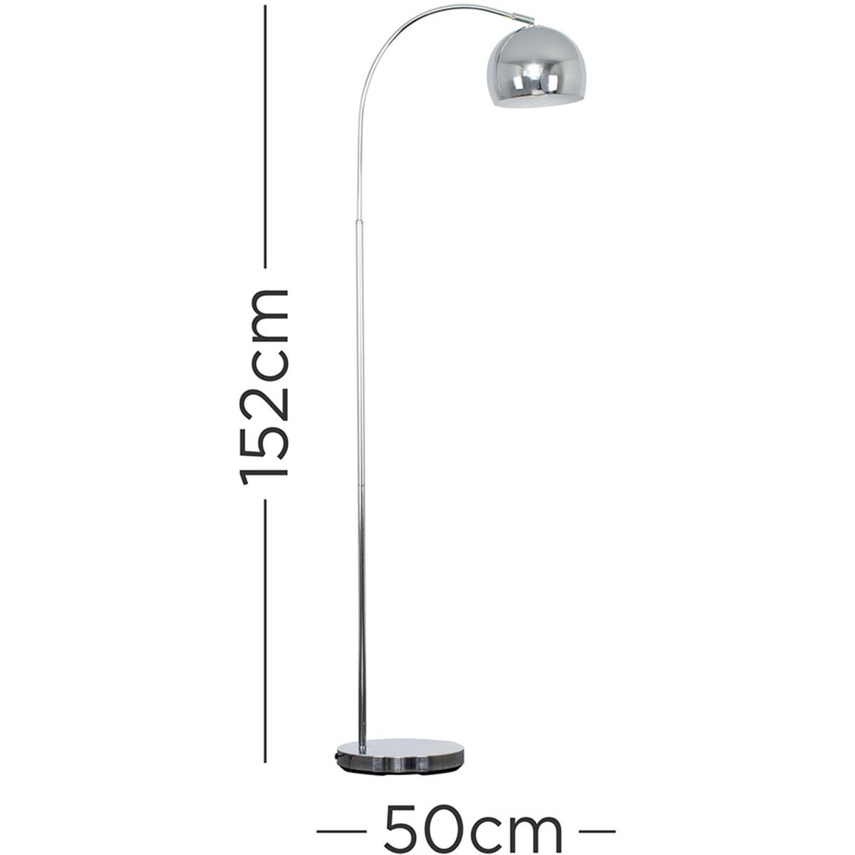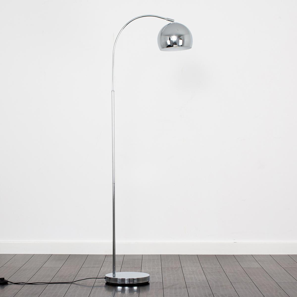 Modern designer style curved stem floor lamp in a polished chrome metal finish, complete with a polished chrome, white inner metal dome light shade. This contemporary floor lamp is guaranteed to make a statement in any home. Ideal for lounges, dining rooms, bedrooms and other living areas.