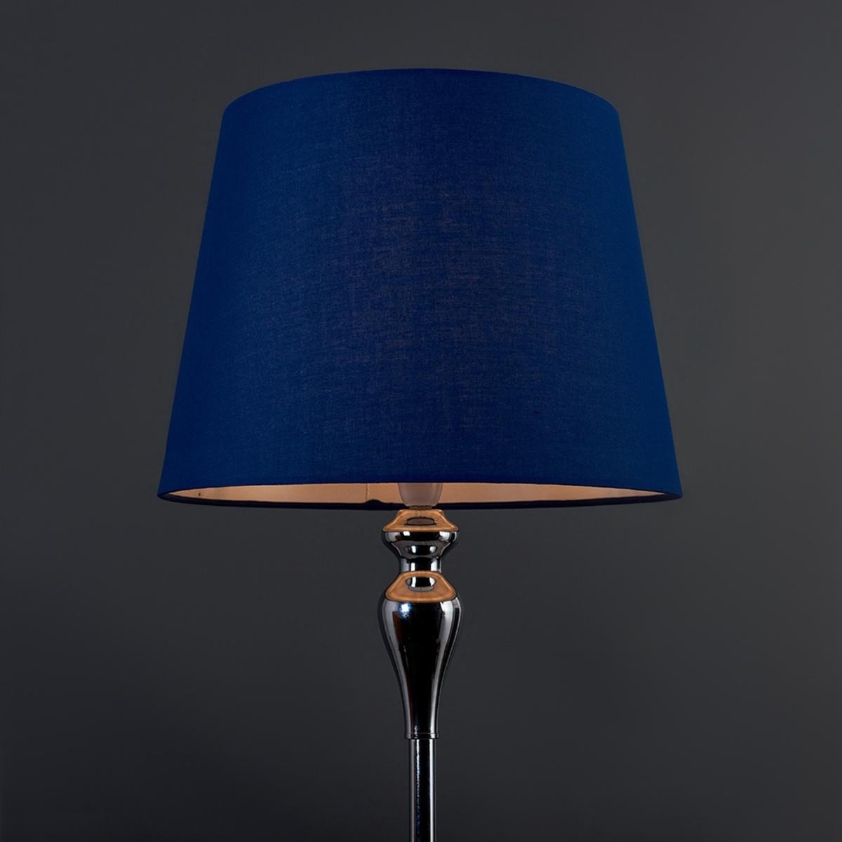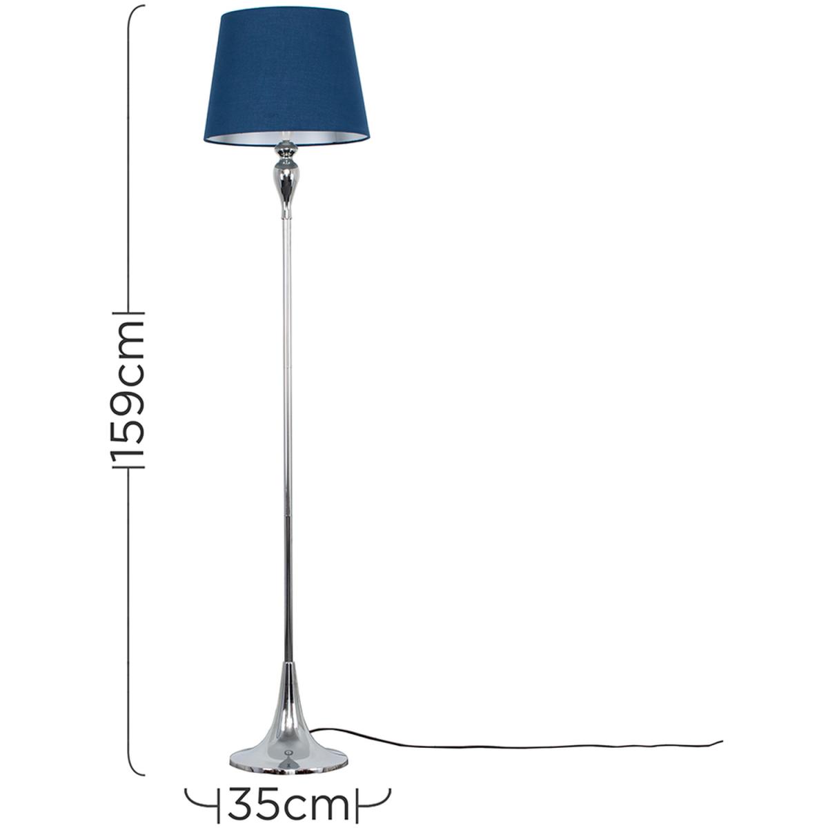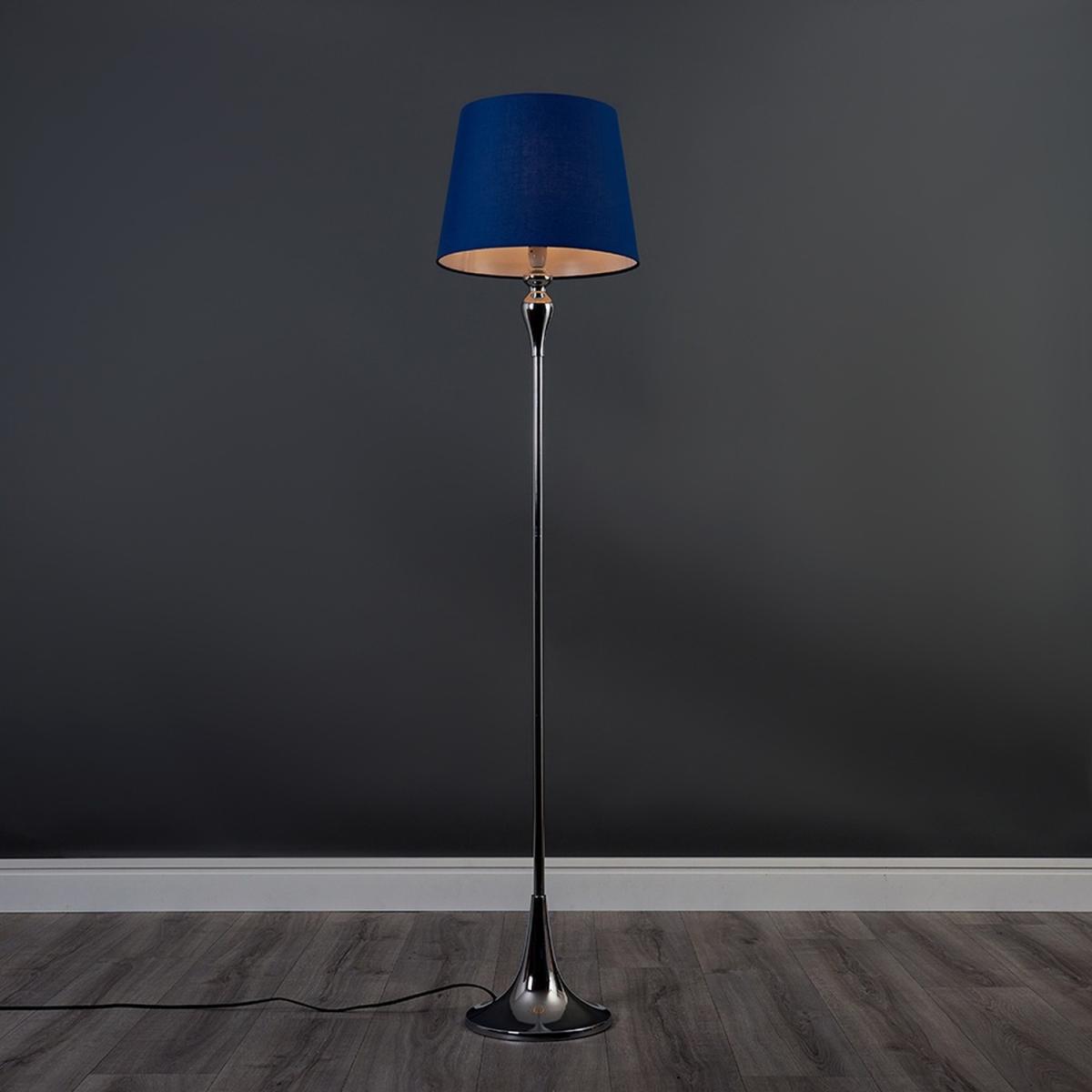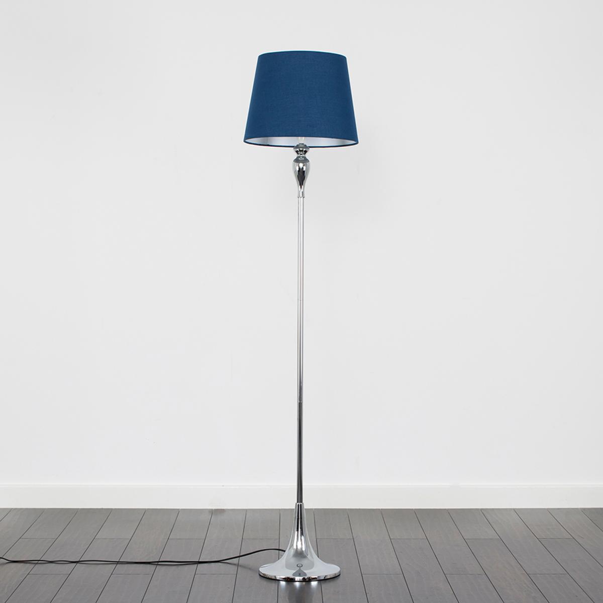 Modern spindle effect floor lamp in polished chrome finish. Complete with a navy blue fabric tapered lamp shade. This contemporary floor lamp is guaranteed to make a statement in any home. Features a switched lampholder. Floor lamps are a great way to bring additional lighting to a room - perfect for hallways, bedrooms, lounges, living rooms and offices.